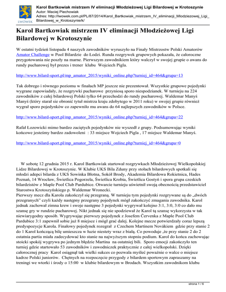 Karol Bartkowiak mistrzem IV eliminacji Młodzieżowej Ligi Bilardowej w Krotoszynie Autor: Maciej Piechowiak Adres: http://lwowek.com.pl/PL/87/2014/Karol_Bartkowiak_mistrzem_IV_eliminacji_Mlodziezowej_Ligi_ Bilardowej_w_Krotoszynie/k/ Karol Bartkowiak mistrzem IV eliminacji Młodzieżowej Ligi Bilardowej w Krotoszynie W ostatni tydzień listopada 4 naszych zawodników wyruszyło na Finały Mistrzostw Polski Amatorów Amator Challenge w Pool Bilardzie do Łodzi. Runda rozgrywek grupowych pokazała, że całoroczne przygotowania nie poszły na marne. Pierwszym zawodnikiem który walczył w swojej grupie o awans do rundy pucharowej był prezes i trener klubu Wojciech Pigla. http://www.bilard-sport.pl/mp_amator_2015/wyniki_online.php?turniej_id=464&grupa=13 Tak dobrego i równego poziomu w finałach MP jeszcze nie prezentował. Wszystkie grupowe pojedynki wygrane zapowiadały, że rozgrywki pucharowe przyniosą sporo niespodzianek. W turnieju na 224 zawodników z całej bilardowej Polski tylko 64 przechodzi do rundy pucharowej. Waldemar Manyś Manyś (który starał sie obronić tytuł mistrza kraju zdobytego w 2011 roku) w swojej grupie również wygrał sporo pojedynków co zapewniło mu awans do 64 najlepszych zawodników w Polsce. http://www.bilard-sport.pl/mp_amator_2015/wyniki_online.php?turniej_id=464&grupa=22 Rafał Łozowicki mimo bardzo zaciętych pojedynków nie wyszedł z grupy. Podsumowując wyniki końcowe jesteśmy bardzo zadowoleni : 33 miejsce Wojciech Pigla , 17 miejsce Waldemar Manyś. http://www.bilard-sport.pl/mp_amator_2015/wyniki_online.php?turniej_id=464&grupa=0 W sobotę 12 grudnia 2015 r. Karol Bartkowiak startował rozgrywkach Młodzieżowej Wielkopolskiej Lidze Bilardowej w Krotoszynie. W Klubie UKS Bila Zduny przy stołach bilardowych spotkali się młodzi adepci bilarda z UKS Sowinka Błotna, Sokół Brody, Akademia Bilardowa Rokietnica, Hades Poznań, 14 Wrocław, Świetlica Pogorzela, Świetlica Krobia, Świetlica Gostyń i spora grupa czeskich bilardzistów z Maple Pool Club Pardubice. Otwarcie turnieju uświetnił swoją obecnością przedstawiciel Starostwa Krotoszyńskiego p. Waldemar Wronecki. Pierwszy mecz dla Karola zakończył się przegraną. W turnieju tym pojedynki rozgrywane są do „dwóch przegranych” czyli każdy następny przegrany pojedynek mógł zakończyć zmagania zawodnika. Karol jednak zachował zimna krew i swoje następne 3 pojedynki wygrywał kolejno 3:1, 3:0, 3:0 co dało mu szansę gry w rundzie pucharowej. Nikt jednak się nie spodziewał że Karol tą szansę wykorzysta w tak niewiarygodny sposób. Wygrywając pierwszy pojedynek z Josefem Červenka z Maple Pool Club Pardubice 3:1 zapewnił sobie już 8 miejsce i mógł grać dalej. Kolejne mecze potwierdzały coraz lepszą predyspozycje Karola. Finałowy pojedynek rozegrał z Czechem Martinem Novákiem gdzie przy stanie 2 do 1 Karol kończącą bilę umieszcza w łuzie niestety wraz z białą. Co powoduje ,że przy stanie 2 do 2 ostatnia partia miała zadecydować kto stanie na najwyższym stopniu podium. Karol do końca zachowując stoicki spokój wygrywa po jednym błędzie Martina na ostatniej bili. Sporo emocji zakończyło ten turniej gdzie startowało 53 zawodników i zawodniczek praktycznie z całej wielkopolski. Dzięki całorocznej pracy Karol osiągnął tak wielki sukces co pozwala myśleć poważnie o walce o miejsce kadrze Polski juniorów. Chętnych na rozpoczęcie przygody z bilardem sportowym zapraszamy na treningi we wtorki i środy o 15:00 w klubie bilardowym w Brodach. Wszystkim zawodnikom klubu strona 1 / 6 Karol Bartkowiak mistrzem IV eliminacji Młodzieżowej Ligi Bilardowej w Krotoszynie Autor: Maciej Piechowiak Adres: http://lwowek.com.pl/PL/87/2014/Karol_Bartkowiak_mistrzem_IV_eliminacji_Mlodziezowej_Ligi_ Bilardowej_w_Krotoszynie/k/ życzymy dalszych sukcesów a Karolowi gratulujemy z osiągniętego sukcesu. Wojciech Pigla i Tobiasz Rafał z Metro Zamość - pojedynek grupowy strona 2 / 6 Karol Bartkowiak mistrzem IV eliminacji Młodzieżowej Ligi Bilardowej w Krotoszynie Autor: Maciej Piechowiak Adres: http://lwowek.com.pl/PL/87/2014/Karol_Bartkowiak_mistrzem_IV_eliminacji_Mlodziezowej_Ligi_ Bilardowej_w_Krotoszynie/k/ Waldemar Manyś przygotowuje się do pojedynku strona 3 / 6 Karol Bartkowiak mistrzem IV eliminacji Młodzieżowej Ligi Bilardowej w Krotoszynie Autor: Maciej Piechowiak Adres: http://lwowek.com.pl/PL/87/2014/Karol_Bartkowiak_mistrzem_IV_eliminacji_Mlodziezowej_Ligi_ Bilardowej_w_Krotoszynie/k/ Rafał, Wojciech i Waldemar uczestnicy Młodzieżowej Wielkopolskiej Ligi Bilardowej w Krotoszynie strona 4 / 6 Karol Bartkowiak mistrzem IV eliminacji Młodzieżowej Ligi Bilardowej w Krotoszynie Autor: Maciej Piechowiak Adres: http://lwowek.com.pl/PL/87/2014/Karol_Bartkowiak_mistrzem_IV_eliminacji_Mlodziezowej_Ligi_ Bilardowej_w_Krotoszynie/k/ Karol ustawia "do rozbicia" 9 bil strona 5 / 6 Karol Bartkowiak mistrzem IV eliminacji Młodzieżowej Ligi Bilardowej w Krotoszynie Autor: Maciej Piechowiak Adres: http://lwowek.com.pl/PL/87/2014/Karol_Bartkowiak_mistrzem_IV_eliminacji_Mlodziezowej_Ligi_ Bilardowej_w_Krotoszynie/k/ Finaliści od lewej dwa trzecie miejca : Josef Červenka, Krzysztof Kaczmarek, Karol Bartkowiak, Martin Novák strona 6 / 6 Powered by TCPDF (www.tcpdf.org)
