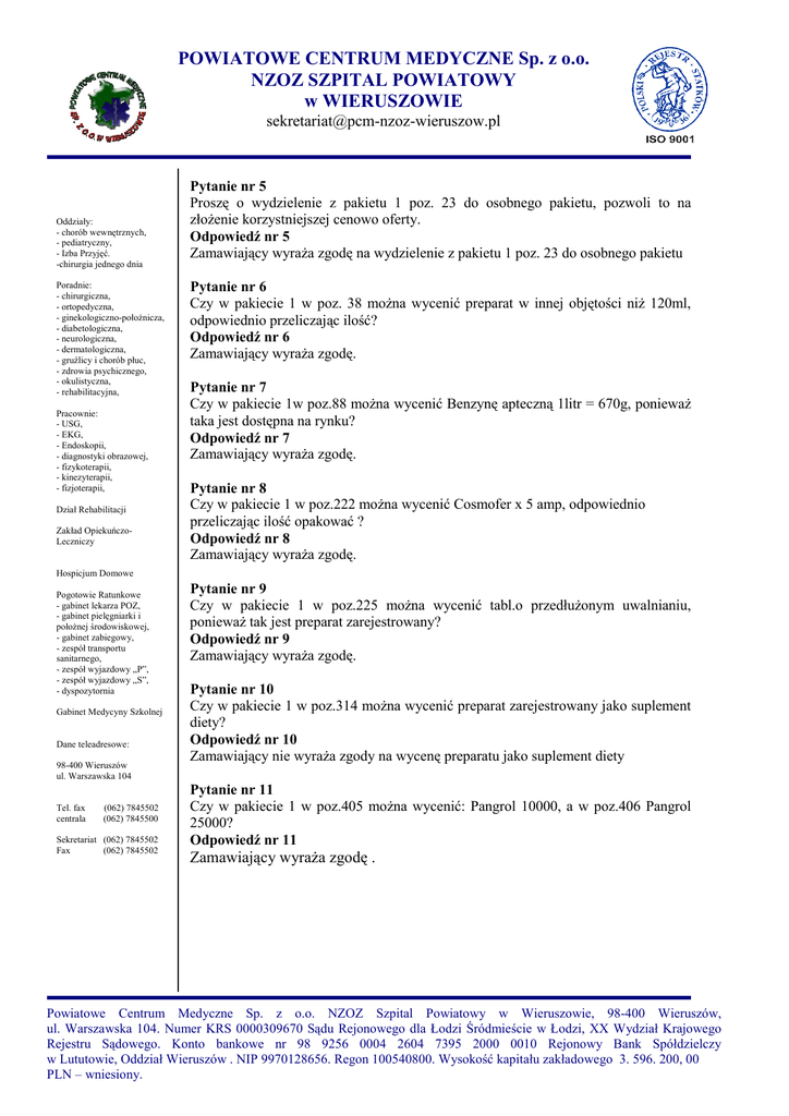 POWIATOWE CENTRUM MEDYCZNE Sp. z o.o. NZOZ SZPITAL POWIATOWY w WIERUSZOWIE [email protected] Oddziały: - chorób wewnętrznych, - pediatryczny, - Izba Przyjęć. -chirurgia jednego dnia Poradnie: - chirurgiczna, - ortopedyczna, - ginekologiczno-położnicza, - diabetologiczna, - neurologiczna, - dermatologiczna, - gruźlicy i chorób płuc, - zdrowia psychicznego, - okulistyczna, - rehabilitacyjna, Pracownie: - USG, - EKG, - Endoskopii, - diagnostyki obrazowej, - fizykoterapii, - kinezyterapii, - fizjoterapii, Dział Rehabilitacji Zakład OpiekuńczoLeczniczy Pytanie nr 5 Proszę o wydzielenie z pakietu 1 poz. 23 do osobnego pakietu, pozwoli to na złożenie korzystniejszej cenowo oferty. Odpowiedź nr 5 Zamawiający wyraża zgodę na wydzielenie z pakietu 1 poz. 23 do osobnego pakietu Pytanie nr 6 Czy w pakiecie 1 w poz. 38 można wycenić preparat w innej objętości niż 120ml, odpowiednio przeliczając ilość? Odpowiedź nr 6 Zamawiający wyraża zgodę. Pytanie nr 7 Czy w pakiecie 1w poz.88 można wycenić Benzynę apteczną 1litr = 670g, ponieważ taka jest dostępna na rynku? Odpowiedź nr 7 Zamawiający wyraża zgodę. Pytanie nr 8 Czy w pakiecie 1 w poz.222 można wycenić Cosmofer x 5 amp, odpowiednio przeliczając ilość opakować ? Odpowiedź nr 8 Zamawiający wyraża zgodę. Hospicjum Domowe Pogotowie Ratunkowe - gabinet lekarza POZ, - gabinet pielęgniarki i położnej środowiskowej, - gabinet zabiegowy, - zespół transportu sanitarnego, - zespół wyjazdowy „P”, - zespół wyjazdowy „S”, - dyspozytornia Gabinet Medycyny Szkolnej Dane teleadresowe: 98-400 Wieruszów ul. Warszawska 104 Tel. fax centrala (062) 7845502 (062) 7845500 Sekretariat (062) 7845502 Fax (062) 7845502 Pytanie nr 9 Czy w pakiecie 1 w poz.225 można wycenić tabl.o przedłużonym uwalnianiu, ponieważ tak jest preparat zarejestrowany? Odpowiedź nr 9 Zamawiający wyraża zgodę. Pytanie nr 10 Czy w pakiecie 1 w poz.314 można wycenić preparat zarejestrowany jako suplement diety? Odpowiedź nr 10 Zamawiający nie wyraża zgody na wycenę preparatu jako suplement diety Pytanie nr 11 Czy w pakiecie 1 w poz.405 można wycenić: Pangrol 10000, a w poz.406 Pangrol 25000? Odpowiedź nr 11 Zamawiający wyraża zgodę . Powiatowe Centrum Medyczne Sp. z o.o. NZOZ Szpital Powiatowy w Wieruszowie, 98-400 Wieruszów, ul. Warszawska 104. Numer KRS 0000309670 Sądu Rejonowego dla Łodzi Śródmieście w Łodzi, XX Wydział Krajowego Rejestru Sądowego. Konto bankowe nr 98 9256 0004 2604 7395 2000 0010 Rejonowy Bank Spółdzielczy w Lututowie, Oddział Wieruszów . NIP 9970128656. Regon 100540800. Wysokość kapitału zakładowego 3. 596. 200, 00 PLN – wniesiony.