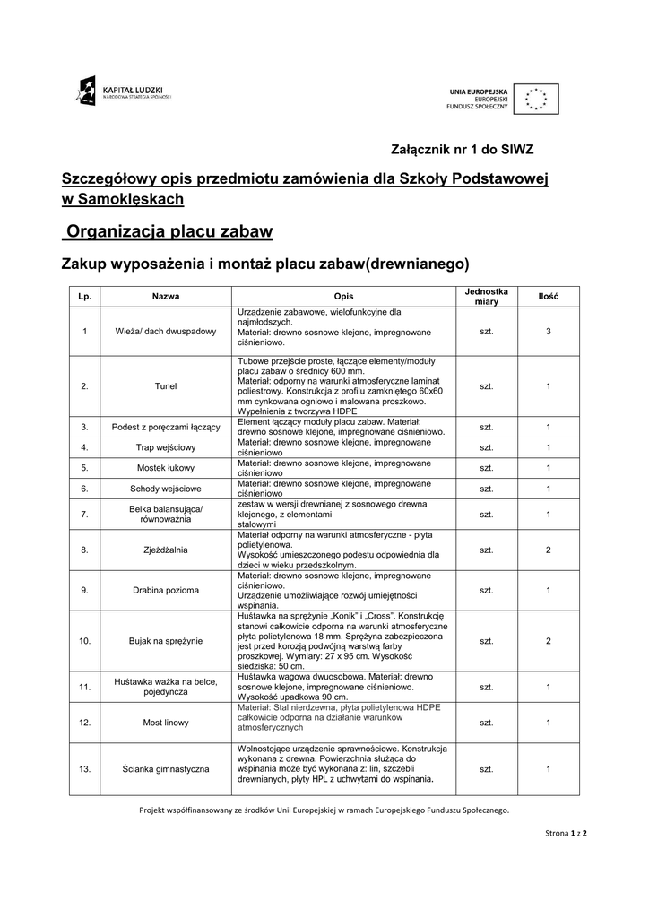 Załącznik nr 1 do SIWZ Szczegółowy opis przedmiotu zamówienia dla Szkoły Podstawowej w Samoklęskach Organizacja placu zabaw Zakup wyposażenia i montaż placu zabaw(drewnianego) Lp. 1 Nazwa Wieża/ dach dwuspadowy 2. Tunel 3. Podest z poręczami łączący 4. Trap wejściowy 5. Mostek łukowy 6. Schody wejściowe 7. Belka balansująca/ równoważnia 8. Zjeżdżalnia 9. Drabina pozioma 10. Bujak na sprężynie 11. Huśtawka ważka na belce, pojedyncza 12. Most linowy 13. Ścianka gimnastyczna Opis Urządzenie zabawowe, wielofunkcyjne dla najmłodszych. Materiał: drewno sosnowe klejone, impregnowane ciśnieniowo. Tubowe przejście proste, łączące elementy/moduły placu zabaw o średnicy 600 mm. Materiał: odporny na warunki atmosferyczne laminat poliestrowy. Konstrukcja z profilu zamkniętego 60x60 mm cynkowana ogniowo i malowana proszkowo. Wypełnienia z tworzywa HDPE Element łączący moduły placu zabaw. Materiał: drewno sosnowe klejone, impregnowane ciśnieniowo. Materiał: drewno sosnowe klejone, impregnowane ciśnieniowo Materiał: drewno sosnowe klejone, impregnowane ciśnieniowo Materiał: drewno sosnowe klejone, impregnowane ciśnieniowo zestaw w wersji drewnianej z sosnowego drewna klejonego, z elementami stalowymi Materiał odporny na warunki atmosferyczne - płyta polietylenowa. Wysokość umieszczonego podestu odpowiednia dla dzieci w wieku przedszkolnym. Materiał: drewno sosnowe klejone, impregnowane ciśnieniowo. Urządzenie umożliwiające rozwój umiejętności wspinania. Huśtawka na sprężynie „Konik” i „Cross”. Konstrukcję stanowi całkowicie odporna na warunki atmosferyczne płyta polietylenowa 18 mm. Sprężyna zabezpieczona jest przed korozją podwójną warstwą farby proszkowej. Wymiary: 27 x 95 cm. Wysokość siedziska: 50 cm. Huśtawka wagowa dwuosobowa. Materiał: drewno sosnowe klejone, impregnowane ciśnieniowo. Wysokość upadkowa 90 cm. Materiał: Stal nierdzewna, płyta polietylenowa HDPE całkowicie odporna na działanie warunków atmosferycznych Wolnostojące urządzenie sprawnościowe. Konstrukcja wykonana z drewna. Powierzchnia służąca do wspinania może być wykonana z: lin, szczebli drewnianych, płyty HPL z uchwytami do wspinania. Jednostka miary Ilość szt. 3 szt. 1 szt. 1 szt. 1 szt. 1 szt. 1 szt. 1 szt. 2 szt. 1 szt. 2 szt. 1 szt. 1 szt. 1 Projekt współfinansowany ze środków Unii Europejskiej w ramach Europejskiego Funduszu Społecznego. Strona 1 z 2 14. Wolnostojący domek z dwuspadowym dachem, wejściem i oknami. Wymiary: ok.1,55m x 1,5m x H1,65m Materiał: drewno sosnowe klejone, impregnowane ciśnieniowo, Domek dla dzieci Piaskownica z drewna sosnowego pokryta impregnatem zapewniającym trwałość w każdych warunkach pogodowych; wym. 2,4 x 2,4 m; pojemność 1,2 m3, Pokrywa dopasowana wymiarem do piaskownicy. 15. Piaskownica 16. Ławka bez oparcia Materiał: drewno sosnowe klejone, impregnowane ciśnieniowo. Możliwość korzystania z obu stron. szt. 1 szt. 1 szt. 1 Elementy placu zabaw dostosowane są dla dzieci w wieku przedszkolnym oraz są zgodne z PN EN 1176-1:2009 Cena placu zabaw zawiera: drewniane wyposażenie, montaż placu zabaw, ocynkowane kotwy, śruby zamknięte w plastikowych kapslach oraz transport elementów wyposażenia placu. Wykonanie bezpiecznej nawierzchni placu zabaw wraz z ogrodzeniem placu zabaw. Nazwa Opis Jednost ka miary Ilość Przygotowanie i wykonanie podłoża trawiastego Bezpieczna nawierzchnia- trawiasta Ogrodzenie placu zabaw m Długość ogrodzenia :67,28 mb Wysokość ogrodzenia: 150-156 cm Rodzaj ogrodzenia: panel powlekany, kolor niebieski Furtka: szerokość 1,5m, panel powlekany, kolor niebieski 2 m 293,94m 2 68,78 mb Projekt współfinansowany ze środków Unii Europejskiej w ramach Europejskiego Funduszu Społecznego. Strona 2 z 2