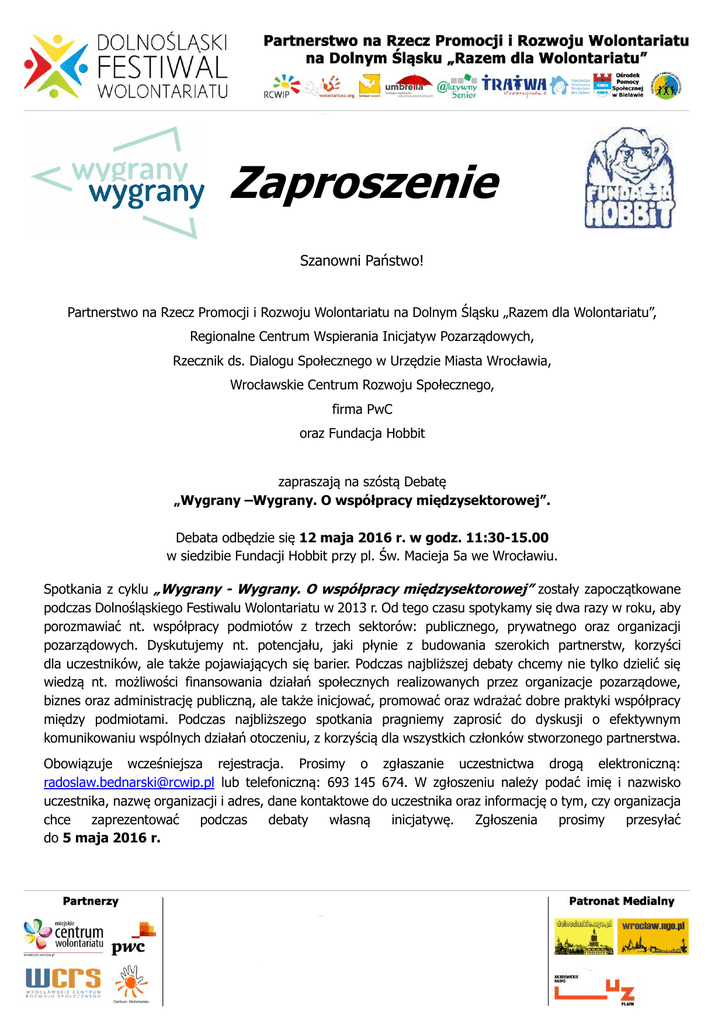Zaproszenie Szanowni Państwo! Partnerstwo na Rzecz Promocji i Rozwoju Wolontariatu na Dolnym Śląsku „Razem dla Wolontariatu”, Regionalne Centrum Wspierania Inicjatyw Pozarządowych, Rzecznik ds. Dialogu Społecznego w Urzędzie Miasta Wrocławia, Wrocławskie Centrum Rozwoju Społecznego, firma PwC oraz Fundacja Hobbit zapraszają na szóstą Debatę „Wygrany –Wygrany. O współpracy międzysektorowej”. Debata odbędzie się 12 maja 2016 r. w godz. 11:30-15.00 w siedzibie Fundacji Hobbit przy pl. Św. Macieja 5a we Wrocławiu. Spotkania z cyklu „Wygrany - Wygrany. O współpracy międzysektorowej” zostały zapoczątkowane podczas Dolnośląskiego Festiwalu Wolontariatu w 2013 r. Od tego czasu spotykamy się dwa razy w roku, aby porozmawiać nt. współpracy podmiotów z trzech sektorów: publicznego, prywatnego oraz organizacji pozarządowych. Dyskutujemy nt. potencjału, jaki płynie z budowania szerokich partnerstw, korzyści dla uczestników, ale także pojawiających się barier. Podczas najbliższej debaty chcemy nie tylko dzielić się wiedzą nt. możliwości finansowania działań społecznych realizowanych przez organizacje pozarządowe, biznes oraz administrację publiczną, ale także inicjować, promować oraz wdrażać dobre praktyki współpracy między podmiotami. Podczas najbliższego spotkania pragniemy zaprosić do dyskusji o efektywnym komunikowaniu wspólnych działań otoczeniu, z korzyścią dla wszystkich członków stworzonego partnerstwa. Obowiązuje wcześniejsza rejestracja. Prosimy o zgłaszanie uczestnictwa drogą elektroniczną: [email protected] lub telefoniczną: 693 145 674. W zgłoszeniu należy podać imię i nazwisko uczestnika, nazwę organizacji i adres, dane kontaktowe do uczestnika oraz informację o tym, czy organizacja chce zaprezentować podczas debaty własną inicjatywę. Zgłoszenia prosimy przesyłać do 5 maja 2016 r. Wstępna agenda spotkania: 11.30 – 12.00 Rejestracja gości i powitalny poczęstunek 12.00 – 12.10 Oficjalne powitanie oraz przedstawienie wszystkich uczestników Debaty 12.10 – 12.20 Fundacja Hobbit - prezentacja Gospodarza Debaty 12.20 – 12.30 Partnerstwo na rzecz Promocji i Rozwoju Wolontariatu na Dolnym Śląsku „Razem dla Wolontariatu”: Nowe działania – nowe możliwości. 12.30 – 13.00 Dyskusja nt. „Jeśli coś robisz, a o tym nie mówisz, to tak jakbyś nie robił – efektywne komunikowanie działań prospołecznych” Wiele organizacji tworzy partnerstwa na rzecz wspierania lokalnych społeczności, jednak informacja o tym dociera do niewielu. Jak komunikować wspólne inicjatywy z korzyścią dla wszystkich członków partnerstwa, aby przekaz nie został odebrany jak reklama, a wpłynął na pozytywne postrzeganie przez otoczenie? Chcemy zachęcić uczestników do dyskusji, podczas której wypracujemy kilka wskazówek dotyczących efektywnego komunikowania działań prospołecznych. Skupimy się przy tym na odbiorcach, kanałach oraz wiarygodności komunikacji. Moderatorem dyskusji będzie menedżer ds. marketingu PwC – Maciej Jesionowski. 13.00 – 13.30 Prezentacja zgłoszonych inicjatyw. Uczestnicy debaty będą mogli zaprezentować inicjatywy, pomysły, programy, które realizują w ramach swojej działalności i do których realizacji poszukują partnerów. Maksymalny czas prezentacji: 5 minut. Prezentacja powinna zawierać: przedstawienie obszaru działania organizacji, prezentacja planowanego projektu, oczekiwania odnośnie do współpracy, wspólne korzyści z nawiązania współpracy. Prosimy o przesłanie prezentacji inicjatyw do 9 maja 2016 r. 13.30 – 13.45 Przerwa kawowa 13.45 – 14.00 Prezentacja zgłoszonych inicjatyw c.d. 14.00 – 14.50 Rozmowy stolikowe (możliwość indywidualnej rozmowy z osobami prezentującymi inicjatywy oraz pozostałymi uczestnikami debaty) 14.50 – 15.00 Podsumowanie debaty i pożegnanie UWAGA! Liczba miejsc dla organizacji pozarządowych jest ograniczona. Organizacje zakwalifikowane do udziału w debacie zostaną o tym poinformowane telefonicznie i e-mailowo. UWAGA! Informujemy, że w rejonie pl. Św. Macieja występują trudności z parkowaniem samochodów. Prosimy uwzględnić dodatkowy czas na znalezienie miejsca parkingowego lub ewentualnie wybrać komunikację publiczną.