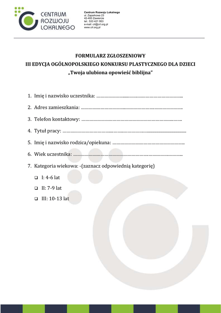 Centrum Rozwoju Lokalnego ul. Zaparkowa 23 42-400 Zawiercie tel.: 533 421 953 e-mail: [email protected] www.crl.org.pl FORMULARZ ZGŁOSZENIOWY III EDYCJA OGÓLNOPOLSKIEGO KONKURSU PLASTYCZNEGO DLA DZIECI „Twoja ulubiona opowieść biblijna” 1. Imię i nazwisko uczestnika: ………………….....…….…………………………….. 2. Adres zamieszkania: ……………………………..………………….…………………. 3. Telefon kontaktowy: ……………………………………………………………..……. 4. Tytuł pracy: ………………………………....……..…………….….................................... 5. Imię i nazwisko rodzica/opiekuna: ……………………………………………….. 6. Wiek uczestnika: ………………………………………………….…………….……….. 7. Kategoria wiekowa: -(zaznacz odpowiednią kategorię) I: 4-6 lat II: 7-9 lat III: 10-13 lat Centrum Rozwoju Lokalnego ul. Zaparkowa 23 42-400 Zawiercie tel.: 533 421 953 e-mail: [email protected] www.crl.org.pl Załącznik nr 1 do regulaminu konkursu plastycznego Oświadczenie o nieodpłatnym przeniesieniu majątkowych praw autorskich na Organizatora Konkursu oraz o zgodzie na przetwarzanie danych osobowych Jako opiekun prawny autora pracy konkursowej zatytułowanej: …………………………………… ………........................................................................................................................................................................................................., wykonanej przez ................................................................................................................... (imię i nazwisko uczestnika), zwanej dalej „utworem”, zgłoszonej do konkursu plastycznego „Twoja ulubiona opowieść biblijna”, oświadczam, że jestem uprawniony do przeniesienia majątkowych praw autorskich do utworu w zakresie wskazanym w niniejszym oświadczeniu. Jako opiekun prawny przenoszę nieodpłatnie (w momencie podpisania oświadczenia) na Organizatora konkursu - Centrum Rozwoju Lokalnego z siedzibą w Skałce, przy ul. Jesionowej 51, 42-421 Włodowice - autorskie prawa majątkowe do utworu w zakresie: a) utrwalania i zwielokrotniania utworu w części lub w całości, tj. wytwarzania egzemplarzy utworu bez względu na zastosowaną technikę (w tym technikę drukarską, reprograficzną, zapisu magnetycznego oraz cyfrową), liczbę i wielkość nakładu, b) obrotu oryginałem utworu albo jego egzemplarzami, tj. wprowadzania do obrotu, najmu, użyczenia oryginału lub jego egzemplarzy, publicznego udostępniania utworu, rozpowszechniania, wystawiania, wyświetlania również w formie cyfrowej lub drogą elektroniczną, wykorzystania utworu w części lub w całości w wydawnictwie książkowym, kalendarzu wielo- lub jednoplanszowym, publikacjach elektronicznych, c) praw pokrewnych z zastrzeżeniem obowiązku ujawnienia nazwiska autora, do czego Organizator jest upoważniony. Jako opiekun prawny autora utworu oświadczam, że utwór jest autorstwa mojego podopiecznego i że w związku z wykonaniem utworu i przeniesieniem majątkowych praw autorskich i praw zależnych na Organizatora konkursu nie naruszam w żaden sposób praw osób trzecich. Jako opiekun prawny autora utworu wyrażam zgodę na przetwarzanie danych osobowych mojego podopiecznego dla potrzeb niezbędnych do realizacji przedmiotowego konkursu w zakresie wyłonienia zwycięzcy i przyznania nagrody, zgodnie z ustawą z dnia 29 sierpnia 1997 roku o ochronie danych osobowych. …………………………….…...…………………………………………………. Data i czytelny podpis opiekuna prawnego autora utworu