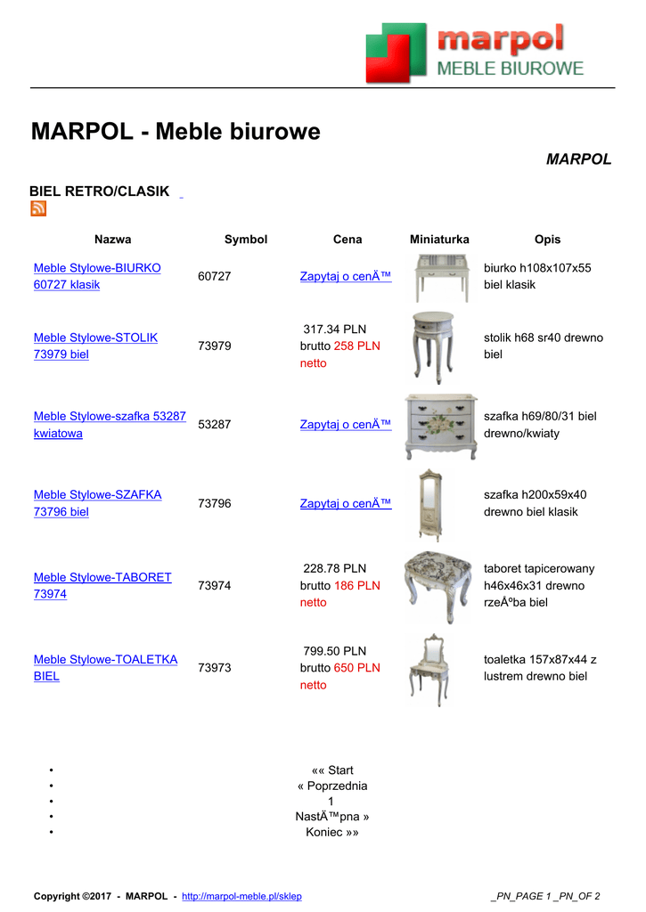 MARPOL - Meble biurowe MARPOL BIEL RETRO/CLASIK Nazwa Meble Stylowe-BIURKO 60727 klasik Symbol Cena Miniaturka Opis 60727 Zapytaj o cenÄ™ biurko h108x107x55 biel klasik 73979 317.34 PLN brutto 258 PLN netto stolik h68 sr40 drewno biel Meble Stylowe-szafka 53287 53287 kwiatowa Zapytaj o cenÄ™ szafka h69/80/31 biel drewno/kwiaty Meble Stylowe-SZAFKA 73796 biel 73796 Zapytaj o cenÄ™ szafka h200x59x40 drewno biel klasik 73974 228.78 PLN brutto 186 PLN netto taboret tapicerowany h46x46x31 drewno rzeźba biel 73973 799.50 PLN brutto 650 PLN netto toaletka 157x87x44 z lustrem drewno biel Meble Stylowe-STOLIK 73979 biel Meble Stylowe-TABORET 73974 Meble Stylowe-TOALETKA BIEL • • • • • «« Start « Poprzednia 1 NastÄ™pna » Koniec »» Copyright ©2017 - MARPOL - http://marpol-meble.pl/sklep _PN_PAGE 1 _PN_OF 2 Wyniki 1 - 6 z 6 Copyright ©2017 - MARPOL - http://marpol-meble.pl/sklep _PN_PAGE 2 _PN_OF 2