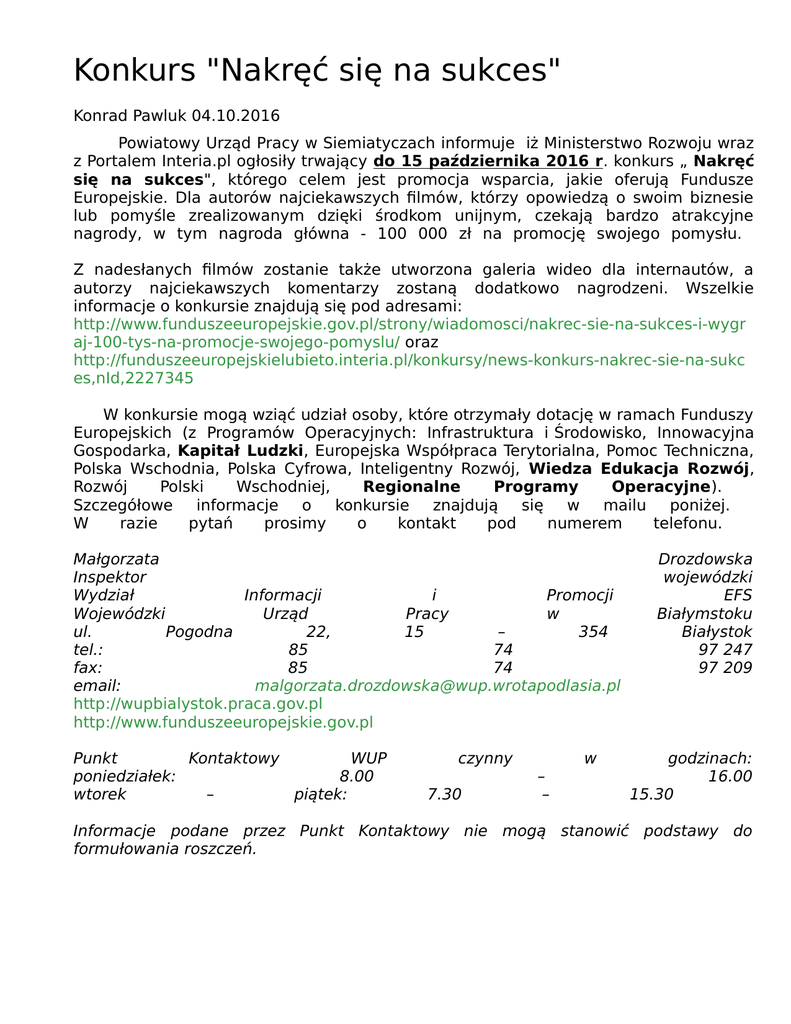 Konkurs "Nakręć się na sukces" Konrad Pawluk 04.10.2016 Powiatowy Urząd Pracy w Siemiatyczach informuje iż Ministerstwo Rozwoju wraz z Portalem Interia.pl ogłosiły trwający do 15 października 2016 r. konkurs „ Nakręć się na sukces", którego celem jest promocja wsparcia, jakie oferują Fundusze Europejskie. Dla autorów najciekawszych filmów, którzy opowiedzą o swoim biznesie lub pomyśle zrealizowanym dzięki środkom unijnym, czekają bardzo atrakcyjne nagrody, w tym nagroda główna - 100 000 zł na promocję swojego pomysłu. Z nadesłanych filmów zostanie także utworzona galeria wideo dla internautów, a autorzy najciekawszych komentarzy zostaną dodatkowo nagrodzeni. Wszelkie informacje o konkursie znajdują się pod adresami: http://www.funduszeeuropejskie.gov.pl/strony/wiadomosci/nakrec-sie-na-sukces-i-wygr aj-100-tys-na-promocje-swojego-pomyslu/ oraz http://funduszeeuropejskielubieto.interia.pl/konkursy/news-konkurs-nakrec-sie-na-sukc es,nId,2227345 W konkursie mogą wziąć udział osoby, które otrzymały dotację w ramach Funduszy Europejskich (z Programów Operacyjnych: Infrastruktura i Środowisko, Innowacyjna Gospodarka, Kapitał Ludzki, Europejska Współpraca Terytorialna, Pomoc Techniczna, Polska Wschodnia, Polska Cyfrowa, Inteligentny Rozwój, Wiedza Edukacja Rozwój, Rozwój Polski Wschodniej, Regionalne Programy Operacyjne). Szczegółowe informacje o konkursie znajdują się w mailu poniżej. W razie pytań prosimy o kontakt pod numerem telefonu. Małgorzata Inspektor Wydział Informacji i Promocji Wojewódzki Urząd Pracy w ul. Pogodna 22, 15 – 354 tel.: 85 74 fax: 85 74 email: [email protected] http://wupbialystok.praca.gov.pl http://www.funduszeeuropejskie.gov.pl Punkt Kontaktowy WUP poniedziałek: 8.00 wtorek – piątek: czynny 7.30 w – – Drozdowska wojewódzki EFS Białymstoku Białystok 97 247 97 209 godzinach: 16.00 15.30 Informacje podane przez Punkt Kontaktowy nie mogą stanowić podstawy do formułowania roszczeń.