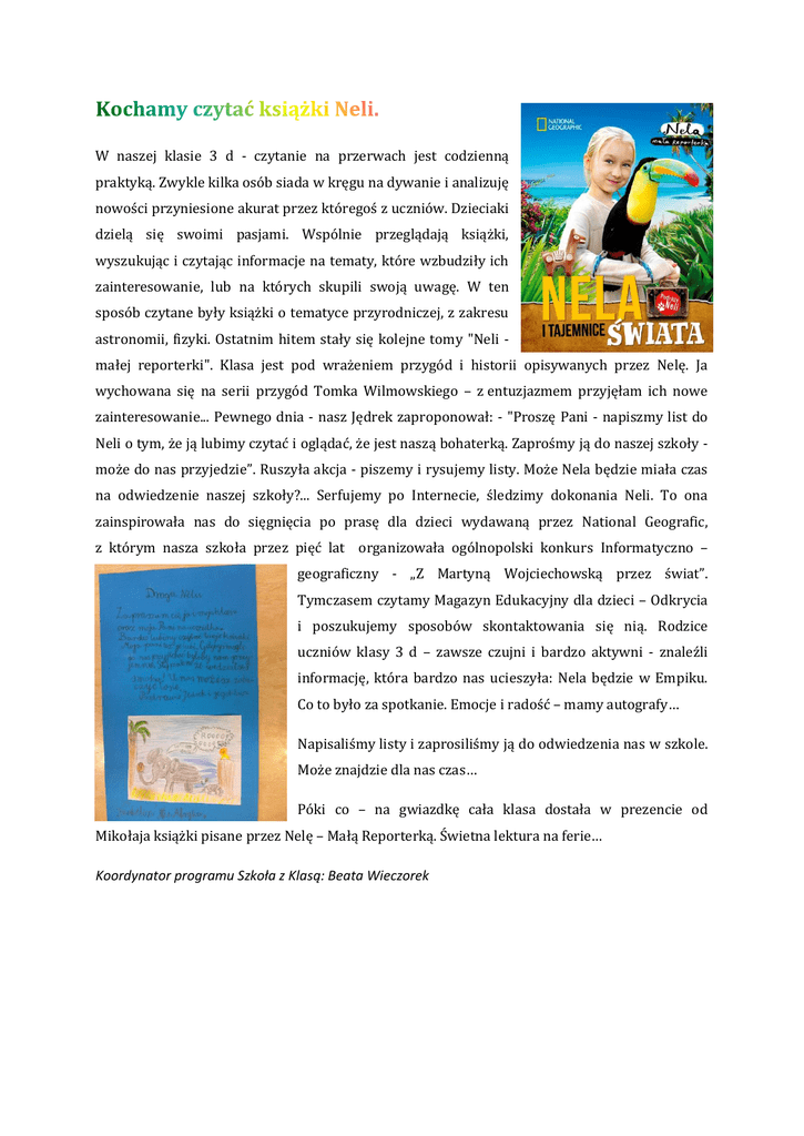 W naszej klasie 3 d - czytanie na przerwach jest codzienną praktyką. Zwykle kilka osób siada w kręgu na dywanie i analizuję nowości przyniesione akurat przez któregoś z uczniów. Dzieciaki dzielą się swoimi pasjami. Wspólnie przeglądają książki, wyszukując i czytając informacje na tematy, które wzbudziły ich zainteresowanie, lub na których skupili swoją uwagę. W ten sposób czytane były książki o tematyce przyrodniczej, z zakresu astronomii, fizyki. Ostatnim hitem stały się kolejne tomy "Neli małej reporterki". Klasa jest pod wrażeniem przygód i historii opisywanych przez Nelę. Ja wychowana się na serii przygód Tomka Wilmowskiego – z entuzjazmem przyjęłam ich nowe zainteresowanie... Pewnego dnia - nasz Jędrek zaproponował: - "Proszę Pani - napiszmy list do Neli o tym, że ją lubimy czytać i oglądać, że jest naszą bohaterką. Zaprośmy ją do naszej szkoły może do nas przyjedzie”. Ruszyła akcja - piszemy i rysujemy listy. Może Nela będzie miała czas na odwiedzenie naszej szkoły?... Serfujemy po Internecie, śledzimy dokonania Neli. To ona zainspirowała nas do sięgnięcia po prasę dla dzieci wydawaną przez National Geografic, z którym nasza szkoła przez pięć lat organizowała ogólnopolski konkurs Informatyczno – geograficzny - „Z Martyną Wojciechowską przez świat”. Tymczasem czytamy Magazyn Edukacyjny dla dzieci – Odkrycia i poszukujemy sposobów skontaktowania się nią. Rodzice uczniów klasy 3 d – zawsze czujni i bardzo aktywni - znaleźli informację, która bardzo nas ucieszyła: Nela będzie w Empiku. Co to było za spotkanie. Emocje i radość – mamy autografy… Napisaliśmy listy i zaprosiliśmy ją do odwiedzenia nas w szkole. Może znajdzie dla nas czas… Póki co – na gwiazdkę cała klasa dostała w prezencie od Mikołaja książki pisane przez Nelę – Małą Reporterką. Świetna lektura na ferie… Koordynator programu Szkoła z Klasą: Beata Wieczorek