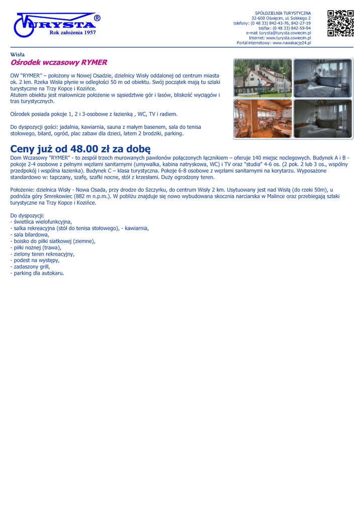 SPÓŁDZIELNIA TURYSTYCZNA 32-600 Oświęcim, ul. Solskiego 2 telefony: (0 48 33) 842-43-76, 842-27-19 tel/fax: (0 48 33) 842-59-94 e-mail: [email protected] Internet: www.turysta.oswiecim.pl Portal internetowy: www.nawakacje24.pl Ośrodek wczasowy RYMER OW ‘‘RYMER’’ – położony w Nowej Osadzie, dzielnicy Wisły oddalonej od centrum miasta ok. 2 km. Rzeka Wisła płynie w odległości 50 m od obiektu. Swój początek mają tu szlaki turystyczne na Trzy Kopce i Kozińce. Atutem obiektu jest malownicze położenie w sąsiedztwie gór i lasów, bliskość wyciągów i tras turystycznych. Ośrodek posiada pokoje 1, 2 i 3-osobowe z łazienką , WC, TV i radiem. Do dyspozycji gości: jadalnia, kawiarnia, sauna z małym basenem, sala do tenisa stołowego, bilard, ogród, plac zabaw dla dzieci, latem 2 brodziki, parking. Ceny już od 48.00 zł za dobę Dom Wczasowy "RYMER" - to zespół trzech murowanych pawilonów połączonych łącznikiem – oferuje 140 miejsc noclegowych. Budynek A i B pokoje 2-4 osobowe z pełnymi węzłami sanitarnymi (umywalka, kabina natryskowa, WC) i TV oraz "studia" 4-6 os. (2 pok. 2 lub 3 os., wspólny przedpokój i wspólna łazienka). Budynek C – klasa turystyczna. Pokoje 6-8 osobowe z węzłami sanitarnymi na korytarzu. Wyposażone standardowo w: tapczany, szafę, szafki nocne, stół z krzesłami. Duży ogrodzony teren. Położenie: dzielnica Wisły - Nowa Osada, przy drodze do Szczyrku, do centrum Wisły 2 km. Usytuowany jest nad Wisłą (do rzeki 50m), u podnóża góry Smrekowiec (882 m n.p.m.). W pobliżu znajduje się nowo wybudowana skocznia narciarska w Malince oraz przebiegają szlaki turystyczne na Trzy Kopce i Kozińce. Do dyspozycji: - świetlica wielofunkcyjna, - salka rekreacyjna (stół do tenisa stołowego), - kawiarnia, - sala bilardowa, - boisko do piłki siatkowej (ziemne), - piłki nożnej (trawa), - zielony teren rekreacyjny, - podest na występy, - zadaszony grill, - parking dla autokaru.