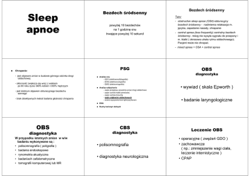 Sleep apnoe Bezdech śródsenny Bezdech śródsenny Typy: powyżej 10 bezdechów na 1 godzinę snu trwające powyżej 10 sekund - obstructive sleep apnoe (OSA)-obturacyjny bezdech śródsenny - nadmierna relaksacja m. języka, zapadanie nasady, chrapanie - central apnea (less frequently) centralny bezdech śródsenny– mózg nie wysyła sygnału do przepony i m. klatki ( okresowa utrata rytmu oddechowego). Pacjent może nie chrapać. - mixed apnea = OSA + central apnea PSG Chrapanie: - jest objawem zmian w budowie górnego odcinka drogi oddechowej - skłonność zwiększa się wraz z wiekiem po 60 roku życia ≈40% kobiet i ≈ 60% mężczyzn - jest istotnym objawem obturacyjnego bezdechu sennego - brak obiektywnych metod badania głośności chrapania OBS diagnostyka Analiza snu - EEG (elektroencefalografia) - EOG (elektrooculografia) - EMG (elektromiografia) Analiza oddychania - zapis przepływu powietrza przez drogi oddechowe - zapis ruchów klatki piersiowej - zapis ruchów brzucha - zapis odgłosów oddechowych - ocena wysycenia krwi tętniczej tlenem • wywiad ( skala Epworth ) • badanie laryngologiczne EKG Ruchy kończyn dolnych OBS CBS diagnostyka diagnostyka W przypadku istotnych zmian w w/w badaniu wykonywane są : • polisomnografia ( poligrafia ) • badania endoskopowe • rynometria akustyczna • badaniach cefalometryczne • tomografii komputerowej lub MR • polisomnografia • diagnostyka neurologiczna Leczenie OBS • operacyjne ( zwężeń GDO ) • zachowawcze ( np.: zmniejszenie wagi ciała, leczenie internistyczne ) • CPAP Leczenie OBS • neurologiczne • CPAP