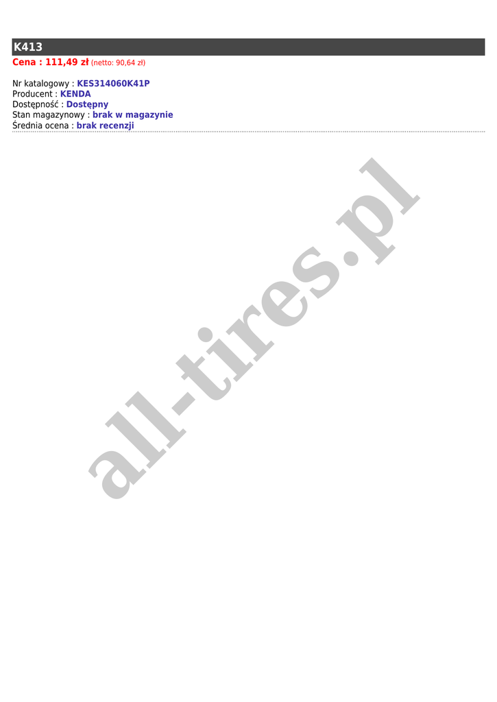 K413 Cena : 111,49 zł (netto: 90,64 zł) al lti re s. pl Nr katalogowy : KES314060K41P Producent : KENDA Dostępność : Dostępny Stan magazynowy : brak w magazynie Średnia ocena : brak recenzji