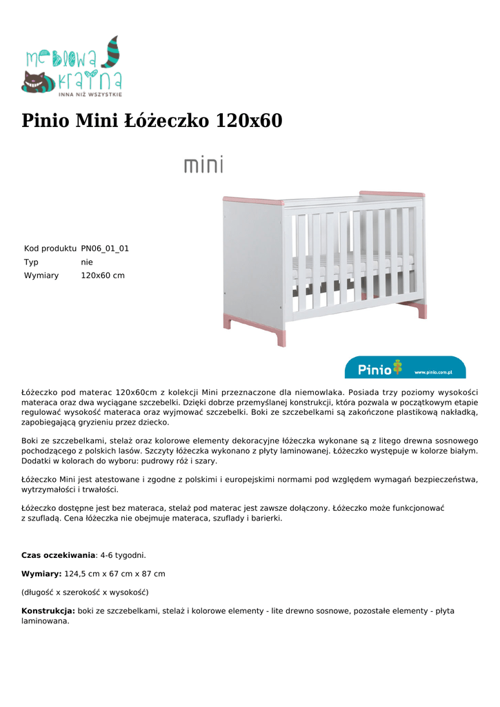 Pinio Mini Łóżeczko 120x60 Kod produktu PN06_01_01 Typ nie Wymiary 120x60 cm Łóżeczko pod materac 120x60cm z kolekcji Mini przeznaczone dla niemowlaka. Posiada trzy poziomy wysokości materaca oraz dwa wyciągane szczebelki. Dzięki dobrze przemyślanej konstrukcji, która pozwala w początkowym etapie regulować wysokość materaca oraz wyjmować szczebelki. Boki ze szczebelkami są zakończone plastikową nakładką, zapobiegającą gryzieniu przez dziecko. Boki ze szczebelkami, stelaż oraz kolorowe elementy dekoracyjne łóżeczka wykonane są z litego drewna sosnowego pochodzącego z polskich lasów. Szczyty łóżeczka wykonano z płyty laminowanej. Łóżeczko występuje w kolorze białym. Dodatki w kolorach do wyboru: pudrowy róż i szary. Łóżeczko Mini jest atestowane i zgodne z polskimi i europejskimi normami pod względem wymagań bezpieczeństwa, wytrzymałości i trwałości. Łóżeczko dostępne jest bez materaca, stelaż pod materac jest zawsze dołączony. Łóżeczko może funkcjonować z szufladą. Cena łóżeczka nie obejmuje materaca, szuflady i barierki. Czas oczekiwania: 4-6 tygodni. Wymiary: 124,5 cm x 67 cm x 87 cm (długość x szerokość x wysokość) Konstrukcja: boki ze szczebelkami, stelaż i kolorowe elementy - lite drewno sosnowe, pozostałe elementy - płyta laminowana. Kolorystyka: biały+szary, biały+różowy. Gwarancja: 24 miesiące. Mebel do samodzielnego montażu.