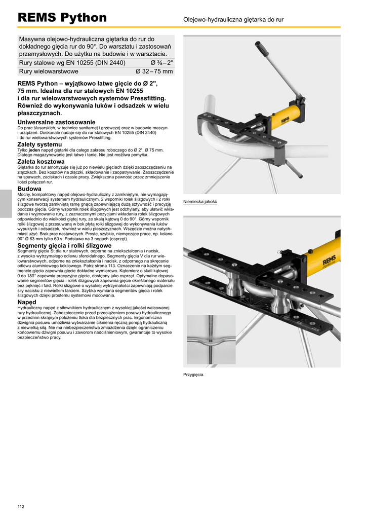 REMS Python Olejowo-hydrauliczna giętarka do rur Masywna olejowo-hydrauliczna giętarka do rur do dokładnego gięcia rur do 90°. Do warsztatu i zastosowań przemysłowych. Do użytku na budowie i w warsztacie. Rury stalowe wg EN 10255 (DIN 2440) Ø ⅜ – 2" Rury wielowarstwowe Ø 32 – 75 mm REMS Python – wyjątkowo łatwe gięcie do Ø 2", 75 mm. Idealna dla rur stalowych EN 10255 i dla rur wielowarstwowych systemów Pressfitting. Również do wykonywania łuków i odsadzek w wielu płaszczyznach. Uniwersalne zastosowanie Do prac ślusarskich, w technice sanitarnej i grzewczej oraz w budowie maszyn i urządzeń. Doskonale nadaje się do rur stalowych EN 10255 (DIN 2440) i do rur wielowarstwowych systemów Pressfitting. Zalety systemu Tylko jeden napęd giętarki dla całego zakresu roboczego do Ø 2", Ø 75 mm. Dlatego magazynowanie jest łatwe i tanie. Nie jest możliwa pomyłka. Zaleta kosztowa Giętarka do rur amortyzuje się już po niewielu gięciach dzięki zaoszczędzeniu na złączkach. Bez kosztów na złączki, składowanie i zaopatrywanie. Zaoszczędzenie na spawach, zaciskach i czasie pracy. Zwiększona pewność przez zmniejszenie ilości połączeń rur. Budowa Mocny, kompaktowy napęd olejowo-hydrauliczny z zamkniętym, nie wymagającym konserwacji systemem hydraulicznym. 2 wsporniki rolek ślizgowych i 2 rolki ślizgowe tworzą zamkniętą ramę gnącą zapewniającą dużą sztywność i precyzję podczas gięcia. Górny wspornik rolek ślizgowych jest odchylany, aby ułatwić wkładanie i wyjmowanie rury, z zaznaczonymi pozycjami wkładania rolek ślizgowych odpowiednio do wielkości giętej rury, ze skalą kątową 0 do 90°. Górny wspornik rolki ślizgowej z przesuwaną w bok płytą rolki ślizgowej do wykonywania łuków wypukłych i odsadzek, również w wielu płaszczyznach. Wszędzie można natychmiast użyć. Brak prac nastawczych. Proste, szybkie, niemęczące prace, np. kolano 90° Ø 63 mm tylko 60 s. Podstawa na 3 nogach (osprzęt). Niemiecka jakość Segmenty gięcia i rolki ślizgowe Segmenty gięcia St dla rur stalowych, odporne na zniekształcenia i nacisk, z wysoko wytrzymałego odlewu sferoidalnego. Segmenty gięcia V dla rur wielowarstwowych, odporne na zniekształcenia i nacisk, z odpornego na skręcanie odlewu aluminiowego kokilowego. Patrz strona 113. Oznaczenie na każdym segmencie gięcia zapewnia gięcie dokładne wymiarowo. Kątomierz o skali kątowej 0 do 180° zapewnia precyzyjne gięcie, dostępny jako osprzęt. Optymalne dopasowanie segmentów gięcia i rolek ślizgowych zapewnia gięcie określonego materiału bez pęknięć i fałd. Rolki ślizgowe o wysokiej wytrzymałości zapewniają podparcie siły nacisku z niewielkim tarciem. Szybka wymiana segmentów gięcia i rolek ślizgowych dzięki prostemu systemowi mocowania. Napęd Hydrauliczny napęd z siłownikiem hydraulicznym z wysokiej jakości walcowanej rury hydraulicznej. Zabezpieczenie przed przeciążeniem posuwu hydraulicznego w przednim skrajnym położeniu tłoka dla bezpiecznych prac. Ergonomiczna dźwignia posuwu umożliwia wytwarzanie ciśnienia ręczną pompą hydrauliczną z niewielką siłą. Nie ma niebezpieczeństwa zmiażdżenia dzięki ograniczeniu końcowemu dźwigni posuwu i zaworom nadciśnieniowym, gwarantuje to wysokie bezpieczeństwo pracy. Przygięcia. 112 REMS Python Olejowo-hydrauliczna giętarka do rur Odsadzki w wielu płaszczyznach. Zakres dostawy Zestaw REMS Python. Olejowo-hydrauliczna giętarka do rur do dokładnego gięcia rur do 90°. Rury stalowe EN 10255 Ø ⅜ – 2", rury wielowarstwowe Ø 32 – 75 mm. Napęd ze wspornikami rolek ślizgowych, górny wspornik rolki ślizgowej z przesuwaną w bok płytą rolki ślizgowej, 2 rolki ślizgowe, segmenty gnące St lub V. W stabilnej skrzynce transportowej. Wyszczególnienie Nr art. Set St ⅜ - ½ - ¾ - 1 - 1¼" 590020 Set St ½ - ¾ - 1 - 1¼ - 1½ - 2" 590021 Set V 40 - 50 - 63 mm 590022 R R R Osprzęt Promień gięcia1) mm St ⅜" St ½" St ¾" St 1" St 1¼" St 1½" St 2" V 32 mm V 40 mm V 50 mm V 63 mm V 75 mm 50 65 85 100 150 170 220 112 140 175 220 260 Promień gięcia2) mm 128 160 200 252 298 Nr art. 590000 590111 590150 590160 590153 R R R R R V Segment gnący do rur Ø mm/cal St 10255 Wyszczególnienie Napęd ze wspornikami rolek ślizgowych i rolkami ślizgowymi Ślizgacz Ø 75 mm, 2 szt. Podstawa na 3 nogach Skrzynka transportowa z praktycznymi uchwytami do noszenia Kątomierz do precyzyjnego gięcia Właściwy do p 590051 590052 590053 590054 590055 590056 590057 590061 590058 590059 590060 590062 R R R R R R R R R R R R St 10255: Rury stalowe (do gwintowania) wg EN 10255 (DIN 2440) V: Rury wielowarstwowe systemu Pressfitting p Wymagane 2 sztuki ślizgacza Ø 75 mm (Nr art. 590111) 1) Promień gięcia mm po stronie wewnętrznej łuku (EN 10255) 2) Promień gięcia mm w osi neutralnej łuku (DVGW VP 632) 113