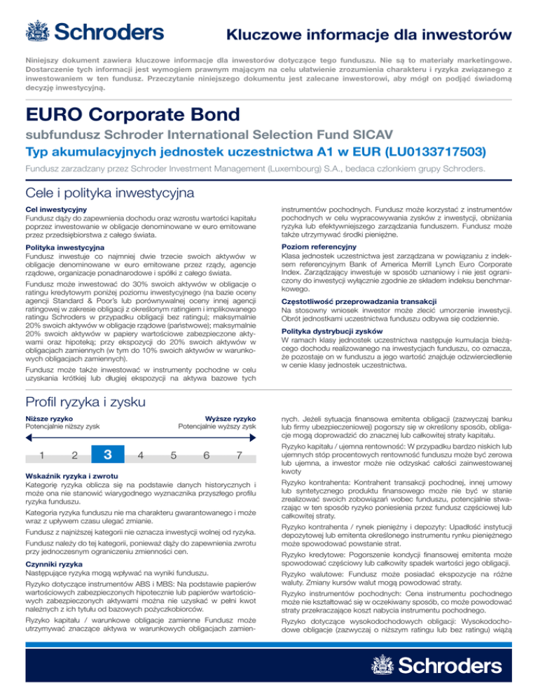 Kluczowe informacje dla inwestorów Niniejszy dokument zawiera kluczowe informacje dla inwestorów dotyczące tego funduszu. Nie są to materiały marketingowe. Dostarczenie tych informacji jest wymogiem prawnym mającym na celu ułatwienie zrozumienia charakteru i ryzyka związanego z inwestowaniem w ten fundusz. Przeczytanie niniejszego dokumentu jest zalecane inwestorowi, aby mógł on podjąć świadomą decyzję inwestycyjną. EURO Corporate Bond subfundusz Schroder International Selection Fund SICAV Typ akumulacyjnych jednostek uczestnictwa A1 w EUR (LU0133717503) Fundusz zarzadzany przez Schroder Investment Management (Luxembourg) S.A., bedaca czlonkiem grupy Schroders. Cele i polityka inwestycyjna Cel inwestycyjny Fundusz dąży do zapewnienia dochodu oraz wzrostu wartości kapitału poprzez inwestowanie w obligacje denominowane w euro emitowane przez przedsiębiorstwa z całego świata. instrumentów pochodnych. Fundusz może korzystać z instrumentów pochodnych w celu wypracowywania zysków z inwestycji, obniżania ryzyka lub efektywniejszego zarządzania funduszem. Fundusz może także utrzymywać środki pieniężne. Polityka inwestycyjna Fundusz inwestuje co najmniej dwie trzecie swoich aktywów w obligacje denominowane w euro emitowane przez rządy, agencje rządowe, organizacje ponadnarodowe i spółki z całego świata. Poziom referencyjny Klasa jednostek uczestnictwa jest zarządzana w powiązaniu z indeksem referencyjnym Bank of America Merrill Lynch Euro Corporate Index. Zarządzający inwestuje w sposób uznaniowy i nie jest ograniczony do inwestycji wyłącznie zgodnie ze składem indeksu benchmarkowego. Fundusz może inwestować do 30% swoich aktywów w obligacje o ratingu kredytowym poniżej poziomu inwestycyjnego (na bazie oceny agencji Standard & Poor’s lub porównywalnej oceny innej agencji ratingowej w zakresie obligacji z określonym ratingiem i implikowanego ratingu Schroders w przypadku obligacji bez ratingu); maksymalnie 20% swoich aktywów w obligacje rządowe (państwowe); maksymalnie 20% swoich aktywów w papiery wartościowe zabezpieczone aktywami oraz hipoteką; przy ekspozycji do 20% swoich aktywów w obligacjach zamiennych (w tym do 10% swoich aktywów w warunkowych obligacjach zamiennych). Fundusz może także inwestować w instrumenty pochodne w celu uzyskania krótkiej lub długiej ekspozycji na aktywa bazowe tych Częstotliwość przeprowadzania transakcji Na stosowny wniosek inwestor może zlecić umorzenie inwestycji. Obrót jednostkami uczestnictwa funduszu odbywa się codziennie. Polityka dystrybucji zysków W ramach klasy jednostek uczestnictwa następuje kumulacja bieżącego dochodu realizowanego na inwestycjach funduszu, co oznacza, że pozostaje on w funduszu a jego wartość znajduje odzwierciedlenie w cenie klasy jednostek uczestnictwa. Profil ryzyka i zysku Niższe ryzyko Potencjalnie niższy zysk 1 2 Wyższe ryzyko Potencjalnie wyższy zysk 3 4 5 6 7 Wskaźnik ryzyka i zwrotu Kategorię ryzyka oblicza się na podstawie danych historycznych i może ona nie stanowić wiarygodnego wyznacznika przyszłego profilu ryzyka funduszu. Kategoria ryzyka funduszu nie ma charakteru gwarantowanego i może wraz z upływem czasu ulegać zmianie. Fundusz z najniższej kategorii nie oznacza inwestycji wolnej od ryzyka. Fundusz należy do tej kategorii, ponieważ dąży do zapewnienia zwrotu przy jednoczesnym ograniczeniu zmienności cen. Czynniki ryzyka Następujące ryzyka mogą wpływać na wyniki funduszu. Ryzyko dotyczące instrumentów ABS i MBS: Na podstawie papierów wartościowych zabezpieczonych hipotecznie lub papierów wartościowych zabezpieczonych aktywami można nie uzyskać w pełni kwot należnych z ich tytułu od bazowych pożyczkobiorców. Ryzyko kapitału / warunkowe obligacje zamienne Fundusz może utrzymywać znaczące aktywa w warunkowych obligacjach zamien- nych. Jeżeli sytuacja finansowa emitenta obligacji (zazwyczaj banku lub firmy ubezpieczeniowej) pogorszy się w określony sposób, obligacje mogą doprowadzić do znacznej lub całkowitej straty kapitału. Ryzyko kapitału / ujemna rentowność: W przypadku bardzo niskich lub ujemnych stóp procentowych rentowność funduszu może być zerowa lub ujemna, a inwestor może nie odzyskać całości zainwestowanej kwoty Ryzyko kontrahenta: Kontrahent transakcji pochodnej, innej umowy lub syntetycznego produktu finansowego może nie być w stanie zrealizować swoich zobowiązań wobec funduszu, potencjalnie stwarzając w ten sposób ryzyko poniesienia przez fundusz częściowej lub całkowitej straty. Ryzyko kontrahenta / rynek pieniężny i depozyty: Upadłość instytucji depozytowej lub emitenta określonego instrumentu rynku pieniężnego może spowodować powstanie strat. Ryzyko kredytowe: Pogorszenie kondycji finansowej emitenta może spowodować częściowy lub całkowity spadek wartości jego obligacji. Ryzyko walutowe: Fundusz może posiadać ekspozycje na różne waluty. Zmiany kursów walut mogą powodować straty. Ryzyko instrumentów pochodnych: Cena instrumentu pochodnego może nie kształtować się w oczekiwany sposób, co może powodować straty przekraczające koszt nabycia instrumentu pochodnego. Ryzyko dotyczące wysokodochodowych obligacji: Wysokodochodowe obligacje (zazwyczaj o niższym ratingu lub bez ratingu) wiążą Schroder International Selection Fund SICAV EURO Corporate Bond się zasadniczo z wyższym ryzykiem rynkowym, kredytowym oraz ryzykiem płynności. Ryzyko stopy procentowej: Wzrost stóp procentowych powoduje zazwyczaj spadek cen obligacji. Ryzyko dźwigni finansowej: Fundusz wykorzystuje instrumenty pochodne bazujące na dźwigni finansowej, co zwiększa jego podatność na określone zmiany rynkowe lub zmiany stóp procentowych i może wpływać na ponadprzeciętną zmienność oraz ryzyko zanotowania straty. Ryzyko płynności: W trudnych warunkach rynkowych fundusz może nie być w stanie dokonać sprzedaży papierów wartościowych w 