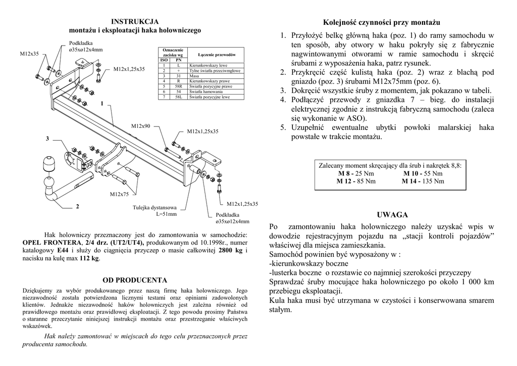 INSTRUKCJA montaŜu i eksploatacji haka holowniczego Podkładka ø35xø12x4mm M12x35 M12x1,25x35 Oznaczenie zacisku wg ISO PN 1 L 2 + 3 31 4 R 5 58R 6 54 7 58L Kolejność czynności przy montaŜu Łączenie przewodów Kierunkowskazy lewe Tylne światła przeciwmgłowe Masa Kierunkowskazy prawe Światła pozycyjne prawe Światła hamowania Światła pozycyjne lewe 1 M12x90 M12x1,25x35 3 1. PrzyłoŜyć belkę główną haka (poz. 1) do ramy samochodu w ten sposób, aby otwory w haku pokryły się z fabrycznie nagwintowanymi otworami w ramie samochodu i skręcić śrubami z wyposaŜenia haka, patrz rysunek. 2. Przykręcić część kulistą haka (poz. 2) wraz z blachą pod gniazdo (poz. 3) śrubami M12x75mm (poz. 6). 3. Dokręcić wszystkie śruby z momentem, jak pokazano w tabeli. 4. Podłączyć przewody z gniazdka 7 – bieg. do instalacji elektrycznej zgodnie z instrukcją fabryczną samochodu (zaleca się wykonanie w ASO). 5. Uzupełnić ewentualne ubytki powłoki malarskiej haka powstałe w trakcie montaŜu. Zalecany moment skręcający dla śrub i nakrętek 8,8: M 8 - 25 Nm M 10 - 55 Nm M 12 - 85 Nm M 14 - 135 Nm M12x75 2 Tulejka dystansowa L=51mm M12x1,25x35 Podkładka ø35xø12x4mm Hak holowniczy przeznaczony jest do zamontowania w samochodzie: OPEL FRONTERA, 2/4 drz. (UT2/UT4), produkowanym od 10.1998r., numer katalogowy E44 i słuŜy do ciągnięcia przyczep o masie całkowitej 2800 kg i nacisku na kulę max 112 kg. OD PRODUCENTA Dziękujemy za wybór produkowanego przez naszą firmę haka holowniczego. Jego niezawodność została potwierdzona licznymi testami oraz opiniami zadowolonych klientów. JednakŜe niezawodność haków holowniczych jest zaleŜna równieŜ od prawidłowego montaŜu oraz prawidłowej eksploatacji. Z tego powodu prosimy Państwa o staranne przeczytanie niniejszej instrukcji montaŜu oraz przestrzeganie właściwych wskazówek. Hak naleŜy zamontować w miejscach do tego celu przeznaczonych przez producenta samochodu. UWAGA Po zamontowaniu haka holowniczego naleŜy uzyskać wpis w dowodzie rejestracyjnym pojazdu na „stacji kontroli pojazdów” właściwej dla miejsca zamieszkania. Samochód powinien być wyposaŜony w : -kierunkowskazy boczne -lusterka boczne o rozstawie co najmniej szerokości przyczepy Sprawdzać śruby mocujące haka holowniczego po około 1 000 km przebiegu eksploatacji. Kula haka musi być utrzymana w czystości i konserwowana smarem stałym. WyposaŜenie haka: PPUH AUTO-HAK S.J. Produkcja Haków Holowniczych Henryk & Zbigniew Nejman 76-200 SŁUPSK ul. Słoneczna 16K tel/fax (059) 8-414-414; 8-414-413 e-mail: [email protected] www. autohak.com.pl Hak holowniczy bez wyposaŜenia elektrycznego Klasa: A50-X Nr kat. E44 Przeznaczony do zamontowania w samochodzie: Producent: OPEL Model: FRONTERA Typ: 2/4 drz. (UT2/UT4) produkowanego od 10.1998r. KARTA GWARANCYJNA Dane techniczne: wartość siły D: 12,9 kN maksymalna masa przyczepy: 2800 kg maksymalny nacisk na kulę: 112 kg Numer homologacji zgodnie z wytycznymi regulaminu EKG/ONZ 55.01: E20-55R-01 1400 Producent udziela gwarancji niniejszą kartą gwarancyjną na okres 24 miesięcy licząc od dnia zakupu haka holowniczego do samochodu: OPEL FRONTERA 2/4 drz. (UT2/UT4) produkowanego od 10.1998r. Data produkcji .............................. Data zakupu............................................. Zakres gwarancji obejmuje wyłącznie wady jakościowe wynikające z winy producenta. Gwarancja nie obejmuje natomiast uszkodzeń zawinionych przez nabywcę, wynikających z niewłaściwego montaŜu, uŜytkowania lub konserwacji, uszkodzeń mechanicznych, normalnego zuŜycia podczas eksploatacji itp. Gwarancja udzielona na zakupiony towar nie wyłącza, nie ogranicza ani nie zawiesza uprawnień kupującego wynikających z niezgodności towaru z umową. Reklamacje naleŜy zgłaszać w punkcie sprzedaŜy, składając jednocześnie kartę gwarancyjną. Usunięcie "wady" następuje po stwierdzeniu przez punkt sprzedaŜy wspólnie z producentem słuszności złoŜonej reklamacji. Reklamacja powinna być załatwiona w ciągu 14 dni od dnia uznania reklamacji. Karta gwarancyjna jest niewaŜna jeŜeli nie jest wypełniona i podpisana. Data zgłoszenia reklamacji: ................................................................... INFORMACJA WSTĘPNA Hak holowniczy jest skonstruowany zgodnie z zasadami bezpieczeństwa ruchu drogowego. Hak holowniczy jest elementem wpływającym na bezpieczeństwo jazdy i moŜe zostać zainstalowany wyłącznie przez personel wyspecjalizowany. Niedopuszczalne jest dokonywanie jakichkolwiek zmian w konstrukcji haka. Powoduje to wygaśniecie dopuszczenia do stosowania. W przypadku obecności masy izolacyjnej lub osłony podwozia w miejscu przylegania haka, naleŜy ją usunąć. Nieosłonięte miejsca karoserii oraz wywiercone otwory naleŜy pomalować farbą antykorozyjną. Informacjami wiąŜącymi odnośnie wartości obciąŜeń są dane podawane przez producenta samochodu, względnie wartości maksymalnej masy przyczepy oraz maksymalnego nacisku na kulę, przy czym wartości parametrów haka holowniczego nie mogą być przekroczone. Wzór do obliczania wartości siły D: Maks. masa przyczepy [kg] x Maks. masa samochodu [kg] Maks. masa przyczepy [kg] + Maks. masa samochodu [kg] X 9,81 = 1000 D [kN]