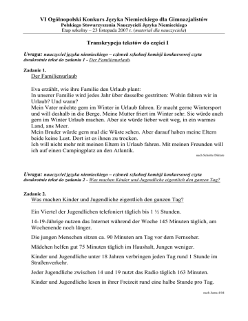 VI Ogólnopolski Konkurs Języka Niemieckiego dla Gimnazjalistów Polskiego Stowarzyszenia Nauczycieli Języka Niemieckiego Etap szkolny – 23 listopada 2007 r. (materiał dla nauczyciela) Transkrypcja tekstów do części I Uwaga: nauczyciel języka niemieckiego – członek szkolnej komisji konkursowej czyta dwukrotnie tekst do zadania 1 - Der Familienurlaub. Zadanie 1. Der Familienurlaub Eva erzählt, wie ihre Familie den Urlaub plant: In unserer Familie wird jedes Jahr über dasselbe gestritten: Wohin fahren wir in Urlaub? Und wann? Mein Vater möchte gern im Winter in Urlaub fahren. Er macht gerne Wintersport und will deshalb in die Berge. Meine Mutter friert im Winter sehr. Sie würde auch gern im Winter Urlaub machen. Aber sie würde lieber weit weg, in ein warmes Land, ans Meer. Mein Bruder würde gern mal die Wüste sehen. Aber darauf haben meine Eltern beide keine Lust. Dort ist es ihnen zu trocken. Ich will nicht mehr mit meinen Eltern in Urlaub fahren. Mit meinen Freunden will ich auf einen Campingplatz an den Atlantik. nach Schritte Diktate Uwaga: nauczyciel języka niemieckiego – członek szkolnej komisji konkursowej czyta dwukrotnie tekst do zadania 2 - Was machen Kinder und Jugendliche eigentlich den ganzen Tag? Zadanie 2. Was machen Kinder und Jugendliche eigentlich den ganzen Tag? Ein Viertel der Jugendlichen telefoniert täglich bis 1 ½ Stunden. 14-19-Jährige nutzen das Internet während der Woche 145 Minuten täglich, am Wochenende noch länger. Die jungen Menschen sitzen ca. 90 Minuten am Tag vor dem Fernseher. Mädchen helfen gut 75 Minuten täglich im Haushalt, Jungen weniger. Kinder und Jugendliche unter 18 Jahren verbringen jeden Tag rund 1 Stunde im Straßenverkehr. Jeder Jugendliche zwischen 14 und 19 nutzt das Radio täglich 163 Minuten. Kinder und Jugendliche lesen in ihrer Freizeit rund eine halbe Stunde pro Tag. nach Juma 4/04