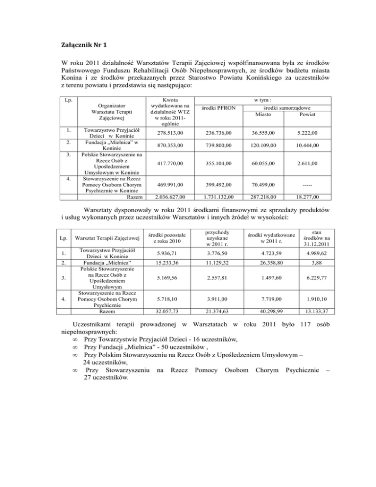 Załącznik Nr 1 W roku 2011 działalność Warsztatów Terapii Zajęciowej współfinansowana była ze środków Państwowego Funduszu Rehabilitacji Osób Niepełnosprawnych, ze środków budŜetu miasta Konina i ze środków przekazanych przez Starostwo Powiatu Konińskiego za uczestników z terenu powiatu i przedstawia się następująco: Lp. Organizator Warsztatu Terapii Zajęciowej 1. 2. 3. 4. Towarzystwo Przyjaciół Dzieci w Koninie Fundacja „Mielnica” w Koninie Polskie Stowarzyszenie na Rzecz Osób z Upośledzeniem Umysłowym w Koninie Stowarzyszenie na Rzecz Pomocy Osobom Chorym Psychicznie w Koninie Razem Kwota wydatkowana na działalność WTZ w roku 2011ogólnie w tym : środki PFRON środki samorządowe Miasto Powiat 278.513,00 236.736,00 36.555,00 5.222,00 870.353,00 739.800,00 120.109,00 10.444,00 417.770,00 355.104,00 60.055,00 2.611,00 469.991,00 399.492,00 70.499,00 ----- 2.036.627,00 1.731.132,00 287.218,00 18.277,00 Warsztaty dysponowały w roku 2011 środkami finansowymi ze sprzedaŜy produktów i usług wykonanych przez uczestników Warsztatów i innych źródeł w wysokości: Lp. 1. 2. 3. 4. Warsztat Terapii Zajęciowej Towarzystwo Przyjaciół Dzieci w Koninie Fundacja „Mielnica” Polskie Stowarzyszenie na Rzecz Osób z Upośledzeniem Umysłowym Stowarzyszenie na Rzecz Pomocy Osobom Chorym Psychicznie Razem środki pozostałe z roku 2010 przychody uzyskane w 2011 r. środki wydatkowane w 2011 r. stan środków na 31.12.2011 5.936,71 3.776,50 4.723,59 4.989,62 15.233,36 11.129,32 26.358,80 3,88 5.169,56 2.557,81 1.497,60 6.229,77 5.718,10 3.911,00 7.719,00 1.910,10 32.057,73 21.374,63 40.298,99 13.133,37 Uczestnikami terapii prowadzonej w Warsztatach w roku 2011 było 117 osób niepełnosprawnych: • Przy Towarzystwie Przyjaciół Dzieci - 16 uczestników, • Przy Fundacji „Mielnica” - 50 uczestników , • Przy Polskim Stowarzyszeniu na Rzecz Osób z Upośledzeniem Umysłowym – 24 uczestników, • Przy Stowarzyszeniu na Rzecz Pomocy Osobom Chorym Psychicznie – 27 uczestników. 2 Podział na stopnie i przyczynę niepełnosprawności : Ilość uczestników ze stopniem Lp. 1. 2. 3. 4. * Organizator WTZ Ilość uczestników z symbolem przyczyny niepełnosprawności * w tym : Charakterystyka P WTZ U R N S W tym osoby poruszające się o kulach , balkoniku lub wózku umiarko -wanym znaczn ym razem 2 14 16 Upośledzenie umysłowe 10 4 1 2 2 0 12 38 50 Upośledzenie umysłowe 4 2 1 2 41 6 1 23 24 Upośledzenie umysłowe 13 2 2 5 4 2 12 15 27 Choroby psychiczne 2 27 1 0 2 0 30 87 117 Towarzystwo Przyjaciół Dzieci Fundacja „Mielnica” Polskie Stowarzyszenie na Rzecz Osób z Upośledzeniem Umysłowym Stowarzyszenie na Rzecz Pomocy Osobom Chorym Psychicznie Razem 8 U- upośledzenie umysłowe, P- choroby psychiczne, R- upośledzenie narządu ruchu, N- choroby neurologiczne S – niepełnosprawność sprzęŜona ( więcej niŜ dwa schorzenia) Średnia frekwencja uczestników na zajęciach prowadzonych w WTZ w poszczególnych miesiącach roku 2011 przedstawiona w procentach : Organizator WTZ I II III IV V VI Towarzystwo Przyjaciół Dzieci w Koninie 81,00 73,00 82,00 68,00 76,00 76,00 Fundacja „Mielnica” 96,50 Polskie Stowarzyszenie na Rzecz Osób z Upośledzeniem Umysłowym Stowarzyszenie na Rzecz Pomocy Osobom Chorym Psychicznie Miesiąc VII 69,00 VIII IX X XI XII 75,00 69,00 76,00 79,00 83,00 85,30 84,50 88,80 95,40 86,00 84,00 92,00 69,00 85,60 89,30 92,60 90,00 urlop 91,80 87,00 89,00 85,40 82,00 74,00 85,20 urlop 70,00 69,00 68,00 81,00 81,00 87,00 79,00 84,00 urlop 80,30 91,00 90,00 80,00 82,30 80,40 urlop 81,60 3 Warsztaty Terapii Zajęciowej na terenie Miasta Konina realizują indywidualne programy rehabilitacyjne i prowadzą zajęcia terapeutyczne w pracowniach rehabilitacyjnych takich jak : - Pracowania gospodarstwa domowego, - Pracowania artystyczno-plastyczna, artystyczno-ceramiczna, - Pracownia bukieciarsko-zdobnicza, - Pracowania przystosowania zawodowego, - Pracowania techniczna, - Pracowania krawiecka, - Pracowania informatyki i podstaw reklamy, - Pracowania ogrodnicza, - Pracownia ekologiczna, - Pracowania rewalidacyjna, Uczestnicy Warsztatów Terapii Zajęciowej w roku ubiegłym wzięli udział w Projekcie „Wykorzystaj swoją szansę” współfinansowanym ze środków Unii Europejskiej w ramach Europejskiego Funduszu Społecznego, gdzie uczestniczyli w takich szkoleniach i kursach jak: - „Warsztat aktywnego poszukiwania pracy”, „Trening komunikacji i integracji”, „Zarządzanie budŜetem domowym”, „Warsztaty obsługi urządzeń biurowych”, „Warsztaty bukieciarstwa”. oraz odbyli indywidualną rozmowę z doradcą zawodowym. Ilość osób z WTZ uczestniczących w projekcie w 2011 roku Lp. 1. 2. 3. 4. - Organizator Warsztatu Terapii Zajęciowej Towarzystwo Przyjaciół Dzieci w Koninie Fundacja „Mielnica” Polskie Stowarzyszenie na Rzecz Osób z Upośledzeniem Umysłowym Stowarzyszenie na Rzecz Pomocy Osobom Chorym Psychicznie Razem Nazwa projektu „Wykorzystaj swoja szansę” 6 osób 4 osoby 4 osoby 9 osób 23 osoby Z przedłoŜonych przez jednostki prowadzące WTZ sprawozdań rocznych wynika, iŜ w roku 2011 – 25 osoby niepełnosprawne opuściły Warsztaty Terapii Zajęciowej z takich przyczyn jak: z powodu samodzielnej rezygnacji z terapii - 6 osób z powodu zmiany miejsca zamieszkania - 1 osoba z powodu podjęcia pracy w Zakładzie Aktywności Zawodowej - 17 osób z powodu pogorszenia stanu zdrowia - 1 osoba 4 W roku 2011 Rady Programowe poszczególnych Warsztatów Terapii Zajęciowej dokonały okresowych ocen realizacji indywidualnych programów rehabilitacji i podjęły decyzję w stosunku do uczestników tj.: 1. Rada Programowa Warsztatu Terapii Zajęciowej Towarzystwa Przyjaciół Dzieci w Koninie, dokonała oceny postępów rehabilitacji dla 16 uczestników Warsztatu i ustaliła, Ŝe: - 10 uczestników poczyniło znacznie, bądź niewielkie postępy w zakresie zaradności osobistej i samodzielności,