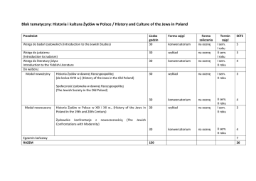 Blok tematyczny: Historia i kultura Żydów w Polsce / History and Culture of the Jews in Poland Przedmiot Wstęp do badań żydowskich (Introduction to the Jewish Studies) Wstęp do judaizmu (Introduction to Judaism) Wstęp do literatury jidysz Introduction to the Yiddish Literature Do wyboru: Moduł nowożytny Historia Żydów w dawnej Rzeczypospolitej (do końca XVIII w.) (History of the Jews in the Old Poland) Liczba godzin 30 Forma zajęć konwersatorium Forma zaliczenia na ocenę Termin zajęć I sem. I roku II sem. I roku I sem. II roku ECTS 30 wykład na ocenę 30 konwersatorium na ocenę 30 wykład na ocenę I sem. II roku 3 30 konwersatorium na ocenę 4 wykład na ocenę II sem. II roku I sem. II roku konwersatorium na ocenę II sem. II roku 4 5 3 4 Społeczność żydowska w dawnej Rzeczypospolitej (The Jewish Society in the Old Poland) Moduł nowoczesny Historia Żydów w Polsce w XIX i XX w., (History of the Jews in 30 Poland in the 19th and 20th Century) Żydowskie konfrontacje z nowoczesnością Confrontations with Modernity) (The Jewish 30 Egzamin końcowy RAZEM 3 150 7 26