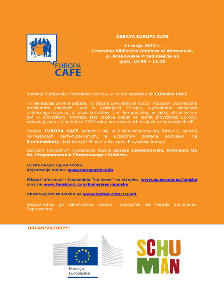 DEBATA EUROPA CAFE 11 maja 2013 r. Centralna Biblioteka Rolnicza w Warszawie, ul. Krakowskie Przedmieście 66 godz. 10.00 – 11.30 Komisja Europejska Przedstawicielstwo w Polsce zaprasza do EUROPA CAFE. To nie będzie zwykła debata. To będzie obywatelska burza mózgów, poświęcona problemom młodych ludzi w dzisiejszej Europie, wyzwaniom płynącym z obecnego kryzysu, a także kształtowi Unii Europejskiej, w jakiej chcielibyśmy żyć w przyszłości. Impreza jest częścią debat na temat przyszłości Europy, odbywających się od końca 2012 roku, we wszystkich krajach członkowskich UE. Debata EUROPA CAFE odbędzie się w niekonwencjonalnej formule, opartej na metodach partycypacyjnych, a uczestnicy zostaną podzieleni na 3 mini-debaty: Jaki kryzys? Młodzi w Europie i Przyszłość Europy. Gościem specjalnym wydarzenia będzie Janusz Lewandowski, Komisarz UE ds. Programowania Finansowego i Budżetu. Liczba miejsc ograniczona. Rejestracja online: www.europacafe.info Więcej informacji i transmisja "na żywo" na stronie: www.ec.europa.eu/polska oraz na www.facebook.com/komisjaeuropejska Obserwuj też #EUdeb8 na www.twitter.com/EUinPL Bezpośrednio Zapraszamy! po zakończeniu ORGANIZATORZY: debaty, rozpocznie się Parada Schumana.