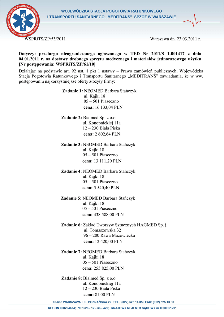 WSPRiTS/ZP/53/2011 Warszawa dn. 23.03.2011 r. Dotyczy: przetargu nieograniczonego ogłoszonego w TED Nr 2011/S 1-001417 z dnia 04.01.2011 r. na dostawy drobnego sprzętu medycznego i materiałów jednorazowego uŜytku [Nr postępowania: WSPRiTS/ZP/61/10] Działając na podstawie art. 92 ust. 1 pkt 1 ustawy – Prawo zamówień publicznych, Wojewódzka Stacja Pogotowia Ratunkowego i Transportu Sanitarnego „MEDITRANS” zawiadamia, Ŝe w ww. postępowaniu najkorzystniejsze oferty złoŜyły firmy: Zadanie 1: NEOMED Barbara Stańczyk ul. Kajki 18 05 – 501 Piaseczno cena: 16 133,04 PLN Zadanie 2: Bialmed Sp. z o.o. ul. Konopnickiej 11a 12 – 230 Biała Piska cena: 2 602,64 PLN Zadanie 3: NEOMED Barbara Stańczyk ul. Kajki 18 05 – 501 Piaseczno cena: 13 111,20 PLN Zadanie 4: NEOMED Barbara Stańczyk ul. Kajki 18 05 – 501 Piaseczno cena: 5 540,40 PLN Zadanie 5: NEOMED Barbara Stańczyk ul. Kajki 18 05 – 501 Piaseczno cena: 438 588,00 PLN Zadanie 6: Zakład Tworzyw Sztucznych HAGMED Sp. j. ul. Tomaszowska 32 96 – 200 Rawa Mazowiecka cena: 12 420,00 PLN Zadanie 7: NEOMED Barbara Stańczyk ul. Kajki 18 05 – 501 Piaseczno cena: 255 825,00 PLN Zadanie 8: Bialmed Sp. z o.o. ul. Konopnickiej 11a 12 – 230 Biała Piska cena: 81,00 PLN Zadanie 9: C.Z.L. Cezetel - Olsztyn Sp. z o.o. ul. Piłsudskiego 54 10 – 450 Olsztyn cena: 46 110,60 PLN Zadanie 10: NEOMED Barbara Stańczyk ul. Kajki 18 05 – 501 Piaseczno cena: 52 731,51 PLN Zadanie 11: NEOMED Barbara Stańczyk ul. Kajki 18 05 – 501 Piaseczno cena: 29 904,12 PLN Zadanie 12: Emergency Medical System Poland Sp. z o.o. ul. Ułanów 7 20 – 554 Lublin cena: 28 512,00 PLN Zadanie 13: NEOMED Barbara Stańczyk ul. Kajki 18 05 – 501 Piaseczno cena: 51 021,36 PLN Zadanie 14: NEOMED Barbara Stańczyk ul. Kajki 18 05 – 501 Piaseczno cena: 54 458,25 PLN Zadanie 15: C.Z.M. „CEZAL” S.A. Wrocław ul. Widna 4 50 – 543 Wrocław cena: 3 372,09 PLN Zadanie 16: HAND-PROD Sp. z o.o. ul. Leszczyńskiego 40a 02 – 496 Warszawa cena: 251 553,60 PLN Zadanie 17: Paramedica Polska Sp. z o.o. ul. śołny 11 02 – 815 Warszawa cena: 42 787,44 PLN Zadanie 18: NEOMED Barbara Stańczyk ul. Kajki 18 05 – 501 Piaseczno cena: 12 915,00 PLN Zadanie 19: Bio Lead – Lok B Sp. z o.o. ul. Sienkiewicza 22 05 – 420 Józefów cena: 32 788,80 PLN Zadanie 20: Bialmed Sp. z o.o. ul. Konopnickiej 11a 12 – 230 Biała Piska cena: 5 054,59 PLN Zadanie 21: Sorimex Sp. z o.o. Sp. k. ul. Równinna 25 87 – 100 Toruń cena: 14 747,40 PLN Zadanie 22: POV-GOL Sp. z o.o. ul. Traktorzystów 1 05 – 503 Głosków cena: 27 496,80 PLN Zadanie 23: POV-GOL Sp. z o.o. ul. Traktorzystów 1 05 – 503 Głosków cena: 29 278,80 PLN Zadanie 24: INCOMEDICA W. Olbryś ul. Pomorska 1B 05 – 500 Piaseczno cena: 22 386,00 PLN Zadanie 25: PARAMEDICA Polska Sp. z o.o. ul. śołny 11 02 – 815 Warszawa cena: 21 586,50 PLN Zadanie 26: LMP Sp. z o.o. ul. Kolista 25 40 – 486 Katowice cena: 34 311,60 PLN Zadanie 27: P.P.U.H. CONTENT Sp. z o.o. Al. W. Korfantego 66 40 – 161 Katowice cena: 10 967,30 PLN Zadanie 28: Medline Sp. z o.o. ul. Fabryczna 17 65 – 410 Zielona Góra cena: 155 758,32 PLN Zadanie 29: PARAMEDICA Polska Sp. z o.o. ul. śołny 11 02 – 815 Warszawa cena: 127 820,05 PLN Zadanie 30: Medtronic Poland Sp. z o.o. ul. Ostrobramska 101 04 - 041 Warszawa cena: 32 810,40 PLN Zadanie 33: PARAMEDICA Polska Sp. z o.o. ul. śołny 11 02 – 815 Warszawa cena: 12 093,62 PLN Zadanie 36: Sorimex Sp. z o.o. Sp. k. ul. Równinna 25 87 – 100 Toruń cena: 4 514,40 PLN Zadanie 37: PARAMEDYK Jacek Deneka ul. Siedzibna 32/8 03 – 317 Warszawa cena: 47 271,60 PLN Zadanie 38: P.Z.L. Cezal Lublin Sp. z o.o. Al. Spółdzielczości Pracy 38 20 – 147 Lublin cena: 15 777,72 PLN Zadanie 39: PARAMEDICA Polska Sp. z o.o. ul. śołny 11 02 – 815 Warszawa cena: 167 369,65 PLN Zadanie 40: PARAMEDICA Polska Sp. z o.o. ul. śołny 11 02 – 815 Warszawa cena: 34 438,77 PLN Zadanie 41: PARAMEDICA Polska Sp. z o.o. ul. śołny 11 02 – 815 Warszawa cena: 64 103,40 PLN Zadanie 42: Emergency Medical System Poland Sp. z o.o. ul. Ułanów 7 20 – 554 Lublin cena: 17 527,50 PLN Zadanie 43: PGF Urtica Sp. z o.o. ul. Krzemieniecka 120 54 – 613 Wrocław cena: 68 623,96 PLN Zadanie 44: C.Z.M. „CEZAL” S.A. Wrocław ul. Widna 4 50 – 543 Wrocław cena: 20 800,80 PLN Zadanie 45: Color Trading Sp. z o.o. ul. śołny 40 02 – 815 Warszawa cena: 11 223,90 PLN Zadanie 47: JTA Investment Sp. z o.o. ul. Bytomska 8 61 – 403 Poznań cena: 3 369,60 PLN Zadanie 48: JTA Investment Sp. z o.o. ul. Bytomska 8 61 – 403 Poznań cena: 339,12 PLN Zadanie 49: ENDEMED Sp. z o.o. ul. 3-go Maja 52/4 08 – 110 Siedlce cena: 2 799,36 PLN Zadanie 50: PARAMEDICA Polska Sp. z o.o. ul. śołny 11 02 – 815 Warszawa cena: 3 693,60 PLN Zadanie 51: BoxMet Medical Sp. z o.o. Piskorzów 51 58 – 250 Pieszyce cena: 10 086,00 PLN Zadanie 52: PARAMEDICA Polska Sp. z o.o. ul. śołny 11 02 – 815 Warszawa cena: 15 252,62 PLN Zadanie 53: ARNO-MED Sp. z o.o. ul. Kolejowa 24 55 – 081 Mietków cena: 976,71 PLN Zadanie 54: BoxMet Medical Sp. z o.o. Piskorzów 51 58 – 250 Pieszyce cena: 30 504,00 PLN Zadanie 55: AKME Sp. z o.o. Sp. k. ul. Postępu 1 02 – 676 Warszawa cena: 7 563,24 PLN Zadanie 56: Medline Sp. z o.o. ul. Fabryczna 17 65 – 410 Zielona Góra cena: 3 388,39 PLN Uzasadnienie wyboru: oferty najkorzystniejsze na podstawie kryteriów oceny ofert określonych w Specyfikacji Istotnych Warunków Zamówienia. Podstawą prawną dokonanego wyboru jest art. 91 ust. 1 ustawy – Prawo zamówień publicznych. Pozostali Wykonawcy, którzy złoŜyli oferty w ww. postępowaniu: Zadanie 1: J. Chodacki, A. Misztal „MEDICA” Sp. j. ul. Przemysłowa 4A 59 – 300 Lubin Punktacja w kryterium: cena – 96,64 Łączna punktacja: 96,64 Bialmed Sp. z o.o. ul. Konopnickiej 11a 12 – 230 Biała Piska Punktacja w kryterium: cena – 97,32 Łączna punktacja: 97,32 P.Z.L. Cezal Lublin Sp. z o.o. Al. Spółdzielczości Pracy 38 20 –