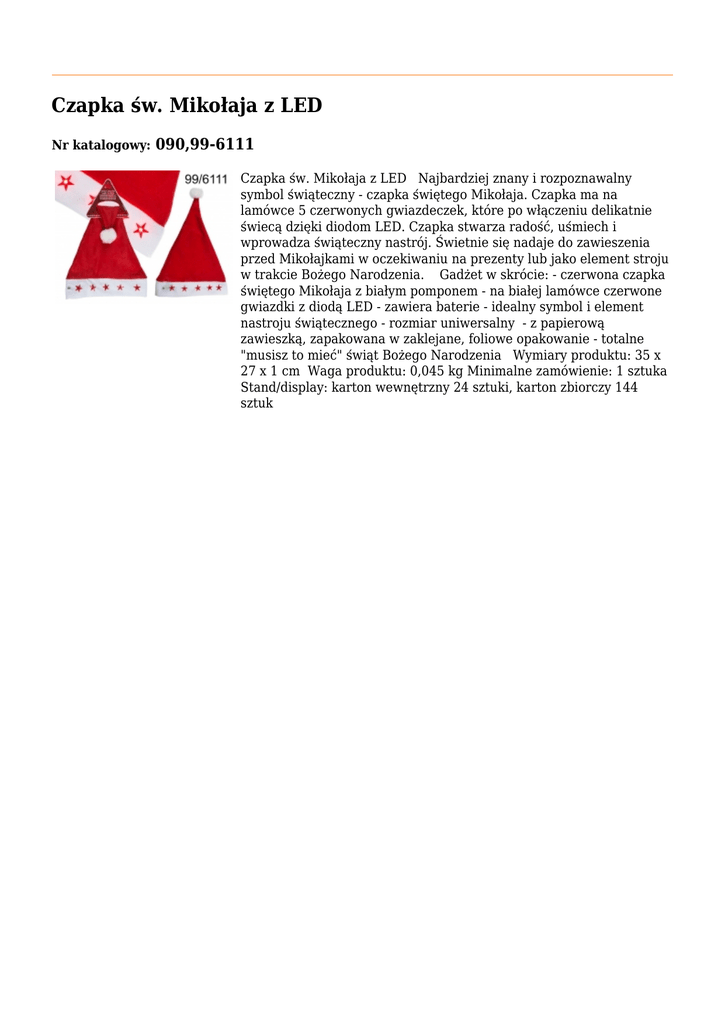 Czapka św. Mikołaja z LED Nr katalogowy: 090,99-6111 Czapka św. Mikołaja z LED Najbardziej znany i rozpoznawalny symbol świąteczny - czapka świętego Mikołaja. Czapka ma na lamówce 5 czerwonych gwiazdeczek, które po włączeniu delikatnie świecą dzięki diodom LED. Czapka stwarza radość, uśmiech i wprowadza świąteczny nastrój. Świetnie się nadaje do zawieszenia przed Mikołajkami w oczekiwaniu na prezenty lub jako element stroju w trakcie Bożego Narodzenia. Gadżet w skrócie: - czerwona czapka świętego Mikołaja z białym pomponem - na białej lamówce czerwone gwiazdki z diodą LED - zawiera baterie - idealny symbol i element nastroju świątecznego - rozmiar uniwersalny - z papierową zawieszką, zapakowana w zaklejane, foliowe opakowanie - totalne "musisz to mieć" świąt Bożego Narodzenia Wymiary produktu: 35 x 27 x 1 cm Waga produktu: 0,045 kg Minimalne zamówienie: 1 sztuka Stand/display: karton wewnętrzny 24 sztuki, karton zbiorczy 144 sztuk