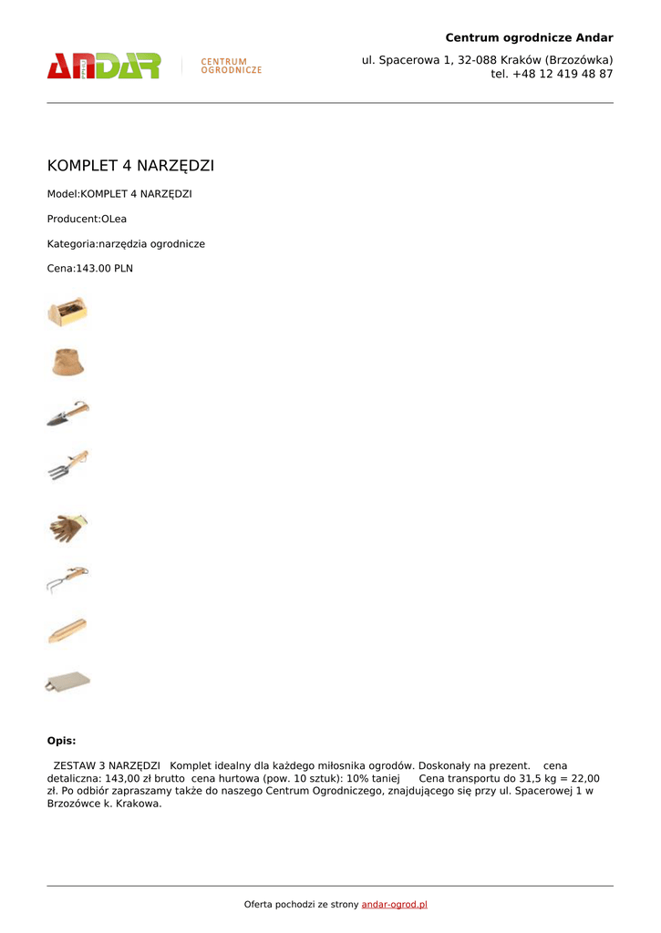 Centrum ogrodnicze Andar ul. Spacerowa 1, 32-088 Kraków (Brzozówka) tel. +48 12 419 48 87 KOMPLET 4 NARZĘDZI Model:KOMPLET 4 NARZĘDZI Producent:OLea Kategoria:narzędzia ogrodnicze Cena:143.00 PLN Opis: ZESTAW 3 NARZĘDZI Komplet idealny dla każdego miłosnika ogrodów. Doskonały na prezent. cena detaliczna: 143,00 zł brutto cena hurtowa (pow. 10 sztuk): 10% taniej Cena transportu do 31,5 kg = 22,00 zł. Po odbiór zapraszamy także do naszego Centrum Ogrodniczego, znajdującego się przy ul. Spacerowej 1 w Brzozówce k. Krakowa. Oferta pochodzi ze strony andar-ogrod.pl Centrum ogrodnicze Andar ul. Spacerowa 1, 32-088 Kraków (Brzozówka) tel. +48 12 419 48 87 Oferta pochodzi ze strony andar-ogrod.pl