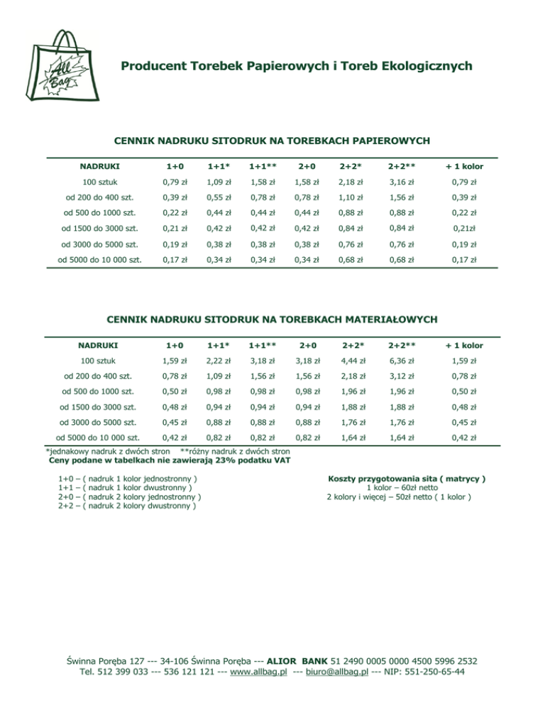 Producent Torebek Papierowych i Toreb Ekologicznych CENNIK NADRUKU SITODRUK NA TOREBKACH PAPIEROWYCH NADRUKI 1+0 1+1* 1+1** 2+0 2+2* 2+2** + 1 kolor 100 sztuk 0,79 zł 1,09 zł 1,58 zł 1,58 zł 2,18 zł 3,16 zł 0,79 zł od 200 do 400 szt. 0,39 zł 0,55 zł 0,78 zł 0,78 zł 1,10 zł 1,56 zł 0,39 zł od 500 do 1000 szt. 0,22 zł 0,44 zł 0,44 zł 0,44 zł 0,88 zł 0,88 zł 0,22 zł od 1500 do 3000 szt. 0,21 zł 0,42 zł 0,42 zł 0,42 zł 0,84 zł 0,84 zł 0,21zł od 3000 do 5000 szt. 0,19 zł 0,38 zł 0,38 zł 0,38 zł 0,76 zł 0,76 zł 0,19 zł od 5000 do 10 000 szt. 0,17 zł 0,34 zł 0,34 zł 0,34 zł 0,68 zł 0,68 zł 0,17 zł CENNIK NADRUKU SITODRUK NA TOREBKACH MATERIAŁOWYCH NADRUKI 1+0 1+1* 1+1** 2+0 2+2* 2+2** + 1 kolor 100 sztuk 1,59 zł 2,22 zł 3,18 zł 3,18 zł 4,44 zł 6,36 zł 1,59 zł od 200 do 400 szt. 0,78 zł 1,09 zł 1,56 zł 1,56 zł 2,18 zł 3,12 zł 0,78 zł od 500 do 1000 szt. 0,50 zł 0,98 zł 0,98 zł 0,98 zł 1,96 zł 1,96 zł 0,50 zł od 1500 do 3000 szt. 0,48 zł 0,94 zł 0,94 zł 0,94 zł 1,88 zł 1,88 zł 0,48 zł od 3000 do 5000 szt. 0,45 zł 0,88 zł 0,88 zł 0,88 zł 1,76 zł 1,76 zł 0,45 zł od 5000 do 10 000 szt. 0,42 zł 0,82 zł 0,82 zł 0,82 zł 1,64 zł 1,64 zł 0,42 zł *jednakowy nadruk z dwóch stron **różny nadruk z dwóch stron Ceny podane w tabelkach nie zawierają 23% podatku VAT 1+0 1+1 2+0 2+2 – – – – ( ( ( ( nadruk nadruk nadruk nadruk 1 1 2 2 kolor jednostronny ) kolor dwustronny ) kolory jednostronny ) kolory dwustronny ) Koszty przygotowania sita ( matrycy ) 1 kolor – 60zł netto 2 kolory i więcej – 50zł netto ( 1 kolor ) Świnna Poręba 127 --- 34-106 Świnna Poręba --- ALIOR BANK 51 2490 0005 0000 4500 5996 2532 Tel. 512 399 033 --- 536 121 121 --- www.allbag.pl --- [email protected] --- NIP: 551-250-65-44