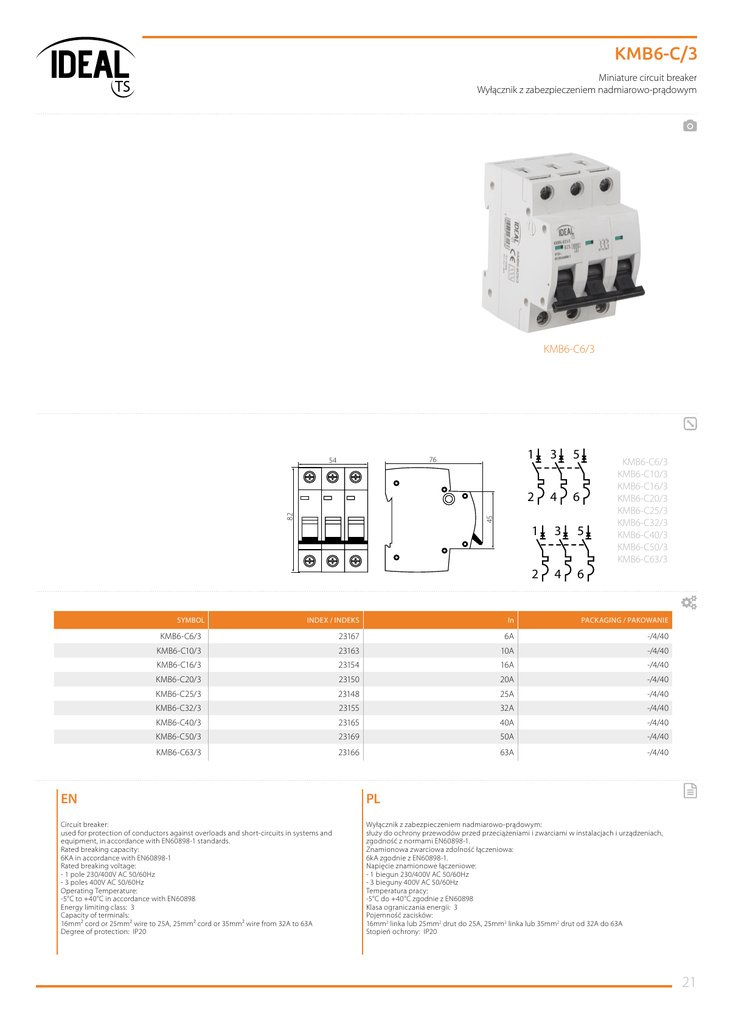 KMB6-C/3 Miniature circuit breaker Wyłącznik z zabezpieczeniem nadmiarowo-prądowym KMB6-C6/3 76 SYMBOL 45 82 54 INDEX / INDEKS 1 3 5 2 4 6 1 3 5 2 4 6 KMB6-C6/3 KMB6-C10/3 KMB6-C16/3 KMB6-C20/3 KMB6-C25/3 KMB6-C32/3 KMB6-C40/3 KMB6-C50/3 KMB6-C63/3 In PACKAGING / PAKOWANIE KMB6-C6/3 23167 6A -/4/40 KMB6-C10/3 23163 10A -/4/40 KMB6-C16/3 23154 16A -/4/40 KMB6-C20/3 23150 20A -/4/40 KMB6-C25/3 23148 25A -/4/40 KMB6-C32/3 23155 32A -/4/40 KMB6-C40/3 23165 40A -/4/40 KMB6-C50/3 23169 50A -/4/40 KMB6-C63/3 23166 63A -/4/40 EN PL Circuit breaker: used for protection of conductors against overloads and short-circuits in systems and equipment, in accordance with EN60898-1 standards. Rated breaking capacity: 6KA in accordance with EN60898-1 Rated breaking voltage: - 1 pole 230/400V AC 50/60Hz - 3 poles 400V AC 50/60Hz Operating Temperature: -5°C to +40°C in accordance with EN60898 Energy limiting class: 3 Capacity of terminals: 16mm2 cord or 25mm2 wire to 25A, 25mm2 cord or 35mm2 wire from 32A to 63A Degree of protection: IP20 Wyłącznik z zabezpieczeniem nadmiarowo-prądowym: służy do ochrony przewodów przed przeciążeniami i zwarciami w instalacjach i urządzeniach, zgodność z normami EN60898-1. Znamionowa zwarciowa zdolność łączeniowa: 6kA zgodnie z EN60898-1. Napięcie znamionowe łączeniowe: - 1 biegun 230/400V AC 50/60Hz - 3 bieguny 400V AC 50/60Hz Temperatura pracy: -5°C do +40°C zgodnie z EN60898 Klasa ograniczania energii: 3 Pojemność zacisków: 16mm2 linka lub 25mm2 drut do 25A, 25mm2 linka lub 35mm2 drut od 32A do 63A Stopień ochrony: IP20 21