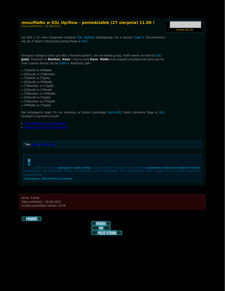 mouzMaNa w GSL Up/Dow - poniedziałek (27 sierpnia) 11.00 ! Data publikacji : 26.08.2012 Ocena: 5/5 (2) Już dziś o 11 rano rozegrane zostanie GSL Up/Dow zbliżającego się 4 sezonu Code S. Doczekaliśmy się, po 2 latach zobaczymy polską flagę w GSL! Grzegorz rozegra cztery gry Bo1 z Koreańczykami, nie ma łatwej grupy, trafił nawet na mistrza GSL Jjakji. Pozostali to Bomber, Keen i mocny zerg Hyun. MaNa musi wygrać przynajmniej dwie gry by mieć szanse dostać się do Code S. Kolejność gier: ● ● ● ● ● ● ● ● ● ● (T)KeeN vs (P)MaNa (Z)HyuN vs (T)Bomber (T)KeeN vs (T)jjakji (Z)HyuN vs (P)MaNa (T)Bomber vs (T)jjakji (Z)HyuN vs (T)KeeN (T)Bomber vs (P)MaNa (Z)HyuN vs (T)jjakji (T)Bomber vs (T)KeeN (P)MaNa vs (T)jjakji Nie przegapcie tego! Po raz pierwszy w historii polskiego StarCraft2 biało czerwona flaga w GSL, Grzegorz trzymamy kciuki! ● ● GSL Up/Down grupy liquipedia Stream z gier przez GOM player Tagi: mana, Korea, GSL Uprasza się osoby kopiujące w całości newsy z naszej witryny na swoje strony lub fora o wstawianie widocznych klikalnych linków, bezpośrednio do pobranego tekstu. W przypadku braku widocznego linku, skopiowanie tekstu uważa się za kradzież własności intelektualnej. Dziękujemy: Administratorzy serwisu. Autor: Fanek Data publikacji : 26.08.2012 Liczba wyświetleń tekstu: 5134 Komentarz (43) dodaj komentarz bladź, że tez akurat w takich godzinach :/. Nienawidzę poniedziałków.~Hedrox 2012/08/27 05:23 MaNa FTW! Polish Pride! ;)~Ch3rry 2012/08/27 08:37 MEGA!!! Dumni czekamy na mecze!~SzRaPnEL 2012/08/27 08:40 Jak bedzie mozna ogladac mane? ttrzeba jakies konto wykupic czy darmowy stream?~herezjush 2012/08/27 09:34 Darmowy ale musisz mieć ten śmieszny GOMTV player. Zrób konto na gomtv i sciągnij.~Habu 2012/08/27 09:43 jeśli ktoś miałby możliwość nagrajcie to wrzucimy na strone, ja niestety nie moge dziś~Fanek Battlenet Network 2012/08/27 10:28 Dajcie znac czy ktoś ogląda i jak ściągnąć ten player. Siedze na stronie ale na razie dostaje info ze nie ma streamu live...~Adelard 2012/08/27 11:09 http://www.gomtv.net/live/index.gom?conid=70574~luk1230 2012/08/27 11:15 fak ale jakość ;/ jak man wejdzie do Code S to trzeba kupić. MANA 1:0 !! :D~Adelard 2012/08/27 11:35 SPOILER (T)KeeN vs (P)MaNa (MaNa WIN)~mexovic 2012/08/27 11:35 Gratz!!!~dnd 2012/08/27 11:36 WOW, nie dość, że wygrał, to jeszcze w takim stylu! Genialna, świetna gra z obu stron :-) oby więcej takich! BTW - polski Khaldora FTW! :D~Gothmor 2012/08/27 11:41 Brawo MaNa! Pierwsza gra wygrana, ale to chyba była na najłatwiejsza...pozostałe będą strasznie trudne, MaNa musi coś wymyślić...GoGo Poland!! :) EDIT : *najłatwiejsza, przepraszam, jąkam się pewnie z emocji :P~Vouch 2012/08/27 11:42 komentarz Khaldora na start meczu bezcenny "dawaj napie******" :D:D:D~Taryban 2012/08/27 11:57 HyuN Owned xDDD~mexovic 2012/08/27 12:42 MaNa zgwałcił już dwóch Koreańców. Czekamy na więcej.~Duppon 2012/08/27 12:43 SPOILER ALERT (Z)HyuN vs (P)MaNa (MaNa WIN)~Minis 2012/08/27 12:43 Hyun strasznie zwalił, ale tym lepiej. Świetna gra ze strony MaNy. Mam nadzieję że dobrze się przygotował do dwóch pozostałych PvT.~Vouch 2012/08/27 12:48 Jak ktoś będzie miał linka do replay/vod to niech zapoda ;)~dnd 2012/08/27 12:53 Pieprzony bomber i pieprzone terrańskie imba nie-do-powstrzymania dropy.~Duppon 2012/08/27 13:57 Ech...wszystko było do zatrzymania, przyczyną porażki był brak scoutu, i niewiedza MaNy o 3 bazie. Mam nadzieję że z Jjaki wygra.~Vouch 2012/08/27 14:24 Mana skrewił tą grą tak samo jak vs Hyun, tylko, że tym razem zapłacił za swoje błędy. Mam nadzieję, że zobaczymy jak wymiata w code S, ale musi zacząć grać lepiej.~Sulphuriell 2012/08/27 14:27 Tak czy siak MaNa dostał się do Code S, co nie zmienia faktu, że nic nie robi takich zniszczeń jak pierdolone dropy, najlepiej w 2 miejsca na raz.~Duppon 2012/08/27 14:36 Teraz już tak, bo bomber na 1 . MaNa w code S!~Vouch 2012/08/27 14:37 Polskie biadolenie... skrewił nie skrewił... Goście Mana się autentycznie bał że nie wgra nawet 2ch gier. Tymczasem już pierwszymi grami zagwarantował sobie CODE S wygrywając z właściwymi przeciwnikami! Brawa i gratulacje. Mana na pewno jeszcze szybciej się podciągnie dzięki graniu w code S. CODE S = REAL TEST :)~Adelard 2012/08/27 15:11 A jakie są w ogóle sukcesy obcokrajowców (nie Koreanczykow) w Code S w ostatnich latach? Zaszedł tam ktoś gdzieś dalej?~ mathias00 2012/08/27 15:20 mathias - naniwa bodajże do ro8 zaszedł 2 razy czy coś takiego.~niegoslav 2012/08/27 15:50 Dzięki niegoslav. No to jak Mana ro4 trzaśnie to będzie git :)~mathias00 2012/08/27 15:54 ~mathias00 NaNiWa, Huk oni dochodzili do Ro8 Idra ThorZaIN Sen Jinro tu Ro16 i Ro32 No i jeszcze kilka w CodeA~mexovic 2012/08/27 16:00 Jinro to akurat był 2x TOP4~AngelOfChaos 2012/08/27 16:12 Zgadza się Jinro dochodził najdalej. Inna sprawa, że to było w pierwszych sezonach, kiedy jeszcze ludzie mocno nie wyskillowali gry. Manie występ w Code S się przyda - się chłopak rozluźni, to nie będzie popełniał taktycznych błędów przez stres, jak to było widać dzisiaj.~Sulphuriell 2012/08/27 16:51 Brawo Mana!!~puchatek 2012/08/27 17:18 Tak w ogóle to GSL nie wiem czy nie jest najlepszą formą (oczywiście w przypadku jakiegoś dużego sukcesu Many) na pomoc w rozwoju eSportu w Polsce, na promocję gier komputerowych jako sportu. Jeżeli faktycznie udałoby mu się osiągnąć półfinał czy finał to jestem ciekaw czy przybiłby się z tym do jakiś bardziej mainstreamowych mediów.~mathias00 2012/08/27 17:31 @mathias00 Szczerze mówiąc, wątpię. Polacy odnosili mnóstwo sukcesów na scenie CS 1.6 (wielokrotne tytuły mistrzów europy i świata) i jedyne co, to raz o nich w Panoramie wspomnieli jak wygrali WCG w 2008 roku bodajże i to na sam koniec programu. W LoLu też mamy dość spore sukcesy i nikt o tym nic nie mówi. Małe szan
