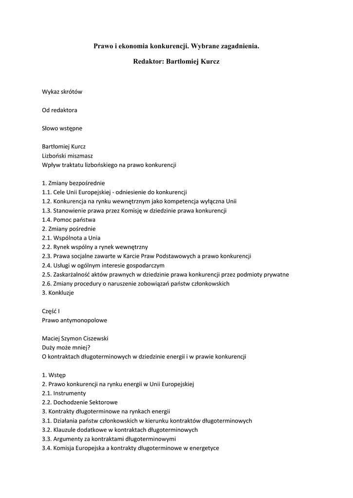 Prawo i ekonomia konkurencji. Wybrane zagadnienia. Redaktor: Bartłomiej Kurcz Wykaz skrótów Od redaktora Słowo wstępne Bartłomiej Kurcz Lizboński miszmasz Wpływ traktatu lizbońskiego na prawo konkurencji 1. Zmiany bezpośrednie 1.1. Cele Unii Europejskiej - odniesienie do konkurencji 1.2. Konkurencja na rynku wewnętrznym jako kompetencja wyłączna Unii 1.3. Stanowienie prawa przez Komisję w dziedzinie prawa konkurencji 1.4. Pomoc państwa 2. Zmiany pośrednie 2.1. Wspólnota a Unia 2.2. Rynek wspólny a rynek wewnętrzny 2.3. Prawa socjalne zawarte w Karcie Praw Podstawowych a prawo konkurencji 2.4. Usługi w ogólnym interesie gospodarczym 2.5. Zaskarżalność aktów prawnych w dziedzinie prawa konkurencji przez podmioty prywatne 2.6. Zmiany procedury o naruszenie zobowiązań państw członkowskich 3. Konkluzje Część I Prawo antymonopolowe Maciej Szymon Ciszewski Duży może mniej? O kontraktach długoterminowych w dziedzinie energii i w prawie konkurencji 1. Wstęp 2. Prawo konkurencji na rynku energii w Unii Europejskiej 2.1. Instrumenty 2.2. Dochodzenie Sektorowe 3. Kontrakty długoterminowe na rynkach energii 3.1. Działania państw członkowskich w kierunku kontraktów długoterminowych 3.2. Klauzule dodatkowe w kontraktach długoterminowych 3.3. Argumenty za kontraktami długoterminowymi 3.4. Komisja Europejska a kontrakty długoterminowe w energetyce 3.5. Kontrakty długoterminowe w segmencie produkcji (ang. up-stream) 3.6. Wybrane sprawy Komisji Europejskiej dotyczące kontraktów długoterminowych w segmencie dystrybucji (ang. down-stream) 3.6.1. Sprawa Gas Natural/Endesa 3.6.2. Sprawa Repsol 3.6.3. Sprawa Distrigas 3.6.4. Sprawa EDF 3.6.5. Exeltium 4. Energia nuklearna 5. Wnioski Wojciech Balcerowicz I wilk syty, i owca cała? Wiążące zobowiązania przedsiębiorstw i decyzje Komisji Europejskiej na podstawie art. 9 rozporządzenia Rady (WE) nr 1/2003 1. Wstęp 2. Przepisy prawa 3. Historia i natura decyzji Komisji na podstawie art. 9 rozporządzenia 3.1. Historia 3.2. Główne różnice w stosunku do decyzji wydawanych na podstawie art. 7 rozporządzenia 3.3. Rodzaj spraw, które mogą zostać zakończone decyzją na podstawie art. 9 rozporządzenia 3.4. Zalety zakończenia sprawy decyzją na podstawie art. 9 rozporządzenia 4. Treść zobowiązań 4.1. Zobowiązania behawioralne lub strukturalne 4.2. Wymóg proporcjonalności 4.3. Okres obowiązywania 5. Główne etapy postępowania mogącego się zakończyć decyzją na podstawie art. 9 rozporządzenia 5.1. Wstępne badanie sprawy 5.2. Formalne wszczęcie postępowania 5.3. Wstępne zastrzeżenia Komisji 5.4. Złożenie zobowiązań 5.5. Konsultacja stron trzecich 5.6. Decyzja Komisji 5.7. Kontrola sądowa nad decyzją Komisji 6. Moc wiążąca decyzji wydanych na podstawie art. 9 rozporządzenia 6.1. Komisja 6.2. Władze krajowe 6.2.1. Zachowanie przedsiębiorstw niezgodne ze złożonymi zobowiązaniami po wydaniu decyzji przez Komisję 6.2.2. Stosowanie unijnego prawa konkurencji lub analogicznego prawa wewnętrznego do zachowania przedsiębiorstw sprzed wydania decyzji przez Komisję oraz do zachowania przedsiębiorstw po wydaniu decyzji przez Komisję, zgodnego ze złożonymi zobowiązaniami 6.2.3. Stosowanie przepisów prawa wewnętrznego bardziej restrykcyjnych niż prawo unijne 6.3. Strony trzecie 7. Dotychczasowa praktyka decyzyjna Komisji 7.1. Bundesliga 7.2. Coca-Cola 7.3. De Beers/Alrosa 7.4. Football Associacion Premier League 7.5. Repsol 7.6. Porozumienie z Cannes 7.7. DaimlerChrysler, Fiat, Toyota i General Motors 7.8. Distrigas 7.9. E.ON 7.10. RWE Gas 7.11. IACS (klasyfikacja statków) 7.12. GdF Suez 7.13. Rambus 7.14. Microsoft 8. Podsumowanie Aleksandra Ossowska Co, komu i za ile? Zastosowanie prawa konkurencji i mikroekonomii do oceny wymian informacji między przedsiębiorstwami 1. Wprowadzenie - dlaczego warto o tym rozmawiać? 2. Ocena prawna wymiany informacji 2.1. Praktyczne doświadczenie zebrane przez Komisję Europejską (Dyrekcja ds. Konkurencji) 2.2. Dorobek orzecznictwa na temat wymiany informacji 3. Kiedy wymiana informacji jest korzystna dla konkurencji? 3.1. Informacja o popycie - tzw. efekt dostosowania produkcji 3.2. Informacja a koszty 3.3. Informacja a różnorodność i jakość produktu 3.4. Informacja o konsumencie a istnienie rynku 4. Kiedy wymiana informacji szkodzi konkurencji? 4.1. Jaka informacja jest najbardziej niebezpieczna dla konkurencji? 4.2. Zakres pokrycia rynku właściwego 4.3. Cechy charakterystyczne rynku 4.3.1. Przejrzystość rynku 4.3.2. Skomplikowanie rynku 4.3.3. Stałość rynku 4.3.4. Długotrwałość współpracy 4.3.5. Skoncentrowanie rynku 4.3.6. Symetria przedsiębiorstw 5. Cechy charakterystyczne wymiany informacji 5.1. Strategiczna użyteczność informacji 5.2. Publiczna dostępność informacji 5.3. Dane jednostkowe a zagregowane 5.4. Wiek danych 5.5. Częstotliwość wymiany informacji 6. Granica możliwości prawnych? 7. Konkluzje Grażyna Piesiewicz-Stępniewska Oszustwo... bezkonkurencyjne? O stosowaniu unijnego prawa konkurencji do praw własności przemysłowej: wykorzystywanie praw wyłącznych w procesie normalizacji 1. Wstęp 2. Prawo konkurencji a prawa własności przemysłowej 2.1. Zarys wybranych zagadnień z dotychczasowego orzecznictwa ETS 2.2. Rynkowa rola praw własności przemysłowej i ewolucja sposobów ich wykorzystania 3. Proces normalizacji (ang. standard setting) 3.1. Źródła norm (ang. standards) w Europie 3.2. Cele i rola procesów normalizacyjnych 4. Unijne prawo konkurencji a normalizacja 4.1. Zasady dotyczące umów normalizacyjnych 4.2. Zasady dotyczące wykorzystywania praw własności przemysłowej w procesie normalizacji 4.3. Problem zasadzki patentowej (ang. patent ambush) 4.3.1. Sprawa Rambus 4.3.1.1. Postępowanie w USA 4.3.1.2. Postępowanie w Europie 4.3.2. Unijne prawo konkurencji a zasadzka patentowa 5. Podsumowanie Ewelina Jelenkowska-Luca Komisja na tropie Inspekcje w postępowaniach kartelo