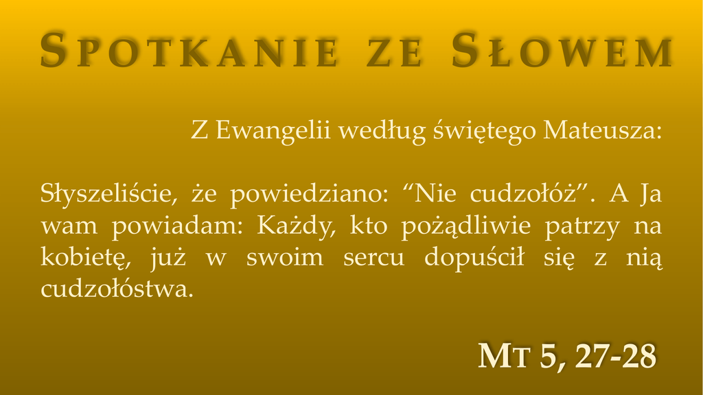 SPOTKANIE ZE SŁOWEM Z Ewangelii według świętego Mateusza: Słyszeliście, że powiedziano: “Nie cudzołóż”. A Ja wam powiadam: Każdy, kto pożądliwie patrzy na kobietę, już w swoim sercu dopuścił się z nią cudzołóstwa. MT 5, 27-28 SPOTKANIE ZE SŁOWEM #1 „Słyszeliście, że powiedziano […] A Ja wam powiadam” Jeżeli czytasz ten tekst, to między innymi dlatego, że masz dostęp do internetu. A to oznacza, że masz prawie nieograniczony dostęp do danych. Możesz czerpać informacje z milionów źródeł. O Ewangelii piszą dziś niemal wszyscy, tłumaczą ją nawet osoby, które od lat nie były w kościele. Łatwo nam ulec samozwańczym „ekspertom”, specjalistom w każdej dziedzinie. Słuch to prawdopodobnie najważniejszy zmysł dla chrześcijanina. Kogo słucham? MT 5, 27-28 SPOTKANIE ZE SŁOWEM #2 „Nie cudzołóż” Czasami wydaje się, że słowo Boże jest odległe, kierowane nie do nas. Problem, na które wskazuje Jezus, właściwie dotyczy osób zamężnych, ewentualnie tych, którzy się z nimi spotykają. Ale… Takie wskazania ostrzegają wszystkich. Może cudzołóstwo rzeczywiście nie jest moim problemem, jednak w jego miejsce można „podstawić” – jak do wzoru matematycznego – każdą moją słabość. Nie chodzi więc tylko o to, aby nie czynić zła ze względu na przepisy PRAWA. Jezus naucza, żeby Z MIŁOŚCI zrezygnować ze wszystkiego, co do zła może prowadzić. MT 5, 27-28 SPOTKANIE ZE SŁOWEM #3 „Każdy, kto pożądliwie patrzy na kobietę, już w swoim sercu dopuścił się z nią cudzołóstwa.” Jezus miał przynieść nam wolność, a stawia nam poprzeczkę wyżej i wyżej. Dlaczego? Najłatwiejsze przykazanie. Nie rób tego, nie rób tamtego. Wolność, którą przynosi Jezus, to wolność od prawa, które zniewala. Nie chodzi o to, żebym mieścił się w rubrykach i założonych normach postępowania, ale patrzył na człowieka, który jest obok mnie. Kiedy w posłuszeństwo Bogu zaangażuję serce i miłość, słowa Jezusa przestaną być trudniejsze do wypełnienia. MT 5, 27-28 SPOTKANIE ZE SŁOWEM #4 „pożądliwie patrzy” „Pożądliwie patrzy” ten, kto nie ma tego, co chciałby mieć. Kiedy patrzy tak na kobietę, zaczyna traktować człowieka jak rzecz. Ale… Czy pożądliwie patrzeć można tylko na kobietę? To naturalne, że chcemy mieć rzeczy czy zdolności, których nie mamy. Nie jest jednak naturalne, kiedy to pragnienie nad nami panuje, prowadzi do zazdrości, powraca w myślach, układa plan działania. Czasami wydaje nam się, że na miejscu Pana Boga stworzylibyśmy siebie znacznie lepszych. Czy doceniam to, co posiadam (to dar od Boga!)? Czy potrafię ucieszyć się z tego, co ma mój brat, siostra, kolega, znajomy? MT 5, 27-28 SPOTKANIE ZE SŁOWEM #5 „już w swoim sercu dopuścił się z nią cudzołóstwa” Taki człowiek dopuścił się cudzołóstwa w sercu – ale na razie tylko w sercu. Słowo nie przeszło jeszcze w czyn. Od zamiaru do wykonania zwykle mija trochę czasu. Jak wykorzystuję ten czas? Czy kiedy mam dobre intencje, potrafię wytrwać w tym, co postanowiłem? Gdy intencje są złe, czy potrafię „ochłonąć” i zrezygnować ze zła, które zmierzam popełnić? MT 5, 27-28