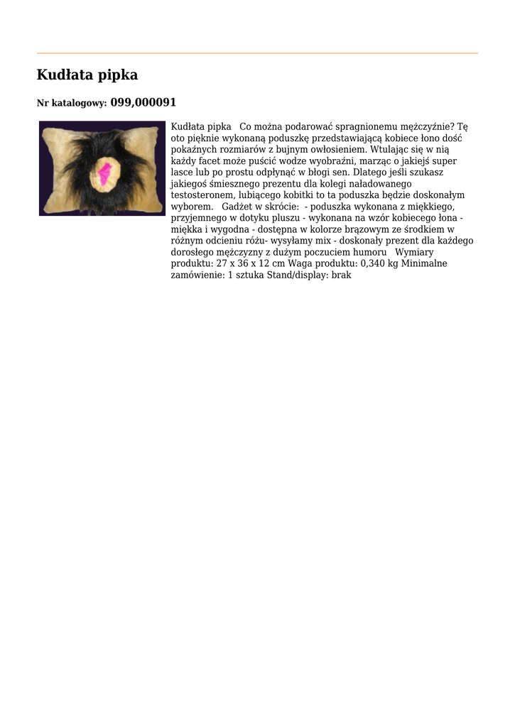 Kudłata pipka Nr katalogowy: 099,000091 Kudłata pipka Co można podarować spragnionemu mężczyźnie? Tę oto pięknie wykonaną poduszkę przedstawiającą kobiece łono dość pokaźnych rozmiarów z bujnym owłosieniem. Wtulając się w nią każdy facet może puścić wodze wyobraźni, marząc o jakiejś super lasce lub po prostu odpłynąć w błogi sen. Dlatego jeśli szukasz jakiegoś śmiesznego prezentu dla kolegi naładowanego testosteronem, lubiącego kobitki to ta poduszka będzie doskonałym wyborem. Gadżet w skrócie: - poduszka wykonana z miękkiego, przyjemnego w dotyku pluszu - wykonana na wzór kobiecego łona miękka i wygodna - dostępna w kolorze brązowym ze środkiem w różnym odcieniu różu- wysyłamy mix - doskonały prezent dla każdego dorosłego mężczyzny z dużym poczuciem humoru Wymiary produktu: 27 x 36 x 12 cm Waga produktu: 0,340 kg Minimalne zamówienie: 1 sztuka Stand/display: brak