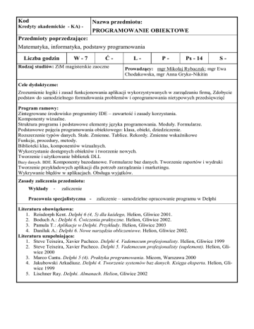 Kod Nazwa przedmiotu: Kredyty akademickie - KA) - PROGRAMOWANIE OBIEKTOWE Przedmioty poprzedzające: Matematyka, informatyka, podstawy programowania Liczba godzin W-7 Ć- Rodzaj studiów: ZiM magisterskie zaoczne L- P- Ps - 14 S- Prowadzący: mgr Mikołaj Rybaczuk; mgr Ewa Chodakowska, mgr Anna Gryko-Nikitin Cele dydaktyczne: Zrozumienie logiki i zasad funkcjonowania aplikacji wykorzystywanych w zarządzaniu firmą, Zdobycie podstaw do samodzielnego formułowania problemów i oprogramowania nietypowych przedsięwzięć Program ramowy: Zintegrowane środowisko programisty IDE – zawartość i zasady korzystania. Komponenty wizualne. Struktura programu i podstawowe elementy języka programowania. Moduły. Formularze. Podstawowe pojęcia programowania obiektowego: klasa, obiekt, dziedziczenie. Rozszerzenie typów danych. Stałe. Zmienne. Tablice. Rekordy. Zmienne wskaźnikowe Funkcje, procedury, metody. Biblioteki klas, komponentów wizualnych. Wykorzystanie dostępnych obiektów i tworzenie nowych. Tworzenie i użytkowanie bibliotek DLL Bazy danych. BDE. Komponenty bazodanowe. Formularze baz danych. Tworzenie raportów i wydruki Tworzenie przykładowych aplikacji dla potrzeb zarządzania i marketingu. Wykrywanie błędów w aplikacjach. Obsługa wyjątków. Zasady zaliczenia przedmiotu: Wykłady - zaliczenie Pracownia specjalistyczna - zaliczenie – samodzielne opracowanie programu w Delphi Literatura obowiązkowa: 1. Reisdorph Kent. Delphi 6 (4, 5) dla każdego, Helion, Gliwice 2001. 2. Boduch A.: Delphi 6. Ćwiczenia praktyczne. Helion, Gliwice 2002. 3. Pamula T.: Aplikacje w Delphi. Przykłady. Helion, Gliwice 2003 4. Daniluk A.: Delphi 6. Nowe narzędzia obliczeniowe. Helion, Gliwice 2002. Literatura uzupełniająca: 1. Steve Teixeira, Xavier Pacheco. Delphi 4. Vademecum profesjonalisty. Helion, Gliwice 1999 2. Steve Teixeira, Xavier Pacheco. Delphi 5. Vademecum profesjonalisty (suplement). Helion, Gliwice 2000 3. Marco Cantu. Delphi 5 (4). Praktyka programowania. Micom, Warszawa 2000 4. Jakubowski Arkadiusz. Delphi 4. Tworzenie systemów baz danych. Księga eksperta. Helion, Gliwice 1999 5. Lischner Ray. Delphi. Almanach. Helion, Gliwice 2002 Zdobyte umiejętności: Umiejętność oprogramowania nietypowych problemów w firmie. Umiejętność wykorzystania istniejących i tworzenia własnych komponentów i bibliotek. Poznanie przeznaczenia, konstrukcji i metod programowania baz danych. Wkład do kształtowania postaw społecznych i zawodowych: Poszerzenie sposobu widzenia problemów związanych z zarządzaniem firmą. Głębsze rozumienie problemów związanych z komputeryzacją firmy (przedsiębiorstwa). Stosowane metody dydaktyczne: Wykład z wykorzystaniem komputera z rzutnikiem multimedialnym oraz folii. Praca w laboratorium, samodzielne opracowanie programów w środowisku programisty IDE. Przykłady zastosowanych metod aktywizujacych: Samodzielne tworzenie programów realizujących zadane problemy. Praca na żywo z komputerem w wizualnym środowisku Delphi. Na wykładach ilustracja pojęć i metod programowania obiektowego własnymi (wykładowcy) aplikacjami.