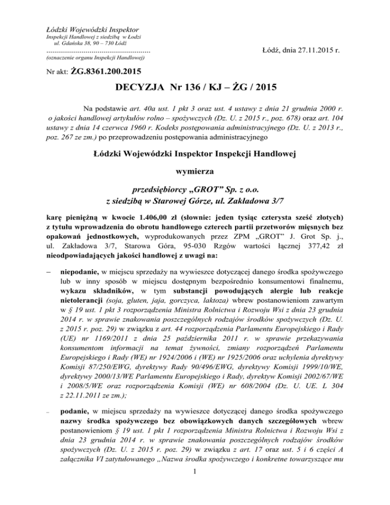 Łódzki Wojewódzki Inspektor Inspekcji Handlowej z siedzibą w Łodzi ul. Gdańska 38, 90 – 730 Łódź Łódź, dnia 27.11.2015 r. ..................................................... (oznaczenie organu Inspekcji Handlowej) Nr akt: ŻG.8361.200.2015 DECYZJA Nr 136 / KJ – ŻG / 2015 Na podstawie art. 40a ust. 1 pkt 3 oraz ust. 4 ustawy z dnia 21 grudnia 2000 r. o jakości handlowej artykułów rolno – spożywczych (Dz. U. z 2015 r., poz. 678) oraz art. 104 ustawy z dnia 14 czerwca 1960 r. Kodeks postępowania administracyjnego (Dz. U. z 2013 r., poz. 267 ze zm.) po przeprowadzeniu postępowania administracyjnego Łódzki Wojewódzki Inspektor Inspekcji Handlowej wymierza przedsiębiorcy „GROT” Sp. z o.o. z siedzibą w Starowej Górze, ul. Zakładowa 3/7 karę pieniężną w kwocie 1.406,00 zł (słownie: jeden tysiąc czterysta sześć złotych) z tytułu wprowadzenia do obrotu handlowego czterech partii przetworów mięsnych bez opakowań jednostkowych, wyprodukowanych przez ZPM „GROT” J. Grot Sp. j., ul. Zakładowa 3/7, Starowa Góra, 95-030 Rzgów wartości łącznej 377,42 zł nieodpowiadających jakości handlowej z uwagi na: niepodanie, w miejscu sprzedaży na wywieszce dotyczącej danego środka spożywczego lub w inny sposób w miejscu dostępnym bezpośrednio konsumentowi finalnemu, wykazu składników, w tym substancji powodujących alergie lub reakcje nietolerancji (soja, gluten, jaja, gorczyca, laktoza) wbrew postanowieniom zawartym w § 19 ust. 1 pkt 3 rozporządzenia Ministra Rolnictwa i Rozwoju Wsi z dnia 23 grudnia 2014 r. w sprawie znakowania poszczególnych rodzajów środków spożywczych (Dz. U. z 2015 r. poz. 29) w związku z art. 44 rozporządzenia Parlamentu Europejskiego i Rady (UE) nr 1169/2011 z dnia 25 października 2011 r. w sprawie przekazywania konsumentom informacji na temat żywności, zmiany rozporządzeń Parlamentu Europejskiego i Rady (WE) nr 1924/2006 i (WE) nr 1925/2006 oraz uchylenia dyrektywy Komisji 87/250/EWG, dyrektywy Rady 90/496/EWG, dyrektywy Komisji 1999/10/WE, dyrektywy 2000/13/WE Parlamentu Europejskiego i Rady, dyrektyw Komisji 2002/67/WE i 2008/5/WE oraz rozporządzenia Komisji (WE) nr 608/2004 (Dz. U. UE. L 304 z 22.11.2011 ze zm.); podanie, w miejscu sprzedaży na wywieszce dotyczącej danego środka spożywczego nazwy środka spożywczego bez obowiązkowych danych szczegółowych wbrew postanowieniom § 19 ust. 1 pkt 1 rozporządzenia Ministra Rolnictwa i Rozwoju Wsi z dnia 23 grudnia 2014 r. w sprawie znakowania poszczególnych rodzajów środków spożywczych (Dz. U. z 2015 r. poz. 29) w związku z art. 17 oraz ust. 5 i 6 części A załącznika VI zatytułowanego „Nazwa środka spożywczego i konkretne towarzyszące mu 1 dane szczegółowe” rozporządzenia Parlamentu Europejskiego i Rady (UE) nr 1169/2011 z dnia 25 października 2011 r. w sprawie przekazywania konsumentom informacji na temat żywności, zmiany rozporządzeń Parlamentu Europejskiego i Rady (WE) nr 1924/2006 i (WE) nr 1925/2006 oraz uchylenia dyrektywy Komisji 87/250/EWG, dyrektywy Rady 90/496/EWG, dyrektywy Komisji 1999/10/WE, dyrektywy 2000/13/WE Parlamentu Europejskiego i Rady, dyrektyw Komisji 2002/67/WE i 2008/5/WE oraz rozporządzenia Komisji (WE) nr 608/2004 (Dz. U. UE. L 304 z 22.11.2011 ze zm.). Uzasadnienie W dniach od 25 do 28 sierpnia 2015 r. na podstawie upoważnienia Łódzkiego Wojewódzkiego Inspektora Inspekcji Handlowej numer ŻG.8361.200.2015 z dnia 25 sierpnia 2015 r. inspektorzy Wojewódzkiego Inspektoratu Inspekcji Handlowej w Łodzi przeprowadzili kontrolę w sklepie zlokalizowanym w Łodzi przy ul. Rynek Bałucki 1 (boks 25/26), należącym do „Grot” Sp. z o.o. z siedzibą w Starowej Górze, ul. Zakładowa 3/7. Kontrolę przeprowadzono na podstawie art. 3 ust. 1 - 3 rozporządzenia Parlamentu Europejskiego i Rady (WE) Nr 882/2004 z dnia 29 kwietnia 2004 r. w sprawie kontroli urzędowych przeprowadzanych w celu sprawdzenia zgodności z prawem paszowym i żywnościowym oraz regułami dotyczącymi zdrowia zwierząt i dobrostanu zwierząt (Dz. U. L 165 z 30.4.2004 ze zm.), art. 17 ust. 3 ustawy z dnia 21 grudnia 2000 r. o jakości handlowej artykułów rolno – spożywczych (Dz. U. z 2015 r. poz. 678), art. 24 ust. 1 rozporządzenia Parlamentu Europejskiego i Rady (WE) nr 1935/2004 z dnia 27 października 2004 r. w sprawie materiałów i wyrobów przeznaczonych do kontaktu z żywnością oraz uchylającego dyrektywy 80/590/EWG (Dz. U. z 27.10.2004 s. 4 ze zm.) w związku z art. 3 ust. 1 pkt 6 oraz art. 3 ust. 1, 2 ustawy z dnia 15 grudnia 2000 r. o Inspekcji Handlowej (Dz. U. z 2014 r., poz. 148 ze zm.) w obecności osoby upoważnionej do reprezentowania kontrolowanego przedsiębiorcy (…). W trakcie kontroli, celem sprawdzenia prawidłowości oznakowania oraz rzetelności przekazywanych informacji o żywności ocenie poddano 4 partie przetworów mięsnych bez opakowań jednostkowych wartości łącznej 377,42 zł deklarowanych, w miejscu sprzedaży na wywieszkach umieszczonych bezpośrednio przy produkcie, jako: „kabanosy wołowe” w cenie 38,99 zł za kilogram (1,312 kg), „kiełbasa wołowa extra” w cenie 31,90 zł za kilogram (1,12 kg), „szynka z wędzarni” w cenie 27,70 zł za kilogram (7,67 kg), „kiełbasa z wędzarni” w cenie 28,60 zł za kilogram (2,73 kg). Oględziny miejsca sprzedaży wykazały, że wyżej wymienione przetwory mięsne nie odpowiadały pod względem oznakowania jakości handlowej określonej w przepisach o jakości handlowej. Zostały one wyłożone do sprzedaży w zamkniętej ladzie chłodniczej i oznaczone wywieszkami z logo „Grot”, na których podane była nazwa wyrobu i cena, natomiast za wywieszkami cenowymi znajdowały się etykiety producenta ZPM „GROT” J. Grot Sp. j., ul. Zakładowa 3/7, Starowa Góra, 95-030 Rzgów, na których podane były m.in. nazwy i składy wyrobów. Etykiety producenta były niewidoczne dla konsumenta, tym samym konsument nie miał bezpośre