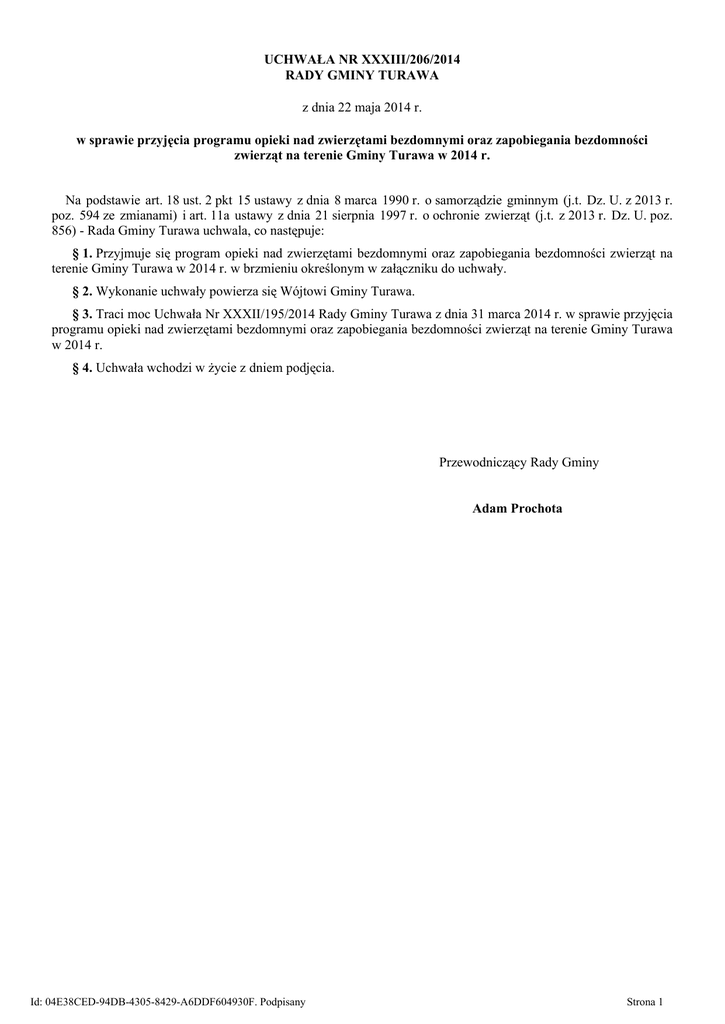UCHWAŁA NR XXXIII/206/2014 RADY GMINY TURAWA z dnia 22 maja 2014 r. w sprawie przyjęcia programu opieki nad zwierzętami bezdomnymi oraz zapobiegania bezdomności zwierząt na terenie Gminy Turawa w 2014 r. Na podstawie art. 18 ust. 2 pkt 15 ustawy z dnia 8 marca 1990 r. o samorządzie gminnym (j.t. Dz. U. z 2013 r. poz. 594 ze zmianami) i art. 11a ustawy z dnia 21 sierpnia 1997 r. o ochronie zwierząt (j.t. z 2013 r. Dz. U. poz. 856) - Rada Gminy Turawa uchwala, co następuje: § 1. Przyjmuje się program opieki nad zwierzętami bezdomnymi oraz zapobiegania bezdomności zwierząt na terenie Gminy Turawa w 2014 r. w brzmieniu określonym w załączniku do uchwały. § 2. Wykonanie uchwały powierza się Wójtowi Gminy Turawa. § 3. Traci moc Uchwała Nr XXXII/195/2014 Rady Gminy Turawa z dnia 31 marca 2014 r. w sprawie przyjęcia programu opieki nad zwierzętami bezdomnymi oraz zapobiegania bezdomności zwierząt na terenie Gminy Turawa w 2014 r. § 4. Uchwała wchodzi w życie z dniem podjęcia. Przewodniczący Rady Gminy Adam Prochota Id: 04E38CED-94DB-4305-8429-A6DDF604930F. Podpisany Strona 1 Załącznik do uchwały Nr XXXIII/206/2014 Rady Gminy Turawa z dnia 22 maja 2014 r. Program opieki nad zwierzętami bezdomnymi oraz zapobiegania bezdomności zwierząt na terenie Gminy Turawa w 2014 r. § 1. Celem Programu jest: 1) zapewnienie opieki nad zwierzętami bezdomnymi oraz zapobieganie bezdomności zwierząt, w szczególności psów i kotów na terenie Gminy Turawa; 2) zmniejszenie populacji bezdomnych zwierząt; 3) zapewnienie bezpieczeństwa mieszkańcom gminy; 4) edukacja mieszkańców w zakresie opieki nad zwierzętami. § 2. Zadania priorytetowe, to: 1) odławianie bezdomnych zwierząt; 2) zapewnienie bezdomnym zwierzętom miejsca w schronisku dla zwierząt; 3) sprawowanie opieki nad kotami wolno żyjącymi, w tym ich dokarmianie; 4) ograniczenie populacji bezdomnych zwierząt poprzez sterylizację i kastrację bezdomnych zwierząt domowych, w szczególności psów i kotów; 5) poszukiwanie nowych właścicieli dla bezdomnych zwierząt; 6) zapewnienie całodobowej opieki weterynaryjnej bezdomnym zwierzętom poszkodowanych w wyniku zdarzeń drogowych; 7) wskazywanie gospodarstwa rolnego w celu zapewnienia miejsca dla zwierząt gospodarskich; 8) usypianie ślepych miotów. § 3. Wykonawcami Programu są: 1) Wójt Gminy Turawa, za pośrednictwem Referatu Gospodarki Nieruchomościami, Ochrony Środowiska i Rolnictwa; 2) organizacje pozarządowe, których celem statutowym jest ochrona zwierząt, współpracujące z Urzędem Gminy Turawa; 3) schronisko dla zwierząt; 4) opiekunowie zwierząt; 5) zakład leczniczy dla zwierząt, z którym Gmina Turawa posiada zawartą stosowną umowę; 6) podmioty działające na zlecenie Wójta Gminy Turawa w zakresie opieki nad bezdomnymi zwierzętami. § 4. 1. Na terenie Gminy Turawa wprowadza się stałe interwencyjne wyłapywanie bezdomnych zwierząt. 2. Wyłapywaniem będą objęte bezdomne zwierzęta pozostawione bez opieki, które uciekły, zabłąkały się lub zostały porzucone przez człowieka, w stosunku do których brak jest możliwości ustalenia ich właściciela, a wszczególności zwierzęta chore lub zagrażające życiu, zdrowiu i bezpieczeństwu ludzi. 3. Zgłoszenia należy kierować do Refaratu Gospodarki Nieruchomościami, Ochrony Środowiska i Rolnictwa Urzędu Gminy Turawa. Numer telefonu jest dostępny na stronie internetowej Urzędu Gminy Turawa: www.turawa.pl. Id: 04E38CED-94DB-4305-8429-A6DDF604930F. Podpisany Strona 1 4. W celu zapewnienia dalszej opieki nad bezdomnymi zwierzętami Gmina Turawa zawarła umowę z Przedsiębiorstwem Usług Produkcyjno-Handlowych-Wielobranżowych "GABI" Gabriela Bartoszek, ul. Dworcowa 24, 47-120 Żędowice, prowadzącym działalność w tym zakresie i posiadającym zezwolenie, na zasadach określonych w art. 7 ust. 1 pkt 3 ustawy z dnia 13 września 1996 r. o utrzymaniu czystości i porządku w gminach (j.t. Dz. U. z 2013 r. poz. 1399). 5. Dane kontaktowe podmiotu, o którym mowa w ust. 4 niniejszego Programu, są podawane do publicznej wiadomości na stronie internetowej Urzędu Gminy Turawa: www.turawa.pl. § 5. Odławianie bezdomnych zwierząt z terenu Gminy Turawa realizuje Przedsiębiorstwo Usług ProdukcyjnoHandlowych-Wielobranżowych "GABI" Gabriela Bartoszek, ul. Dworcowa 24, 47-120 Żędowice, które posiada odpowiednio przeszkolonych przedstawicieli w zakresie odławiania bezdomnych zwierząt, a także odpowiedni sprzęt, materiały oraz zezwolenie, o którym mowa w § 4 ust. 4, działające na podstawie umowy zawartej z Gminą Turawa. § 6. 1. Zapewnienie opieki zwierzętom bezdomnym z terenu Gminy Turawa realizuje Schronisko Fundacji "S.O.S dla Zwierząt" z siedzibą w Chorzowie-Maciejkowicach, poprzez przyjmowanie bezdomnych zwierząt dostarczanych do schroniska przez podmiot, działający na podstawie umowy zawartej z Gminą Turawa w zakresie wyłapywania bezdomnych zwierząt, o którym mowa w § 4 ust. 4. 2. Dla odłowionych zwierząt będzie zabezpieczone miejsce w schronisku, wyżywienie oraz opieka weterynaryjna, zgodnie z obowiązującymi przepisami w tym zakresie. § 7. Opieka nad wolno żyjącymi kotami realizowana jest poprzez: 1) ustalanie miejsc, w których przebywają wolno żyjące koty; 2) powierzenie realizacji dokarmiania ww. zwierząt podmiotom, organizacjom społecznym lub wolontariuszom, z którymi gmina współpracuje w tym zakresie; 3) wspieranie realizacji dokarmiania ww. zwierząt tzw. społecznym opiekunom, którzy zarejestrują się w Urzędzie Gminy Turawa i zadeklarują współpracę w tym zakresie; 4) prowadzenie działań promujących sterylizację i kastrację kotów. § 8. Poszukiwanie właścicieli dla bezdomnych zwierząt realizowane będzie poprzez: 1) prowadzenie działań przez Schronisko dla bezdomnych zwierząt, które to działania będą zmierzały do poszukiwania nowych właścicieli i przekazania do adopcji bezdomnych zwierząt; 2) wsp