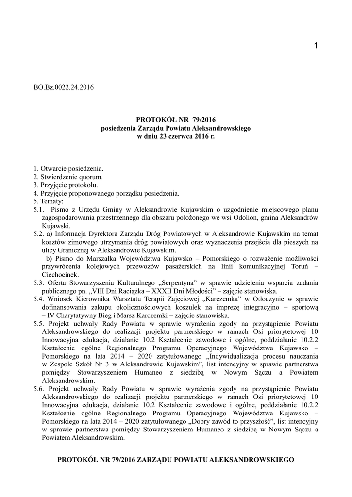 1 BO.Bz.0022.24.2016 PROTOKÓŁ NR 79/2016 posiedzenia Zarządu Powiatu Aleksandrowskiego w dniu 23 czerwca 2016 r. 1. Otwarcie posiedzenia. 2. Stwierdzenie quorum. 3. Przyjęcie protokołu. 4. Przyjęcie proponowanego porządku posiedzenia. 5. Tematy: 5.1. Pismo z Urzędu Gminy w Aleksandrowie Kujawskim o uzgodnienie miejscowego planu zagospodarowania przestrzennego dla obszaru położonego we wsi Odolion, gmina Aleksandrów Kujawski. 5.2. a) Informacja Dyrektora Zarządu Dróg Powiatowych w Aleksandrowie Kujawskim na temat kosztów zimowego utrzymania dróg powiatowych oraz wyznaczenia przejścia dla pieszych na ulicy Granicznej w Aleksandrowie Kujawskim. b) Pismo do Marszałka Województwa Kujawsko – Pomorskiego o rozważenie możliwości przywrócenia kolejowych przewozów pasażerskich na linii komunikacyjnej Toruń – Ciechocinek. 5.3. Oferta Stowarzyszenia Kulturalnego „Serpentyna” w sprawie udzielenia wsparcia zadania publicznego pn. „VIII Dni Raciążka – XXXII Dni Młodości” – zajęcie stanowiska. 5.4. Wniosek Kierownika Warsztatu Terapii Zajęciowej „Karczemka” w Otłoczynie w sprawie dofinansowania zakupu okolicznościowych koszulek na imprezę integracyjno – sportową – IV Charytatywny Bieg i Marsz Karczemki – zajęcie stanowiska. 5.5. Projekt uchwały Rady Powiatu w sprawie wyrażenia zgody na przystąpienie Powiatu Aleksandrowskiego do realizacji projektu partnerskiego w ramach Osi priorytetowej 10 Innowacyjna edukacja, działanie 10.2 Kształcenie zawodowe i ogólne, poddziałanie 10.2.2 Kształcenie ogólne Regionalnego Programu Operacyjnego Województwa Kujawsko – Pomorskiego na lata 2014 – 2020 zatytułowanego „Indywidualizacja procesu nauczania w Zespole Szkół Nr 3 w Aleksandrowie Kujawskim”, list intencyjny w sprawie partnerstwa pomiędzy Stowarzyszeniem Humaneo z siedzibą w Nowym Sączu a Powiatem Aleksandrowskim. 5.6. Projekt uchwały Rady Powiatu w sprawie wyrażenia zgody na przystąpienie Powiatu Aleksandrowskiego do realizacji projektu partnerskiego w ramach Osi priorytetowej 10 Innowacyjna edukacja, działanie 10.2 Kształcenie zawodowe i ogólne, poddziałanie 10.2.2 Kształcenie ogólne Regionalnego Programu Operacyjnego Województwa Kujawsko – Pomorskiego na lata 2014 – 2020 zatytułowanego „Dobry zawód to przyszłość”, list intencyjny w sprawie partnerstwa pomiędzy Stowarzyszeniem Humaneo z siedzibą w Nowym Sączu a Powiatem Aleksandrowskim. PROTOKÓŁ NR 79/2016 ZARZĄDU POWIATU ALEKSANDROWSKIEGO 2 5.7. Projekt uchwały Rady Powiatu w sprawie wyrażenia zgody na przystąpienie Powiatu Aleksandrowskiego do realizacji projektu partnerskiego w ramach Osi priorytetowej 10 Innowacyjna edukacja, działanie 10.2 Kształcenie zawodowe i ogólne, poddziałanie 10.2.3 Kształcenie zawodowe Regionalnego Programu Operacyjnego Województwa Kujawsko – Pomorskiego na lata 2014 – 2020 zatytułowanego „Szkoła zawodowa szansą na przyszłość”, list intencyjny w sprawie partnerstwa pomiędzy Stowarzyszeniem Humaneo z siedzibą w Nowym Sączu a Powiatem Aleksandrowskim. 5.8. Wniosek do Przewodniczącej Rady Powiatu o zwołanie sesji w trybie art. 15 ust. 7 ustawy o samorządzie powiatowym. 6. Sprawy różne. 7. Inne sprawy wniesione przez członków Zarządu Powiatu. 8. Zamknięcie posiedzenia. Ad 1. Pan Dariusz Wochna Starosta Aleksandrowski – otwieram posiedzenie Zarządu Powiatu Aleksandrowskiego. Witam członków Zarządu Powiatu, Wicestarostę pana Wojciecha Marjańskiego, członka Zarządu Powiatu pana Lotfi Mansoura, Skarbnika Powiatu panią Dorotę Sobierajską, Sekretarza Powiatu pana Piotra Marciniaka. Posiedzenie Zarządu Powiatu zostało otwarte o godzinie 10:00. Ad. 2. Pan Dariusz Wochna – stwierdzam quorum. W posiedzeniu uczestniczy trzech członków Zarządu Powiatu. Posiedzenie jest prawomocne i Zarząd może podejmować uchwały. Lista obecności stanowi załącznik do protokołu. Ad 3. Pan Dariusz Wochna – Pan Dariusz Wochna – proponuję przyjąć bez czytania protokół nr 78/2016 posiedzenia Zarządu Powiatu z dnia 16 czerwca 2016r. Czy są uwagi, propozycje zmian, czy uzupełnień do przedłożonego protokołu nr 78/2016 posiedzenia Zarządu Powiatu z dnia 16 czerwca 2016r.? Nie widzę. Proponuję przyjąć go bez czytania. Kto jest za? Dziękuję. Przebieg głosowania: Za – 3, Przeciw – nie było, Wstrzymujących się – nie było. Jednogłośnie. Członkowie Zarządu Powiatu, w wyniku głosowania przyjęli protokół nr 78/2016 posiedzenia Zarządu Powiatu z dnia 16 czerwca 2016r. PROTOKÓŁ NR 79/2016 ZARZĄDU POWIATU ALEKSANDROWSKIEGO 3 Ad 4. Pan Dariusz Wochna – przechodzimy do proponowanego porządku dzisiejszego posiedzenia. Proponuję poszerzyć porządek o punkt: 5.5. Projekt uchwały Rady Powiatu w sprawie wyrażenia zgody na przystąpienie Powiatu Aleksandrowskiego do realizacji projektu partnerskiego w ramach Osi priorytetowej 10 Innowacyjna edukacja, działanie 10.2 Kształcenie zawodowe i ogólne, poddziałanie 10.2.2 Kształcenie ogólne Regionalnego Programu Operacyjnego Województwa Kujawsko – Pomorskiego na lata 2014 – 2020 zatytułowanego „Indywidualizacja procesu nauczania w Zespole Szkół Nr 3 w Aleksandrowie Kujawskim”, list intencyjny w sprawie partnerstwa pomiędzy Stowarzyszeniem Humaneo z siedzibą w Nowym Sączu a Powiatem Aleksandrowskim. 5.6. Projekt uchwały Rady Powiatu w sprawie wyrażenia zgody na przystąpienie Powiatu Aleksandrowskiego do realizacji projektu partnerskiego w ramach Osi priorytetowej 10 Innowacyjna edukacja, działanie 10.2 Kształcenie zawodowe i ogólne, poddziałanie 10.2.2 Kształcenie ogólne Regionalnego Programu Operacyjnego Województwa Kujawsko – Pomorskiego na lata 2014 – 2020 zatytułowanego „Dobry zawód to przyszłość”, list intencyjny w sprawie partnerstwa pomiędzy Stowarzyszeniem Humaneo z siedzibą w Nowym Sączu a Powiatem Aleksandrowskim. 5.7. Projekt uchwały Rady Powiatu w sprawie wyrażenia