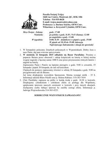 Parafia Świętej Trójcy 1660 rue Centre, Montreal, QC, H3K 1H6 Telefon: 514-935-8628 E-mail: [email protected] Proboszcz: o. Dariusz Szurko, OFM Conv. Wikariusz: o. Krzysztof Cybulski, OFM Conv. Msze Święte - Sobota: Niedziela: W tygodniu: godz. 17:00 po polsku o godz. 8:30 ; 9:45 (Suma); 12:00 po angielsku o godz. 11:00. 8:00; 8:30 – dodatkowo w piątek o godz. 19:00 W piętek od 18:30 do 19:00 Adoracja Najświętszego Sakramentu i okazja do spowiedzi 1. W listopadzie polecamy Zmarłych polecanych w Wypominkach. Dobry Jezu a nasz Panie, daj nam wieczne spoczywanie. 2. W niedzielę 22 listopada 2015 odbędzie się Bazar Parafialny. Prosimy o poparcie Bazaru przez obecność i zakup książeczek na loterię w której można wygrać nagrody o łącznej sumie 1000 $ oraz przez przynoszenie różnych fantów i nagród na loterię. Zapraszamy Panie i Panów na lepienie pierogów o godz. 9:00 w czwartek, 19 listopada i piątek 20 listopada, do sali od kościołem. Chętnych do pomocy zapraszamy również w sobotę 20 listopada o godz. 9:00 na przygotowanie sali do Bazaru. Już teraz dziękujemy wszystkim Sponsorom. Można wynająć stolik – 35 $. Informacji udziela Biuro Parafii oraz p. Helena Rabiasz: 514-363-7654 3. Chór Parafialny zaprasza na próby w każdą środę o godz. 18:30 w kościele. Dziękujemy członkiniom i członkom chóru za posługę dla Wspólnoty, upiększanie śpiewem naszych ceremonii w kościele i przy innych okazjach. Zachęcamy osoby lubiące śpiewać by zasiliły szeregi chóru. Informacje p. Jadwiga Wojciechowska 514-365-4225. SERDECZNIE WSZYSTKICH ZAPRASZAMY!