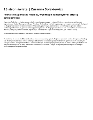 15 stron świata | Zuzanna Solakiewicz Poznajcie Eugeniusza Rudnika, wybitnego kompozytora i artystę dźwiękowego Eugeniusz Rudnik zrewolucjonizował pojęcie muzyki za pomocą pary nożyczek i taśmy magnetofonowej. Członek legendarnego Studia Eksperymentalnego Polskiego Radia odkrył wartość kryjącą się w urwanych, odrzuconych dźwiękach na długo przed nastaniem epoki didżejów. W czasach, gdy muzykę elektroniczną tworzyło się na sprzęcie rodem z naukowego laboratorium, pokazał jak za jej pomocą dotrzeć do drugiego człowieka i o nim opowiedzieć.15 stron świata stanowi próbę usłyszenia wzrokiem jego muzyki, a także próbę odpowiedzi na pytanie, jak pokazać dźwięk. Reżyserka Zuzanna Solakiewicz tak mówiła o swoim pomyśle na film: Podeszliśmy do tworzenia 15 stron świata w niekonwencjonalny sposób. Najpierw powstała ścieżka dźwiękowa. Według niej stworzyliśmy obrazy w filmie. Ta kolejność tworzenia wynikła z inspiracji metaforami i porównaniami wizualnymi samego Rudnika. W jego dziennikach i notatkach dźwięk, muzyka są opisywane jak coś, co można zobaczyć. Słuchacz nie ma jednak dostępu do tej sfery. Natomiast widz filmu już owszem – ogląda naszą interpretację tego sensualnego i uczuciowego postrzegania muzyki.