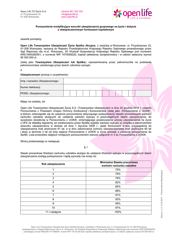 Open Life TU Życie S.A. ul. Przyokopowa 33 01-208 Warszawa infolinia 801 222 333 [email protected] www.openlife.pl Porozumienie modyfikujące warunki ubezpieczenia grupowego na życie i dożycie z ubezpieczeniowym funduszem kapitałowym zawarte pomiędzy: Open Life Towarzystwo Ubezpieczeń Życie Spółka Akcyjna, z siedzibą w Warszawie, ul. Przyokopowa 33, 01-208 Warszawa, wpisaną do Rejestru Przedsiębiorców Krajowego Rejestru Sądowego prowadzonego przez Sąd Rejonowy dla m.st. Warszawy, XII Wydział Gospodarczy Krajowego Rejestru Sądowego pod numerem KRS 0000292551, o numerze NIP 1070008220, kapitał zakładowy zarejestrowany i w całości wpłacony wynosi 95 500 000 zł, (dalej jako Towarzystwo Ubezpieczeń lub Spółka), reprezentowaną przez pełnomocnika na podstawie pełnomocnictwa udzielonego przez dwóch członków zarządu a Ubezpieczonym (proszę o uzupełnienie): Imię i nazwisko Ubezpieczonego: Numer deklaracji: PESEL Ubezpieczonego: Mając na uwadze, że: Open Life Towarzystwo Ubezpieczeń Życie S.A. (Towarzystwo Ubezpieczeń) w dniu 20 grudnia 2016 r. zawarło Porozumienie z Prezesem Urzędu Ochrony Konkurencji i Konsumentów (dalej jako „Porozumienie Z UOKiK”, w którym zobowiązało się do zawarcia porozumienia dotyczącego podwyższenia stawek procentowych wartości rachunku udziałów służących do ustalenia wartości wykupu w poszczególnych latach ubezpieczenia, do wysokości określonej w Porozumieniu z UOKiK, zmieniającego postanowienia umowy ubezpieczenia na życie z UFK ze składką regularną, po zrealizowaniu przez Spółkę wypłaty wartości wykupu w związku z zakończeniem stosunku ubezpieczenia w okresie od dnia 1 stycznia 2008 r., jeżeli Konsument w dniu przystąpienia do ubezpieczenia miał ukończone 61 lat, a w dniu zakończenia ochrony ubezpieczeniowej miał ukończone 65 lat i złoży w terminie 3 lat od dnia wejścia Porozumienia z UOKiK w życie wniosek o zawarcie porozumienia do Spółki. Lista produktów objętych niniejszym porozumieniem stanowi załącznik nr 3 do Porozumienia z UOKiK. Strony postanawiają co następuje: §1 Stawki procentowe Wartości rachunku udziałów służące do ustalania Wartości wykupu w poszczególnych latach ubezpieczenia zostają podwyższone i będą wynosiły nie mniej niż: Minimalna Stawka procentowa wartości rachunku udziałów 1 75% 2 76% 3 79% 4 82% 5 85% 6 88% 7 91% 8 93% 9 95% 10 97% 11 i następne 100% Open Life Towarzystwo Ubezpieczeń Życie Spółka Akcyjna z siedzibą w Warszawie przy ul. Przyokopowej 33, 01-208 Warszawa, zarejestrowana w Sądzie Rejonowym dla m.st. Warszawy, XII Wydział Gospodarczy Krajowego Rejestru Sądowego pod numerem KRS 0000292551, posiadająca numer REGON 141186640 i numer NIP 107-00-08-220, kapitał zakładowy zarejestrowany i w całości wpłacony wynosi 95 500 000 zł. Strona 1 z 2 01/012017 Porozumienie Modyfikujące Rok ubezpieczenia Open Life TU Życie S.A. ul. Przyokopowa 33 01-208 Warszawa infolinia 801 222 333 [email protected] www.openlife.pl 1. W przypadku wystąpienia różnic pomiędzy zmienionymi, a dotychczasowymi warunkami umowy ubezpieczenia, w zakresie stawek procentowych wartości wykupu, zastosowanie będzie miało rozwiązanie korzystniejsze dla Ubezpieczonego. 2. W przypadku zawarcia niniejszego porozumienia, Spółka zwróci Ubezpieczonemu różnicę między wartością wykupu ustaloną i wypłaconą na podstawie dotychczasowych zasad oraz wartością wykupu wynikającą z warunków określonych w niniejszym porozumieniu, w terminie 30 dni od dnia zawarcia porozumienia. 3. Dopłata, o której mowa w ust. 3 nastąpi na numer rachunku bankowego, wskazany przez Ubezpieczonego poniżej: Właściciel rachunku bankowego (imię i nazwisko): §2 1. Pozostałe postanowienia Umowy ubezpieczenia niezmienione na podstawie niniejszego porozumienia pozostają bez zmian. 2. Porozumienie sporządzono w dwóch jednobrzmiących egzemplarzach, po jednym dla każdej ze Stron. imię i nazwisko Ubezpieczonego Strona 2 z 2 01/012017 Porozumienie Modyfikujące Open Life TU Życie S.A. Open Life Towarzystwo Ubezpieczeń Życie Spółka Akcyjna z siedzibą w Warszawie przy ul. Przyokopowej 33, 01-208 Warszawa, zarejestrowana w Sądzie Rejonowym dla m.st. Warszawy, XII Wydział Gospodarczy Krajowego Rejestru Sądowego pod numerem KRS 0000292551, posiadająca numer REGON 141186640 i numer NIP 107-00-08-220, kapitał zakładowy zarejestrowany i w całości wpłacony wynosi 95 500 000 zł.