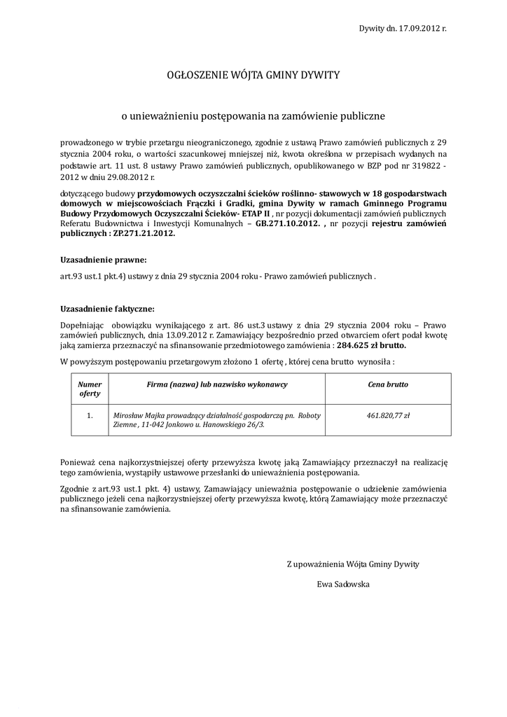 Dywity dn. 17.09.2012 r. OGŁOSZENIE WÓJTA GMINY DYWITY o unieważnieniu postępowania na zamówienie publiczne prowadzonego w trybie przetargu nieograniczonego, zgodnie z ustawą Prawo zamówień publicznych z 29 stycznia 2004 roku, o wartości szacunkowej mniejszej niż, kwota określona w przepisach wydanych na podstawie art. 11 ust. 8 ustawy Prawo zamówień publicznych, opublikowanego w BZP pod nr 319822 2012 w dniu 29.08.2012 r. dotyczącego budowy przydomowych oczyszczalni ścieków roślinno- stawowych w 18 gospodarstwach domowych w miejscowościach Frączki i Gradki, gmina Dywity w ramach Gminnego Programu Budowy Przydomowych Oczyszczalni Ścieków- ETAP II , nr pozycji dokumentacji zamówień publicznych Referatu Budownictwa i Inwestycji Komunalnych – GB.271.10.2012. , nr pozycji rejestru zamówień publicznych : ZP.271.21.2012. Uzasadnienie prawne: art.93 ust.1 pkt.4) ustawy z dnia 29 stycznia 2004 roku - Prawo zamówień publicznych . Uzasadnienie faktyczne: Dopełniając obowiązku wynikającego z art. 86 ust.3 ustawy z dnia 29 stycznia 2004 roku – Prawo zamówień publicznych, dnia 13.09.2012 r. Zamawiający bezpośrednio przed otwarciem ofert podał kwotę jaką zamierza przeznaczyć na sfinansowanie przedmiotowego zamówienia : 284.625 zł brutto. W powyższym postępowaniu przetargowym złożono 1 ofertę , której cena brutto wynosiła : Numer oferty Firma (nazwa) lub nazwisko wykonawcy Cena brutto 1. Mirosław Majka prowadzący działalność gospodarczą pn. Roboty Ziemne , 11-042 Jonkowo u. Hanowskiego 26/3. 461.820,77 zł Ponieważ cena najkorzystniejszej oferty przewyższa kwotę jaką Zamawiający przeznaczył na realizację tego zamówienia, wystąpiły ustawowe przesłanki do unieważnienia postępowania. Zgodnie z art.93 ust.1 pkt. 4) ustawy, Zamawiający unieważnia postępowanie o udzielenie zamówienia publicznego jeżeli cena najkorzystniejszej oferty przewyższa kwotę, którą Zamawiający może przeznaczyć na sfinansowanie zamówienia. Z upoważnienia Wójta Gminy Dywity Ewa Sadowska