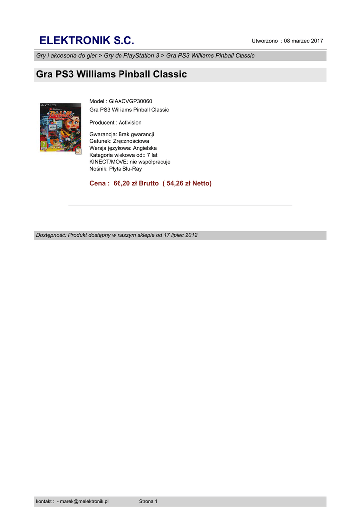ELEKTRONIK S.C. Utworzono : 08 marzec 2017 Gry i akcesoria do gier > Gry do PlayStation 3 > Gra PS3 Williams Pinball Classic Gra PS3 Williams Pinball Classic Model : GIAACVGP30060 Gra PS3 Williams Pinball Classic Producent : Activision Gwarancja: Brak gwarancji Gatunek: Zręcznościowa Wersja językowa: Angielska Kategoria wiekowa od:: 7 lat KINECT/MOVE: nie współpracuje Nośnik: Płyta Blu-Ray Cena : 66,20 zł Brutto ( 54,26 zł Netto) Dostępność: Produkt dostępny w naszym sklepie od 17 lipiec 2012 kontakt : - [email protected] Strona 1