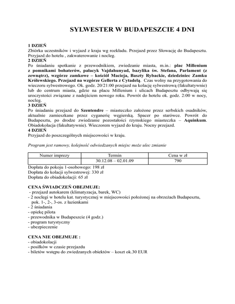 SYLWESTER W BUDAPESZCIE 4 DNI 1 DZIEŃ Zbiórka uczestników i wyjazd z kraju wg rozkładu. Przejazd przez Słowację do Budapesztu. Przyjazd do hotelu , zakwaterowanie i nocleg. 2 DZIEŃ Po śniadaniu spotkanie z przewodnikiem, zwiedzanie miasta, m.in.: plac Millenium z pomnikami bohaterów, pałacyk Vajdahunyad, bazylika św. Stefana, Parlament (z zewnątrz), wzgórze zamkowe – kościół Macieja, Baszty Rybackie, dziedziniec Zamku Królewskiego. Przejazd na wzgórze Gellerta z Cytadelą. Czas wolny na przygotowania do wieczoru sylwestrowego. Ok. godz. 20/21:00 przejazd na kolację sylwestrową (fakultatywnie) lub do centrum miasta, gdzie na placu Millenium i ulicach Budapesztu odbywają się uroczystości związane z nadejściem nowego roku. Powrót do hotelu ok. godz. 2:00 w nocy, nocleg. 3 DZIEŃ Po śniadaniu przejazd do Szentendre – miasteczko założone przez serbskich osadników, aktualnie zamieszkane przez cyganerię węgierską. Spacer po starówce. Powrót do Budapesztu, po drodze zwiedzanie pozostałości rzymskiego miasteczka – Aquinkum. Obiadokolacja (fakultatywnie). Wieczorem wyjazd do kraju. Nocny przejazd. 4 DZIEŃ Przyjazd do poszczególnych miejscowości w kraju. Program jest ramowy, kolejność odwiedzanych miejsc może ulec zmianie Numer imprezy Termin 30.12.08 – 02.01.09 Dopłata do pokoju 1-osobowego: 198 zł Dopłata do kolacji sylwestrowej: 330 zł Dopłata do obiadokolacji: 65 zł Cena w zł 790 CENA ŚWIADCZEŃ OBEJMUJE: - przejazd autokarem (klimatyzacja, barek, WC) - 2 noclegi w hotelu kat. turystycznej w miejscowości położonej na obrzeżach Budapesztu, pok. 1-, 2-, 3-os. z łazienkami - 2 śniadania - opiekę pilota - przewodnika w Budapeszcie (4 godz.) - program turystyczny - ubezpieczenie CENA NIE OBEJMUJE : - obiadokolacji - posiłków w czasie przejazdu - biletów wstępu do zwiedzanych obiektów – koszt ok.30 EUR