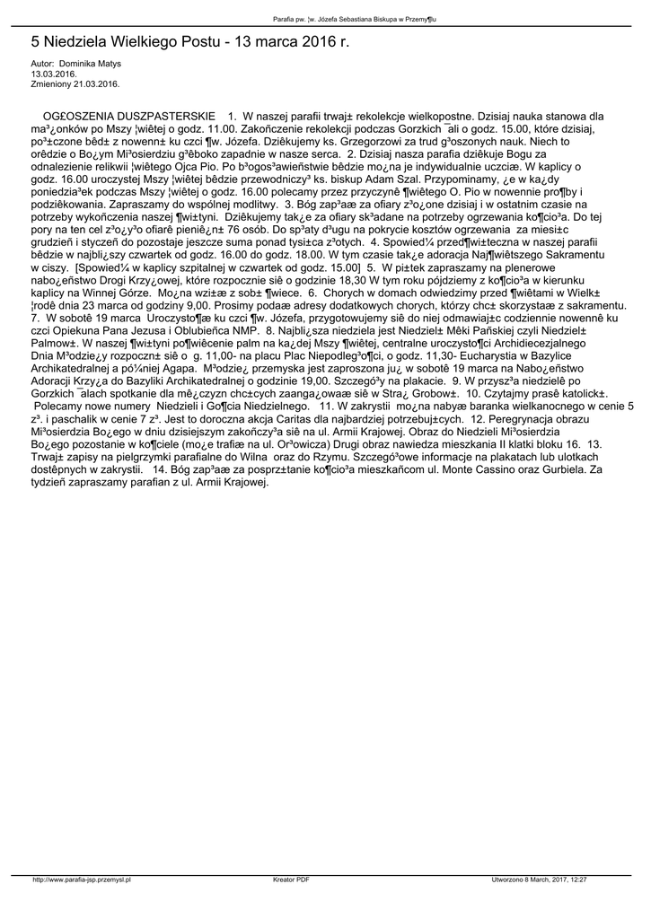 Parafia pw. ¦w. Józefa Sebastiana Biskupa w Przemy¶lu 5 Niedziela Wielkiego Postu - 13 marca 2016 r. Autor: Dominika Matys 13.03.2016. Zmieniony 21.03.2016. OG£OSZENIA DUSZPASTERSKIE 1. W naszej parafii trwaj± rekolekcje wielkopostne. Dzisiaj nauka stanowa dla ma³¿onków po Mszy ¦wiêtej o godz. 11.00. Zakoñczenie rekolekcji podczas Gorzkich ¯ali o godz. 15.00, które dzisiaj, po³±czone bêd± z nowenn± ku czci ¶w. Józefa. Dziêkujemy ks. Grzegorzowi za trud g³oszonych nauk. Niech to orêdzie o Bo¿ym Mi³osierdziu g³êboko zapadnie w nasze serca. 2. Dzisiaj nasza parafia dziêkuje Bogu za odnalezienie relikwii ¦wiêtego Ojca Pio. Po b³ogos³awieñstwie bêdzie mo¿na je indywidualnie uczciæ. W kaplicy o godz. 16.00 uroczystej Mszy ¦wiêtej bêdzie przewodniczy³ ks. biskup Adam Szal. Przypominamy, ¿e w ka¿dy poniedzia³ek podczas Mszy ¦wiêtej o godz. 16.00 polecamy przez przyczynê ¶wiêtego O. Pio w nowennie pro¶by i podziêkowania. Zapraszamy do wspólnej modlitwy. 3. Bóg zap³aæ za ofiary z³o¿one dzisiaj i w ostatnim czasie na potrzeby wykoñczenia naszej ¶wi±tyni. Dziêkujemy tak¿e za ofiary sk³adane na potrzeby ogrzewania ko¶cio³a. Do tej pory na ten cel z³o¿y³o ofiarê pieniê¿n± 76 osób. Do sp³aty d³ugu na pokrycie kosztów ogrzewania za miesi±c grudzieñ i styczeñ do pozostaje jeszcze suma ponad tysi±ca z³otych. 4. Spowied¼ przed¶wi±teczna w naszej parafii bêdzie w najbli¿szy czwartek od godz. 16.00 do godz. 18.00. W tym czasie tak¿e adoracja Naj¶wiêtszego Sakramentu w ciszy. [Spowied¼ w kaplicy szpitalnej w czwartek od godz. 15.00] 5. W pi±tek zapraszamy na plenerowe nabo¿eñstwo Drogi Krzy¿owej, które rozpocznie siê o godzinie 18,30 W tym roku pójdziemy z ko¶cio³a w kierunku kaplicy na Winnej Górze. Mo¿na wzi±æ z sob± ¶wiece. 6. Chorych w domach odwiedzimy przed ¶wiêtami w Wielk± ¦rodê dnia 23 marca od godziny 9,00. Prosimy podaæ adresy dodatkowych chorych, którzy chc± skorzystaæ z sakramentu. 7. W sobotê 19 marca Uroczysto¶æ ku czci ¶w. Józefa, przygotowujemy siê do niej odmawiaj±c codziennie nowennê ku czci Opiekuna Pana Jezusa i Oblubieñca NMP. 8. Najbli¿sza niedziela jest Niedziel± Mêki Pañskiej czyli Niedziel± Palmow±. W naszej ¶wi±tyni po¶wiêcenie palm na ka¿dej Mszy ¶wiêtej, centralne uroczysto¶ci Archidiecezjalnego Dnia M³odzie¿y rozpoczn± siê o g. 11,00- na placu Plac Niepodleg³o¶ci, o godz. 11,30- Eucharystia w Bazylice Archikatedralnej a pó¼niej Agapa. M³odzie¿ przemyska jest zaproszona ju¿ w sobotê 19 marca na Nabo¿eñstwo Adoracji Krzy¿a do Bazyliki Archikatedralnej o godzinie 19,00. Szczegó³y na plakacie. 9. W przysz³a niedzielê po Gorzkich ¯alach spotkanie dla mê¿czyzn chc±cych zaanga¿owaæ siê w Stra¿ Grobow±. 10. Czytajmy prasê katolick±. Polecamy nowe numery Niedzieli i Go¶cia Niedzielnego. 11. W zakrystii mo¿na nabyæ baranka wielkanocnego w cenie 5 z³. i paschalik w cenie 7 z³. Jest to doroczna akcja Caritas dla najbardziej potrzebuj±cych. 12. Peregrynacja obrazu Mi³osierdzia Bo¿ego w dniu dzisiejszym zakoñczy³a siê na ul. Armii Krajowej. Obraz do Niedzieli Mi³osierdzia Bo¿ego pozostanie w ko¶ciele (mo¿e trafiæ na ul. Or³owicza) Drugi obraz nawiedza mieszkania II klatki bloku 16. 13. Trwaj± zapisy na pielgrzymki parafialne do Wilna oraz do Rzymu. Szczegó³owe informacje na plakatach lub ulotkach dostêpnych w zakrystii. 14. Bóg zap³aæ za posprz±tanie ko¶cio³a mieszkañcom ul. Monte Cassino oraz Gurbiela. Za tydzieñ zapraszamy parafian z ul. Armii Krajowej. http://www.parafia-jsp.przemysl.pl Kreator PDF Utworzono 8 March, 2017, 12:27