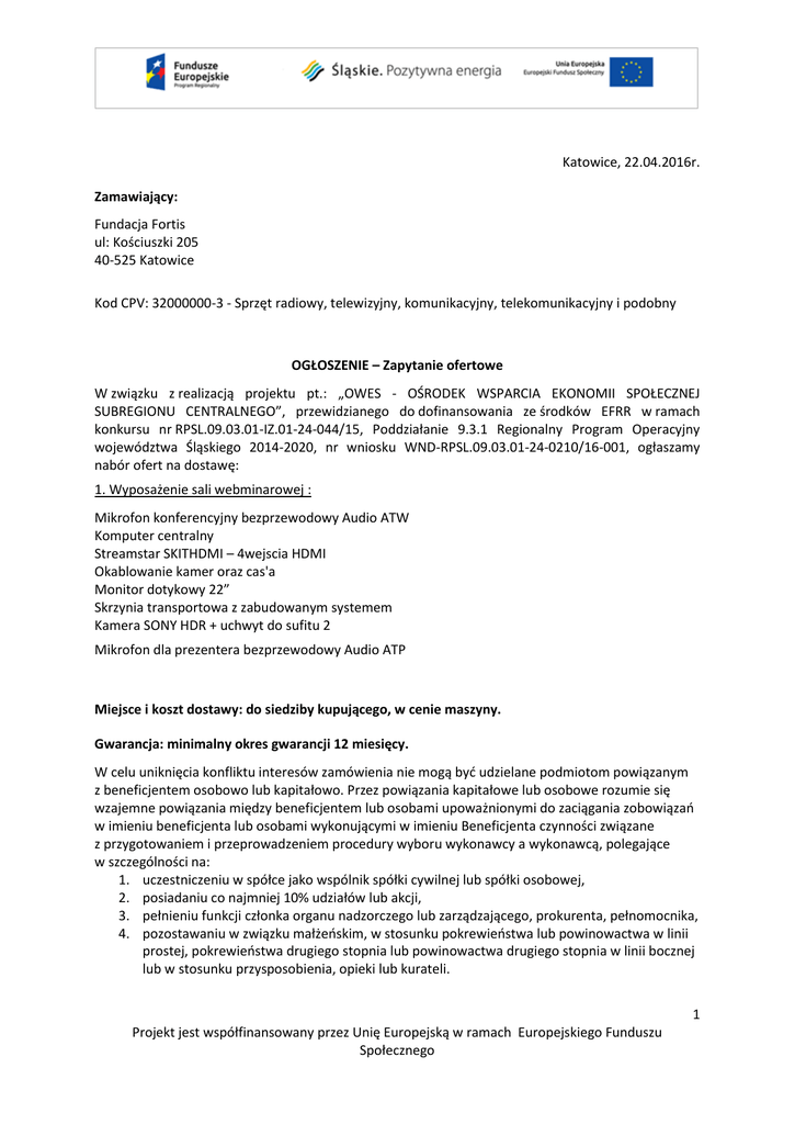 Katowice, 22.04.2016r. Zamawiający: Fundacja Fortis ul: Kościuszki 205 40-525 Katowice Kod CPV: 32000000-3 - Sprzęt radiowy, telewizyjny, komunikacyjny, telekomunikacyjny i podobny OGŁOSZENIE – Zapytanie ofertowe W związku z realizacją projektu pt.: „OWES - OŚRODEK WSPARCIA EKONOMII SPOŁECZNEJ SUBREGIONU CENTRALNEGO”, przewidzianego do dofinansowania ze środków EFRR w ramach konkursu nr RPSL.09.03.01-IZ.01-24-044/15, Poddziałanie 9.3.1 Regionalny Program Operacyjny województwa Śląskiego 2014-2020, nr wniosku WND-RPSL.09.03.01-24-0210/16-001, ogłaszamy nabór ofert na dostawę: 1. Wyposażenie sali webminarowej : Mikrofon konferencyjny bezprzewodowy Audio ATW Komputer centralny Streamstar SKITHDMI – 4wejscia HDMI Okablowanie kamer oraz cas'a Monitor dotykowy 22” Skrzynia transportowa z zabudowanym systemem Kamera SONY HDR + uchwyt do sufitu 2 Mikrofon dla prezentera bezprzewodowy Audio ATP Miejsce i koszt dostawy: do siedziby kupującego, w cenie maszyny. Gwarancja: minimalny okres gwarancji 12 miesięcy. W celu uniknięcia konfliktu interesów zamówienia nie mogą być udzielane podmiotom powiązanym z beneficjentem osobowo lub kapitałowo. Przez powiązania kapitałowe lub osobowe rozumie się wzajemne powiązania między beneficjentem lub osobami upoważnionymi do zaciągania zobowiązań w imieniu beneficjenta lub osobami wykonującymi w imieniu Beneficjenta czynności związane z przygotowaniem i przeprowadzeniem procedury wyboru wykonawcy a wykonawcą, polegające w szczególności na: 1. uczestniczeniu w spółce jako wspólnik spółki cywilnej lub spółki osobowej, 2. posiadaniu co najmniej 10% udziałów lub akcji, 3. pełnieniu funkcji członka organu nadzorczego lub zarządzającego, prokurenta, pełnomocnika, 4. pozostawaniu w związku małżeńskim, w stosunku pokrewieństwa lub powinowactwa w linii prostej, pokrewieństwa drugiego stopnia lub powinowactwa drugiego stopnia w linii bocznej lub w stosunku przysposobienia, opieki lub kurateli. 1 Projekt jest współfinansowany przez Unię Europejską w ramach Europejskiego Funduszu Społecznego OPIS SPOSOBU PRZYGOTOWANIA OFERTY 1. Oferta winna być przygotowana w formie papierowej. 2. Oferta winna zawierać minimum: 1. Nazwę, adres i dane kontaktowe Oferenta, 2. Datę sporządzenia oferty, 3. Cenę całkowitą, 4. Typ, model maszyny, 5. Termin ważności ofert, 6. Warunki i terminy płatności, 7. Warunki i terminy gwarancji. 3. Koszty związane z przygotowaniem oferty ponosi składający ofertę. KRYTERIA WYBORU OFERTY Złożone oferty oceniane będą według kryterium „najniższa cena”. Oferta o najniższej cenie otrzyma maksymalną ilość punktów 100. Pozostałym ofertom przyznana zostanie odpowiednio mniejsza ilość punktów wg wzoru: C = 100 x Cn / Cb, gdzie: Cn – najniższa cena netto, Cb – cena netto oferty badanej. MIEJSCE I TERMIN SKŁADANIA OFERT Podmioty zainteresowane realizacją przedmiotu zamówienia prosimy o składanie ofert w wersji papierowej w siedzibie Zamawiającego lub o przesłanie listownie w terminie do 29 kwietnia 2016 roku, do godziny 15.00. Oferty złożone po dacie i godzinie ostatecznej nie będą brane pod uwagę. OSOBA DO KONTAKTU W SPRAWIE OGŁOSZENIA Łukasz Misztal e-mail: [email protected] Firma zastrzega sobie możliwość wycofania się z chęci zakupu poszczególnych pozycji sprzętowych lub całości inwestycji. 2 Projekt jest współfinansowany przez Unię Europejską w ramach Europejskiego Funduszu Społecznego