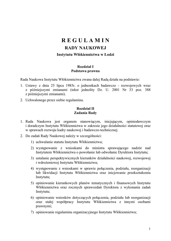 REGULAMIN RADY NAUKOWEJ Instytutu Włókiennictwa w Łodzi Rozdział I Podstawa prawna Rada Naukowa Instytutu Włókiennictwa zwana dalej Radą działa na podstawie: 1. Ustawy z dnia 25 lipca 1985r. o jednostkach badawczo - rozwojowych wraz z późniejszymi zmianami (tekst jednolity Dz. U. 2001 Nr 33 poz. 388 z późniejszymi zmianami). 2. Uchwalonego przez siebie regulaminu. Rozdział II Zadania Rady 1. Rada Naukowa jest organem stanowiącym, inicjującym, opiniodawczym i doradczym Instytutu Włókiennictwa w zakresie jego działalności statutowej oraz w sprawach rozwoju kadry naukowej i badawczo-technicznej. 2. Do zadań Rady Naukowej należy w szczególności: 1) uchwalanie statutu Instytutu Włókiennictwa; 2) występowanie z wnioskami do ministra sprawującego nadzór nad Instytutem Włókiennictwa o powołanie lub odwołanie Dyrektora Instytutu; 3) ustalanie perspektywicznych kierunków działalności naukowej, rozwojowej i wdrożeniowej Instytutu Włókiennictwa; 4) występowanie z wnioskami w sprawie połączenia, podziału, reorganizacji lub likwidacji Instytutu Włókiennictwa oraz inicjowanie przekształcenia Instytutu; 5) opiniowanie kierunkowych planów tematycznych i finansowych Instytutu Włókiennictwa oraz rocznych sprawozdań Dyrektora z wykonania zadań Instytutu; 6) opiniowanie wniosków dotyczących połączenia, podziału lub reorganizacji oraz stałej współpracy Instytutu Włókiennictwa z innymi osobami prawnymi; 7) opiniowanie regulaminu organizacyjnego Instytutu Włókiennictwa; 1 8) opiniowanie kandydatów na funkcje Dyrektora, Zastępców Dyrektora, Głównego Księgowego, Sekretarza Naukowego oraz kierowników komórek organizacyjnych, określonych w regulaminie organizacyjnym; 9) opiniowanie kwalifikacji osób na stanowiska pracowników naukowych i badawczo-technicznych oraz dokonywanie okresowej oceny dorobku naukowego i technicznego tych pracowników; 10) opiniowanie wniosków o przyznanie stypendiów naukowych; 11) opiniowanie wniosków dotyczących przewodów doktorskich i habilitacyjnych. 3. Rada Naukowa jest uprawniona do zajmowania stanowiska we wszystkich sprawach dotyczących działalności Instytutu Włókiennictwa. 4. Rada Naukowa sporządza opinie, o których mowa w pkt 2 ppkt 5-10 w terminie nie dłuższym niż 30 dni. Rozdział III Skład Rady Naukowej 1. Rada Naukowa jest organem kolegialnym. W skład Rady Naukowej Instytutu Włókiennictwa wchodzi 21 osób. 2. Kadencja Rady Naukowej trwa 4 lata. 3. Rada Naukowa wybiera w głosowaniu tajnym, bezwzględną większością głosów obecnych przy udziale 2/3 członków Rady Przewodniczącego, dwóch Zastępców i Sekretarza Rady. 4. Przewodniczącym Rady Naukowej może być tylko osoba posiadająca tytuł naukowy lub stopień naukowy doktora habilitowanego. 5. Przewodniczący Rady Naukowej, jego dwaj Zastępcy oraz Sekretarz stanowią Prezydium Rady Naukowej. Rozdział IV Tryb pracy Rady Naukowej 1. Rada Naukowa działa w oparciu o Regulamin Rady. 2. Regulamin Rady uchwalany jest bezwzględną większością głosów obecnych przy udziale przynajmniej 2/3 członków Rady. 3. Zmiana Regulaminu Rady może nastąpić na podstawie wniosku co najmniej l/3 członków Rady Naukowej. Uchwała podejmowana jest bezwzględną większością głosów obecnych przy udziale co najmniej 2/3 członków Rady Naukowej. 4. Rada Naukowa posiada zdolność do podejmowania uchwał przy obecności 50% +1 członków Rady, tj. 12 osób, w tym Przewodniczącego lub Zastępcy Przewodniczącego za wyjątkiem uchwał w sprawach wymienionych w rozdz. IV pkt. 2, 3 i 6. 2 5. Uchwały Rady Naukowej podejmowane są zwykłą większością głosów w przypadku równej liczby głosów rozstrzyga głos Przewodniczącego za wyjątkiem uchwał w sprawach wymienionych w rozdz. IV pkt. 2, 3 i 6. 6. Uchwały dotyczące wyborów Przewodniczącego Rady, Zastępców i Sekretarza podejmowane są bezwzględną większością głosów obecnych przy udziale co najmniej 2/3 członków Rady. 7. Uchwały Rady Naukowej podejmowane są w głosowaniu jawnym, dopuszcza się głosowanie tajne na wniosek jednego z członków Rady. 8. W sprawach personalnych uchwały podejmowane są w głosowaniu tajnym. 9. Prawo głosu w sprawach, o których mowa w rozdz. II pkt. 2 ppkt 9 i ppkt. 10 posiadają tylko członkowie Rady Naukowej ze stopniem naukowym lub tytułem naukowym. 10. Prawo głosu w sprawach, o których mowa w rozdz. II pkt. 2 ppkt 11 posiadają tylko członkowie Rady Naukowej ze stopniem naukowym doktora habilitowanego lub tytułem naukowym. 11. Uczestnicy obrad Rady Naukowej, nie będący członkami Rady, nie mają prawa do głosowania, a ich wypowiedzi mają charakter opiniodawczy. 12. Posiedzenia Rady Naukowej powinny odbywać się w miarę potrzeb, nie mniej jednak niż cztery razy w roku. 13. Posiedzenia Rady Naukowej zwołuje Przewodniczący lub jeden z jego Zastępców: 1) z własnej inicjatywy, 2) na wniosek Dyrektora Instytutu Włókiennictwa, 3) na wniosek co najmniej l/3 członków Rady. 14. Posiedzeniom Rady Naukowej przewodniczy Przewodniczący Rady Naukowej lub jeden z jego Zastępców. 15. Zawiadomienia o posiedzeniu Rady Naukowej powinny być doręczone wraz z materiałami wszystkim członkom Rady, co najmniej na 7 dni przed datą posiedzenia. 16. W szczególnych przypadkach Rada może być zwołana w trybie pilnym. 17. Członkowie Rady Naukowej zobowiązani są zgłosić Przewodniczącemu Rady lub jego Zastępcy swoją przewidywaną nieobecność na posiedzeniu. 18. W posiedzeniu Rady Naukowej biorą udział: 1) Dyrektor Instytutu Włókiennictwa, 2) przedstawiciele organizacji związkowych (po jednej osobie), 3) zaproszeni goście. 19. Z posiedzeń Rady Naukowej, sporządza się protokoły, które po zatwierdzeniu na najbliższym posiedzeniu Rady, przechowuje Sekretarz Rady Naukowej. 3 20. W uzasadnionych przypadkach dopuszczany jest obiegowy tryb podejmowania uchwał oraz zatwierdzania protokołu z posiedzenia Rady Naukowej. 21