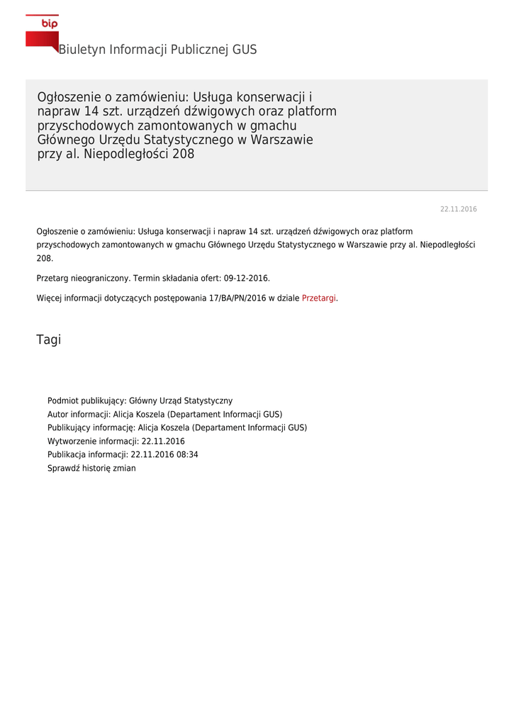 Biuletyn Informacji Publicznej GUS Ogłoszenie o zamówieniu: Usługa konserwacji i napraw 14 szt. urządzeń dźwigowych oraz platform przyschodowych zamontowanych w gmachu Głównego Urzędu Statystycznego w Warszawie przy al. Niepodległości 208 22.11.2016 Ogłoszenie o zamówieniu: Usługa konserwacji i napraw 14 szt. urządzeń dźwigowych oraz platform przyschodowych zamontowanych w gmachu Głównego Urzędu Statystycznego w Warszawie przy al. Niepodległości 208. Przetarg nieograniczony. Termin składania ofert: 09-12-2016. Więcej informacji dotyczących postępowania 17/BA/PN/2016 w dziale Przetargi. Tagi zamówienia publiczne przetarg Podmiot publikujący: Główny Urząd Statystyczny Autor informacji: Alicja Koszela (Departament Informacji GUS) Publikujący informację: Alicja Koszela (Departament Informacji GUS) Wytworzenie informacji: 22.11.2016 Publikacja informacji: 22.11.2016 08:34 Sprawdź historię zmian