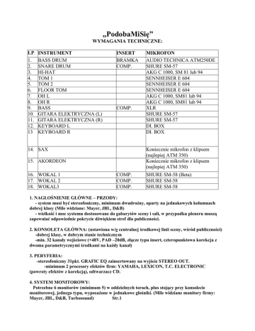 „PodobaMiSię” WYMAGANIA TECHNICZNE: LP. 1. 2. 3. 4. 5. 6. 7. 8. 9. 10. 11. 12. 13 INSTRUMENT BASS DRUM SNARE DRUM HI-HAT TOM 1 TOM 2 FLOOR TOM OH L OH R BASS GITARA ELEKTRYCZNA (L) GITARA ELEKTRYCZNA (R) KEYBOARD L KEYBOARD R INSERT BRAMKA COMP. COMP. 14. SAX Koniecznie mikrofon z klipsem (najlepiej ATM 350) Koniecznie mikrofon z klipsem (najlepiej ATM 350) 15. AKORDEON 16. WOKAL 1 17. WOKAL 2 18. WOKAL3 MIKROFON AUDIO TECHNICA ATM250DE SHURE SM-57 AKG C 1000, SM 81 lub 94 SENNHEISER E 604 SENNHEISER E 604 SENNHEISER E 604 AKG C 1000, SM81 lub 94 AKG C 1000, SM81 lub 94 XLR SHURE SM-57 SHURE SM-57 DI. BOX DI. BOX COMP. COMP. COMP. SHURE SM-58 (Beta) SHURE SM-58 SHURE SM-58 1. NAGŁOŚNIENIE GŁÓWNE – PRZODY: - system musi być stereofoniczny, minimum dwudrożny, oparty na jednakowych kolumnach dobrej klasy (Mile widziane: Mayer, JBL, D&B) - wielkość i moc systemu dostosowane do gabarytów sceny i sali, w przypadku pleneru muszą zapewniać odpowiednie pokrycie dźwiękiem stref dla publiczności. 2. KONSOLETA GŁÓWNA: (ustawiona w/g centralnej środkowej linii sceny, wśród publiczności) -dobrej klasy, w dobrym stanie technicznym -min. 32 kanały wejściowe (+48V, PAD –20dB, złącze typu insert, czteropunktowa korekcja z dwoma parametrycznymi środkami na każdy kanał) 3. PERYFERIA: -stereofoniczny 31pkt. GRAFIC EQ zainsertowany na wyjście STEREO OUT. -minimum 2 procesory efektów firm: YAMAHA, LEXICON, T.C. ELECTRONIC (powroty efektów z korekcją), odtwarzacz CD. 4. SYSTEM MONITOROWY: Potrzebne 6 monitorów (minimum 5) w oddzielnych torach, plus stojący przy konsolecie monitorowej, jednego typu, wyposażone w jednakowe głośniki. (Mile widziane monitory firmy: Mayer, JBL, D&B, Turbosound) Str.1 „PodobaMiSię” PLAN SCENY: Scena zadaszona minimum 8 x 5 metrów, koniecznie podest na perkusję o wymiarach min.3 x 2 metry. Mała scena: FRONT SCENY | | | \/ Str.2 „PodobaMiSię” Duża scena: Koniecznie podest na perkusję o wymiarach min. 3 x 2 metry. FRONT SCENY Co w odsłuchach: 1.Stopa, Gitara Rytmiczna, Wokale(1,2,3); 2. Akordeon, Wokale, Sax, Gitary,Stopa, Klawisze; 3.Gitara Solowa, Stopa, Sax, Klawisze; 4. Hi hat, Sax, Klawisze, Akordeon, Gitary, Wokal 1; 5. Stopa, Gitary, Sax, Klawisze, Akordeon; 6. Do ustalenia; W razie niejasności proszę o kontakt z zespołem (506 034 422 lub 607 824 028) Str.3