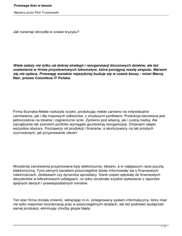Przewaga tkwi w bessie Wpisany przez Piotr Truszkowski Jak rozwinąć skrzydła w czasie kryzysu? Wiele zależy nie tylko od dobrej strategii i reorganizacji kluczowych działów, ale też znalezienia w firmie przysłowiowych lokomotyw, które pociągną resztę zespołu. Marazm się nie opłaca. Przewagę wszakże najszybciej buduje się w czasie bessy - mówi Manoj Nair, prezes Columbus IT Polska. Firma Szynaka-Meble rozłożyła ryzyko, produkując meble zarówno na indywidualne zamówienia, jak i dla masowych odbiorców, z chudszymi portfelami. Produkcja kierowana jest jednocześnie na lokalne i zagraniczne rynki. Zarówno pod własną, jak i cudzą marką. Ale zarządzanie tak szerokim portfolio wymagało gruntownej reorganizacji. Zmianami objęto wszystkie obszary. Począwszy od produkcji i finansów, a skończywszy na tak prostych czynnościach, jak przyjmowanie zleceń. Wcześniej zamówienia przyjmowane były telefonicznie, faksem, a w najlepszym razie pocztą elektroniczną. Tymi samymi kanałami poszczególne działy informowały się o finansowych należnościach, dostawach czy dynamice sprzedaży. Dane często spływały do finansowych decydentów w kilkudniowych odstępach, co tylko utrudniało szybkie wyławianie z raportów spójnych danych i prawdopodobnych trendów. Ten stan firma chciała zmienić, wdrażając m.in. zintegrowany system informatyczny, który miał nie tylko wspomóc koordynację prac w poszczególnych działach, ale też podnieść wydajność samej produkcji, eliminując choćby głupie błędy. 1/5 Przewaga tkwi w bessie Wpisany przez Piotr Truszkowski Wystarczy złożyć zbyt małe zamówienie na materiały, aby wydłużyć czas dostawy konkretnej partii mebli i zrazić do siebie klienta albo przeszacować obliczenia i wypełnić tym samym magazyn niewykorzystanymi półproduktami. I tak źle, i tak niedobrze. Tymczasem system, który wdrożyliśmy, precyzyjnie oblicza nie tylko ilość, ale też aktualną wartość potrzebnych do produkcji materiałów. Trzeba jedynie podać wymiar, np. blatu, a zużycie innych materiałów, jak obrzeży czy okleiny, zostanie automatycznie obliczone i podane na monitorze komputera - mówi Roman Chołaściński, dyrektor finansowy w Szynaka-Meble. Jeśli zaś w magazynie pozostaną nadwyżki (np. klient zrezygnuje z zamówienia w ostatniej chwili), system - po zapamiętaniu ilości i rodzajów niewykorzystanych materiałów - wskazuje linię produkcyjną, gdzie można je powtórnie wykorzystać. Rozwiązanie okazało się praktyczne i efektywne. Firma podjęła niedawno decyzję o objęciu nim kolejnych zakładów w Lubawie i Wałczu. Inwestycji nie zatrzymało nawet widoczne już spowolnienie w polskiej gospodarce. Produkcja spada, eksport też. Menedżerowie, zahipnotyzowani kurczącymi się wykresami, z niepokojem wpatrują się przyszłość, część popada w marazm i rozkłada ręce. Kryzys! Jaki kryzys? 2/5 Przewaga tkwi w bessie Wpisany przez Piotr Truszkowski W październiku produkcja przemysłowa w Polsce wzrosła wszakże zaledwie 0,2 proc. w porównaniu z 6,8 proc. miesiąc wcześniej. W tym samym czasie Centrum Analiz Społeczno-Ekonomicznych obniżyło prognozę wzrostu PKB na przyszły rok z 4,9 proc. na 3,4 proc. Jeszcze mniej dają analitycy z OECD - tylko 3 proc. Ale to teraz właśnie nadchodzi czas próby i reorganizacji. Bo choć gospodarka zwalnia, firmy mogą się dalej rozwijać. Potrzebna jest tylko mądra strategia i dobre narzędzia. Np. sieć salonów Nine West, z galanterią dla kobiet, wprowadziła niedawno elektroniczny podgląd sprzedaży detalicznej oraz stanów w magazynach w czasie rzeczywistym. Dzięki temu firma błyskawicznie reaguje na wahania popytu, przesuwając kolekcje między poszczególnymi salonami. W ten sposób ryzyko zamrożenia cennego kapitału zostało zredukowane do zera. System zautomatyzował ponadto płatności i rozliczanie kosztów, księgowanie oraz weryfikację wszystkich przychodzących i wychodzących dokumentów, np. faktur wystawianych przez dostawców oraz raportów potwierdzających wydanie kolekcji z magazynu do konkretnego salonu. Wcześniejsze rozwiązanie stwarzało pod tym względem ograniczenia. Co prawda dane o sprzedaży detalicznej były automatycznie generowane, ale podgląd aktualnych stanów był już niemożliwy, zarówno z poziomu salonów, jak i centrali. Po integracji nowego systemu ERP z programem obsługującym kasy fiskalne (Point of Sale), menedżerowie są w stanie nie tylko sprawdzić, gdzie i jaka jest aktualna dynamika sprzedaży, ale też w porę zareagować. Wszystkie szczegóły zawarte są w raportach tworzonych kilkoma kliknięciami myszki. Uprawnieni użytkownicy mogą znaleźć w nich nie tylko wyniki zsumowane już na poziomie centrali, ale też dane sprzedażowe konkretnych kolekcji z rozbiciem na poszczególne salony. Równie szczegółowo prezentowane są informacje o zapasach. Podobne udoskonalenia wprowadzono w sieci Royal Collection: Zintegrowany system ERP przesyła do centrali dane o dynamice sprzedaży detalicznej z ponad 30 salonów co 2-4 godziny (wcześniej było to po 1-2 tygodniach), dzięki czemu firma może w czasie rzeczywistym tworzyć, śledzić i planować na poziomie centralnym oraz każdego sklepu zapotrzebowanie i obrót towarami - mówi Łukasz Bielecki, szef działu IT w Royal Collection. 3/5 Przewaga tkwi w bessie Wpisany przez Piotr Truszkowski Reakcja na wahania rynku jest natychmiastowa. Jeśli maleje zainteresowanie kolekcją, można natychmiast skorygować ceny i przekazać towar do tych punktów sieci, gdzie cieszy się większym zainteresowaniem, a w jej miejsce szybciej wprowadzić nową linię. Mniejsze stany magazynowe i większa rotacja towaru to z kolei większa rotacja kapitału i większe zyski wyjaśnia Piotr Szczerbiak, dyrektor konsultingu Columbus IT, odpowiedzialny za wdrożenie systemu ERP w sieci Royal Collection. Ten mechanizm rozumie coraz więcej firm z handlu i dystrybuc