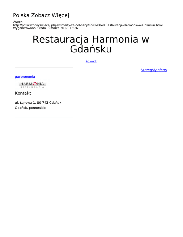 Polska Zobacz Więcej Źródło: http://polskazobaczwiecej.pl/pzw/oferty-za-pol-ceny/r29828840,Restauracja-Harmonia-w-Gdansku.html Wygenerowano: Środa, 8 marca 2017, 13:26 Restauracja Harmonia w Gdańsku Powrót Szczegóły oferty gastronomia Kontakt ul. Łąkowa 1, 80-743 Gdańsk Gdańsk, pomorskie