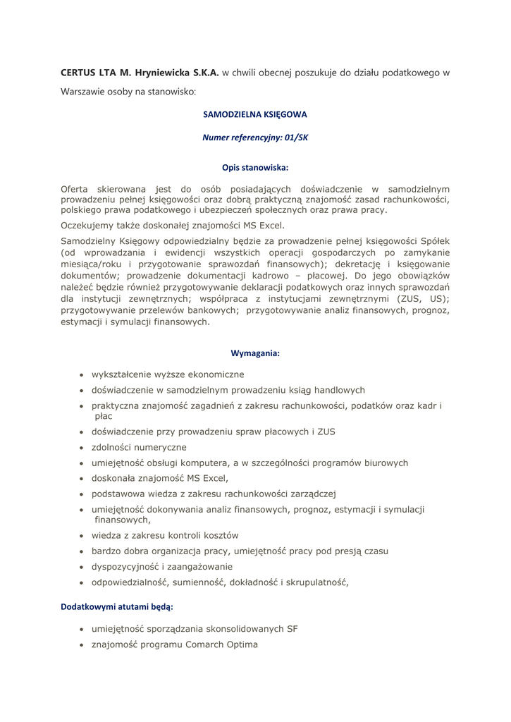 CERTUS LTA M. Hryniewicka S.K.A. w chwili obecnej poszukuje do działu podatkowego w Warszawie osoby na stanowisko: SAMODZIELNA KSIĘGOWA Numer referencyjny: 01/SK Opis stanowiska: Oferta skierowana jest do osób posiadających doświadczenie w samodzielnym prowadzeniu pełnej księgowości oraz dobrą praktyczną znajomość zasad rachunkowości, polskiego prawa podatkowego i ubezpieczeń społecznych oraz prawa pracy. Oczekujemy także doskonałej znajomości MS Excel. Samodzielny Księgowy odpowiedzialny będzie za prowadzenie pełnej księgowości Spółek (od wprowadzania i ewidencji wszystkich operacji gospodarczych po zamykanie miesiąca/roku i przygotowanie sprawozdań finansowych); dekretację i księgowanie dokumentów; prowadzenie dokumentacji kadrowo – płacowej. Do jego obowiązków należeć będzie również przygotowywanie deklaracji podatkowych oraz innych sprawozdań dla instytucji zewnętrznych; współpraca z instytucjami zewnętrznymi (ZUS, US); przygotowywanie przelewów bankowych; przygotowywanie analiz finansowych, prognoz, estymacji i symulacji finansowych. Wymagania: • wykształcenie wyższe ekonomiczne • doświadczenie w samodzielnym prowadzeniu ksiąg handlowych • praktyczna znajomość zagadnień z zakresu rachunkowości, podatków oraz kadr i płac • doświadczenie przy prowadzeniu spraw płacowych i ZUS • zdolności numeryczne • umiejętność obsługi komputera, a w szczególności programów biurowych • doskonała znajomość MS Excel, • podstawowa wiedza z zakresu rachunkowości zarządczej • umiejętność dokonywania analiz finansowych, prognoz, estymacji i symulacji finansowych, • wiedza z zakresu kontroli kosztów • bardzo dobra organizacja pracy, umiejętność pracy pod presją czasu • dyspozycyjność i zaangażowanie • odpowiedzialność, sumienność, dokładność i skrupulatność, Dodatkowymi atutami będą: • umiejętność sporządzania skonsolidowanych SF • znajomość programu Comarch Optima • gotowość do szybkiego podjęcia pracy, • znajomość języków obcych Oferujemy: • Ciekawą pracę w dynamicznie rozwijającej się firmie, • Pracę w zespole młodych ludzi, bez skostniałych i formalistycznych relacji, • stabilne zatrudnienie • miłą atmosferę pracy • możliwości rozwoju zawodowego i awansu • wsparcie zespołu doradców podatkowych w zakresie rozstrzygania budzących szczególne wątpliwości zagadnień związanych ściśle z rozliczeniami podatkowymi oraz prawników w zakresie prawa pracy Forma kontaktu: Osoby zainteresowane ofertą prosimy o wypełnienie formularza na stronie internetowej, bądź przesłanie aplikacji na maila: [email protected] wraz z podaniem nr ref: 01/SK Zainteresowane osoby prosimy o przesyłanie swoich cv wraz z dopiskiem następującej klauzuli: "Wyrażam zgodę na przetwarzanie moich danych osobowych zawartych w ofercie pracy dla potrzeb procesu rekrutacji zgodnie z ustawą z dnia 27.08.1997r. Dz. U. z 2002 r., Nr 101, poz. 923 ze zm."