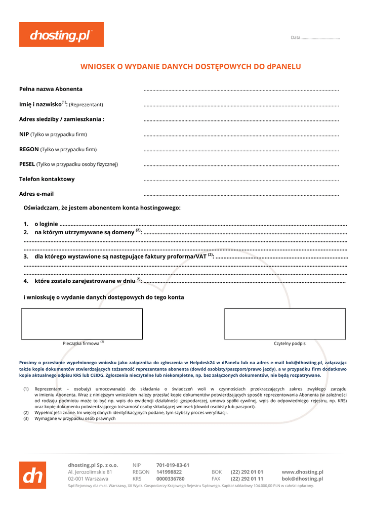 Data………………………..…… WNIOSEK O WYDANIE DANYCH DOSTĘPOWYCH DO dPANELU Pełna nazwa Abonenta (1) …………………………………………………………………………………......................................... Imię i nazwisko : (Reprezentant) …………………………………………………………………………………......................................... Adres siedziby / zamieszkania : …………………………………………………………………………………......................................... NIP (Tylko w przypadku firm) …………………………………………………………………………………......................................... REGON (Tylko w przypadku firm) …………………………………………………………………………………......................................... PESEL (Tylko w przypadku osoby fizycznej) …………………………………………………………………………………......................................... Telefon kontaktowy …………………………………………………………………………………......................................... Adres e-mail …………………………………………………………………………………......................................... Oświadczam, że jestem abonentem konta hostingowego: 1. o loginie ……………………………………………………………………………………………………………………………………………………………..... (2) 2. na którym utrzymywane są domeny : ………………………………………………………………………………………………………………… ……………………………………………………………………………………………………………………………………………………………………………………. ……………………………………………………………………………………………………………………………………………………………………………………. (2) 3. dla którego wystawione są następujące faktury proforma/VAT : ………………………………………………………………………… ……………………………………………………………………………………………………………………………………………………………………………………. ……………………………………………………………………………………………………………………………………………………………………………………. 2) 4. które zostało zarejestrowane w dniu : …………………………………………………………………………………………………………..…… i wnioskuję o wydanie danych dostępowych do tego konta Pieczątka firmowa (3) Czytelny podpis Prosimy o przesłanie wypełnionego wniosku jako załącznika do zgłoszenia w Helpdesk24 w dPanelu lub na adres e-mail [email protected], załączając także kopie dokumentów stwierdzających tożsamość reprezentanta abonenta (dowód osobisty/paszport/prawo jazdy), a w przypadku firm dodatkowo kopie aktualnego odpisu KRS lub CEIDG. Zgłoszenia nieczytelne lub niekompletne, np. bez załączonych dokumentów, nie będą rozpatrywane. (1) (2) (3) Reprezentant – osoba(y) umocowana(e) do składania o świadczeń woli w czynnościach przekraczających zakres zwykłego zarządu w imieniu Abonenta. Wraz z niniejszym wnioskiem należy przesłać kopie dokumentów potwierdzających sposób reprezentowania Abonenta (w zależności od rodzaju podmiotu może to być np. wpis do ewidencji działalności gospodarczej, umowa spółki cywilnej, wpis do odpowiedniego rejestru, np. KRS) oraz kopię dokumentu potwierdzającego tożsamość osoby składającej wniosek (dowód osobisty lub paszport). Wypełnić jeśli znane. Im więcej danych identyfikacyjnych podane, tym szybszy proces weryfikacji. Wymagane w przypadku osób prawnych dhosting.pl Sp. z o.o. Al. Jerozolimskie 81 02-001 Warszawa NIP REGON KRS 701-019-83-61 141998822 0000336780 BOK FAX (22) 292 01 01 (22) 292 01 11 www.dhosting.pl [email protected] Sąd Rejonowy dla m.st. Warszawy, XII Wydz. Gospodarczy Krajowego Rejestru Sądowego. Kapitał zakładowy 104.000,00 PLN w całości opłacony.