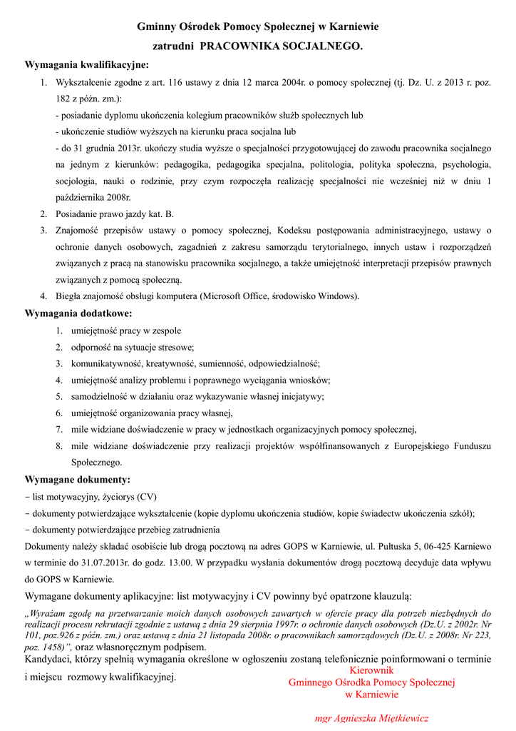 Gminny Ośrodek Pomocy Społecznej w Karniewie zatrudni PRACOWNIKA SOCJALNEGO. Wymagania kwalifikacyjne: 1. Wykształcenie zgodne z art. 116 ustawy z dnia 12 marca 2004r. o pomocy społecznej (tj. Dz. U. z 2013 r. poz. 182 z późn. zm.): - posiadanie dyplomu ukończenia kolegium pracowników służb społecznych lub - ukończenie studiów wyższych na kierunku praca socjalna lub - do 31 grudnia 2013r. ukończy studia wyższe o specjalności przygotowującej do zawodu pracownika socjalnego na jednym z kierunków: pedagogika, pedagogika specjalna, politologia, polityka społeczna, psychologia, socjologia, nauki o rodzinie, przy czym rozpoczęła realizację specjalności nie wcześniej niż w dniu 1 października 2008r. 2. Posiadanie prawo jazdy kat. B. 3. Znajomość przepisów ustawy o pomocy społecznej, Kodeksu postępowania administracyjnego, ustawy o ochronie danych osobowych, zagadnień z zakresu samorządu terytorialnego, innych ustaw i rozporządzeń związanych z pracą na stanowisku pracownika socjalnego, a także umiejętność interpretacji przepisów prawnych związanych z pomocą społeczną. 4. Biegła znajomość obsługi komputera (Microsoft Office, środowisko Windows). Wymagania dodatkowe: 1. umiejętność pracy w zespole 2. odporność na sytuacje stresowe; 3. komunikatywność, kreatywność, sumienność, odpowiedzialność; 4. umiejętność analizy problemu i poprawnego wyciągania wniosków; 5. samodzielność w działaniu oraz wykazywanie własnej inicjatywy; 6. umiejętność organizowania pracy własnej, 7. mile widziane doświadczenie w pracy w jednostkach organizacyjnych pomocy społecznej, 8. mile widziane doświadczenie przy realizacji projektów współfinansowanych z Europejskiego Funduszu Społecznego. Wymagane dokumenty: - list motywacyjny, życiorys (CV) - dokumenty potwierdzające wykształcenie (kopie dyplomu ukończenia studiów, kopie świadectw ukończenia szkół); - dokumenty potwierdzające przebieg zatrudnienia Dokumenty należy składać osobiście lub drogą pocztową na adres GOPS w Karniewie, ul. Pułtuska 5, 06-425 Karniewo w terminie do 31.07.2013r. do godz. 13.00. W przypadku wysłania dokumentów drogą pocztową decyduje data wpływu do GOPS w Karniewie. Wymagane dokumenty aplikacyjne: list motywacyjny i CV powinny być opatrzone klauzulą: „Wyrażam zgodę na przetwarzanie moich danych osobowych zawartych w ofercie pracy dla potrzeb niezbędnych do realizacji procesu rekrutacji zgodnie z ustawą z dnia 29 sierpnia 1997r. o ochronie danych osobowych (Dz.U. z 2002r. Nr 101, poz.926 z późn. zm.) oraz ustawą z dnia 21 listopada 2008r. o pracownikach samorządowych (Dz.U. z 2008r. Nr 223, poz. 1458)”, oraz własnoręcznym podpisem. Kandydaci, którzy spełnią wymagania określone w ogłoszeniu zostaną telefonicznie poinformowani o terminie Kierownik i miejscu rozmowy kwalifikacyjnej. Gminnego Ośrodka Pomocy Społecznej w Karniewie mgr Agnieszka Miętkiewicz