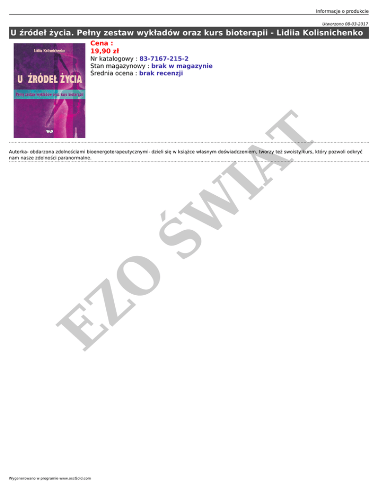 Informacje o produkcie Utworzono 08-03-2017 U źródeł życia. Pełny zestaw wykładów oraz kurs bioterapii - Lidiia Kolisnichenko Cena : 19,90 zł IA T Nr katalogowy : 83-7167-215-2 Stan magazynowy : brak w magazynie Średnia ocena : brak recenzji EZ O ŚW Autorka- obdarzona zdolnościami bioenergoterapeutycznymi- dzieli się w książce własnym doświadczeniem, tworzy też swoisty kurs, który pozwoli odkryć nam nasze zdolności paranormalne. Wygenerowano w programie www.oscGold.com
