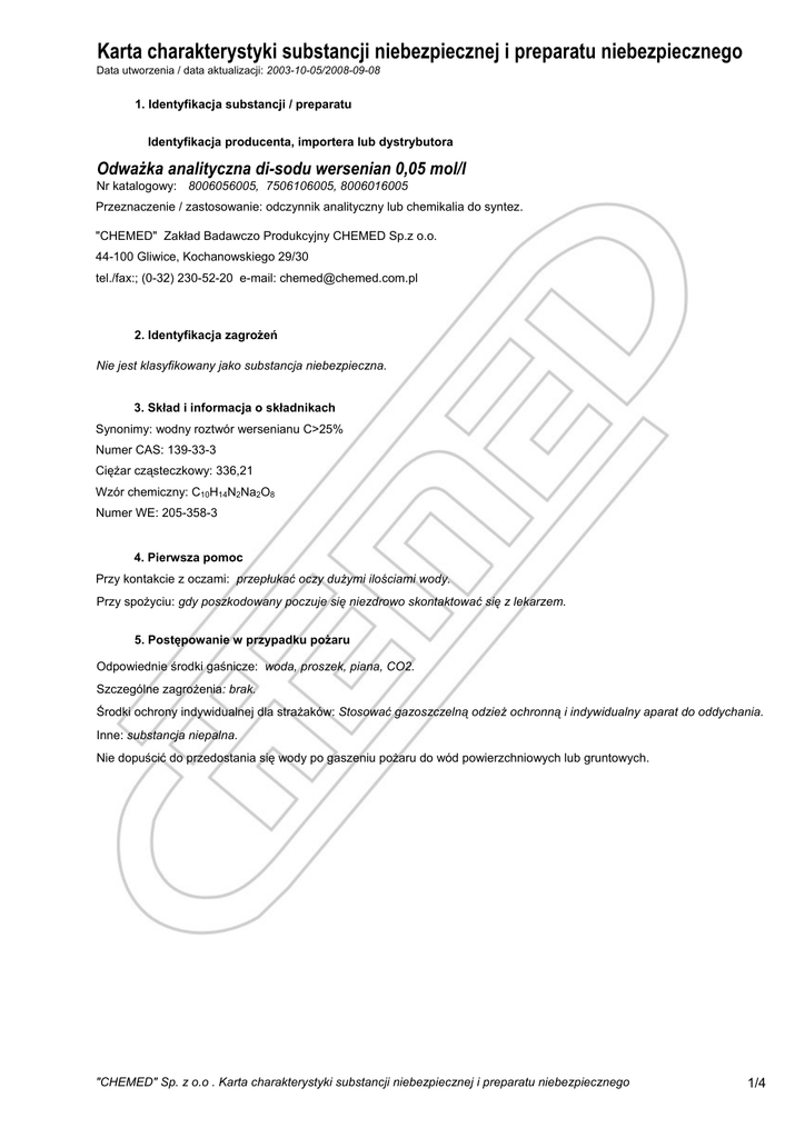 Karta charakterystyki substancji niebezpiecznej i preparatu niebezpiecznego Data utworzenia / data aktualizacji: 2003-10-05/2008-09-08 1. Identyfikacja substancji / preparatu Identyfikacja producenta, importera lub dystrybutora Odważka analityczna di-sodu wersenian 0,05 mol/l Nr katalogowy: 8006056005, 7506106005, 8006016005 Przeznaczenie / zastosowanie: odczynnik analityczny lub chemikalia do syntez. "CHEMED" Zakład Badawczo Produkcyjny CHEMED Sp.z o.o. 44-100 Gliwice, Kochanowskiego 29/30 tel./fax:; (0-32) 230-52-20 e-mail: [email protected] 2. Identyfikacja zagrożeń Nie jest klasyfikowany jako substancja niebezpieczna. 3. Skład i informacja o składnikach Synonimy: wodny roztwór wersenianu C>25% Numer CAS: 139-33-3 Ciężar cząsteczkowy: 336,21 Wzór chemiczny: C10H14N2Na2O8 Numer WE: 205-358-3 4. Pierwsza pomoc Przy kontakcie z oczami: przepłukać oczy dużymi ilościami wody. Przy spożyciu: gdy poszkodowany poczuje się niezdrowo skontaktować się z lekarzem. 5. Postępowanie w przypadku pożaru Odpowiednie środki gaśnicze: woda, proszek, piana, CO2. Szczególne zagrożenia: brak. Środki ochrony indywidualnej dla strażaków: Stosować gazoszczelną odzież ochronną i indywidualny aparat do oddychania. Inne: substancja niepalna. Nie dopuścić do przedostania się wody po gaszeniu pożaru do wód powierzchniowych lub gruntowych. "CHEMED" Sp. z o.o . Karta charakterystyki substancji niebezpiecznej i preparatu niebezpiecznego 1/4 Odważka analityczna di-sodu wersenian 0,05 mol/l 6. Postępowanie w przypadku niezamierzonego uwolnienia do środowiska Zebrać przy pomocy substancji absorbującej ciecze, przekazać do likwidacji. Oczyścić zanieczyszczony teren. Nie dopuścić do dostania się do wód, ścieków i gleby. Nie dopuścić do dostania się do kanalizacji. Unikać kontaktu z substancją. 7. Postępowanie z substancją / preparatem i jej / jego magazynowanie Obchodzenie się z substancją: Zapewnić skuteczną wymianę powietrza (wentylacja). Postępować zgodnie z zasadami dobrej praktyki przemysłowej oraz ogólnymi zasadami bezpieczeństwa i higieny pracy z substancjami chemicznymi. Stosować środki ochrony osobistej zgodnie z pkt.8. Nie opróżniać do kanalizacji. Magazynowanie: szczelne opakowania, suche pomieszczenie, temperatura pokojowa (wskazane od+15 do +25 °C). 8. Kontrola narażenia i środki ochrony indywidualnej Parametry kontroli (NDS, NDSCh, NDSP): nie ustalone Stosować odpowiednią wentylację wywiewną, miejscową i ogólną zapewniającą utrzymanie stężenia produktu w powietrzu poniżej określonych limitów (minimum 10-krotna wymiana powietrza na godzinę). Zaleca się wyposażenie miejsca pracy w wodny natrysk do płukania oczu oraz prysznic. Środki ochrony indywidualnej powinny być tak zaprojektowane i wykonane aby wykluczały zagrożenie i inne niedogodności w przewidywanych warunkach użytkowania, chroniące przed chemikaliami. Dz. U. nr 217, Rozporządzenie z dnia 29 listopada 2002 (poz. 1833); Dz. U. nr 80, Rozporządzenie z dnia 31 marca 2003 (poz. 725), Dz. U. nr212(poz. 1769), Rozporządzenie Ministra Gospodarki i Pracy z dnia 10 października 2005 Środki ochrony indywidualnej: ochrona dróg oddechowych: konieczna gdy występuje pylenie - respirator ochrona oczu: konieczna – okulary typu gogle ochrona rąk: konieczna – rękawice ochronne, chroniące przed chemikaliami (znak CE) ochrona ciała: konieczna- ubranie ochronne środki ochronne i higieny: wymyć ręce i twarz po pracy z tą substancją. 9. Własności fizykochemiczne Forma: ciecz lepkość dynamiczna: Kolor: bezbarwna lepkość kinematyczna: Zapach: bez zapachu Ciśnienie par: brak danych pH: 4-5 (50 g/l, 20 °C) Gęstość: ~1 g/cm3 (20°C) Temperatura topnienia: brak danych Ciężar nasypowy: nie dotyczy Temperatura wrzenia: brak danych Rozpuszczalność: Temperatura samozapłonu: nie dotyczy w wodzie: rozpuszczalny Temperatura zapłonu: nie dotyczy w rozpuszczalnikach organicznych: brak danych Granice wybuchowości: nie dotyczy log P(w/o): dolna: górna: "CHEMED" Sp. z o.o . Karta charakterystyki substancji niebezpiecznej i preparatu niebezpiecznego 2/4 Odważka analityczna di-sodu wersenian 0,05 mol/l 10. Stabilność i reaktywność Warunki których należy unikać: brak. Materiały których należy unikać: brak. Niebezpieczne produkty rozkładu: brak. Następne dane: brak. 11. Informacje toksykologiczne Informacje toksykologiczne: LD50 (doustnie, szczur): 2000 mg/kg dla czystej substancji.. Pozostałe dane: działa szkodliwie w przypadku spożycia: powolna resorpcja, możliwość zaburzenia gospodarki elektrolitami. Przy stosowaniu należy zachować właściwą dla chemikalia ostrożność. 12. Informacje ekologiczne Nie dopuścić do dostania się do ujęć wody pitnej, gleby i ścieków. 13. Postępowanie z odpadami ZBP CHEMED przyjmuje do likwidacji substancje i opakowania po tych substancjach zakupione w ZBP CHEMED. Utylizacją odpadów powinny zająć się wyspecjalizowane firmy. Opakowanie jednorazowego ubytku traktować jak odpad i przekazać odbiorcy odpadów. Sposób likwidacji zebranych odpadów uzgodnić z właściwym terenowo wydziałem ochrony środowiska. Ustawy z dnia 27.04.2001 (Dz. U. nr 62, poz. 628), z dnia 11.05.2001 (Dz. U. nr 63 poz. 638)z poźn. zm. Rozporządzenie z dnia 27.09.2001 (Dz. U. nr 112, poz. 1206) 14. Informacje o transporcie Klasa ADR i grupa pakowania: nie jest przedmiotem przepisów transportowych Numer UN: nie dotyczy Nazwa materiału (wg UN): nie dotyczy "CHEMED" Sp. z o.o . Karta charakterystyki substancji niebezpiecznej i preparatu niebezpiecznego 3/4 Odważka analityczna di-sodu wersenian 0,05 mol/l 15. Informacje dotyczące przepisów prawnych Symbol i oznaczenie zagrożenia produktu: nie dotyczy. R: nie dotyczy. S: nie dotyczy. Oznakowanie WE. Dz. U. nr 171, Rozporządzenie z dnia 2 września 2003 (poz. 1666), Dz. U. nr 169, Obwieszczenie z dnia 28 sierpnia 2003 (poz. 1650), Dz. U. nr 173, Rozporządzenie z d